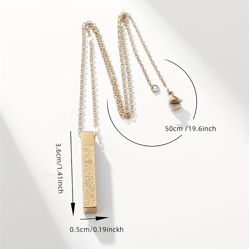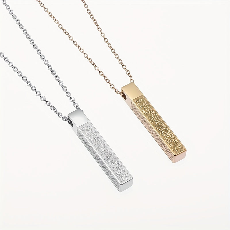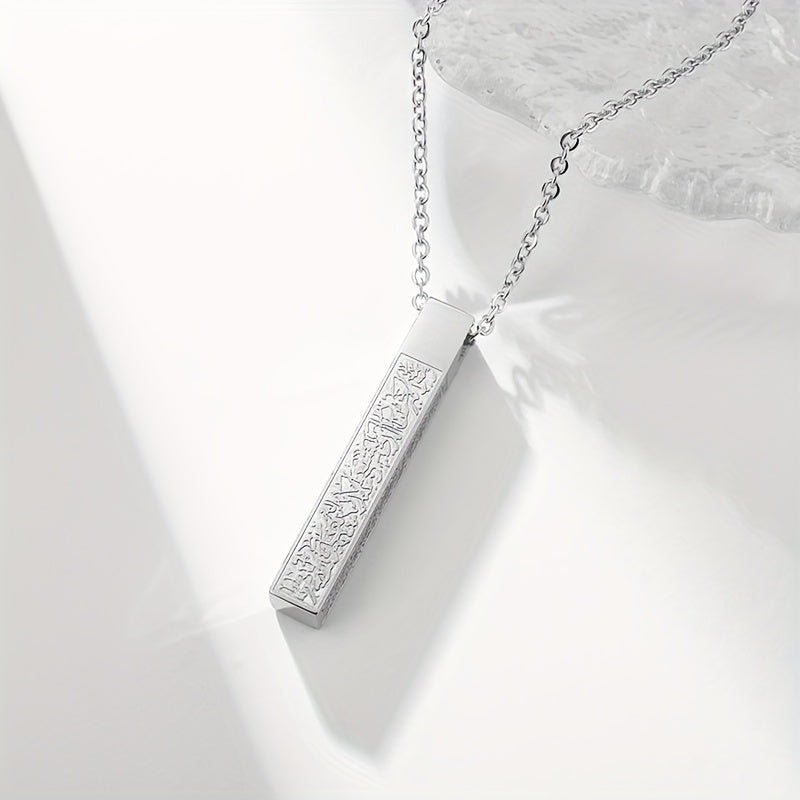 This stainless steel cube pendant features an Islamic engraved verse, making it a meaningful gift for Muslims. Ideal for holiday parties or as a decorative accessory.