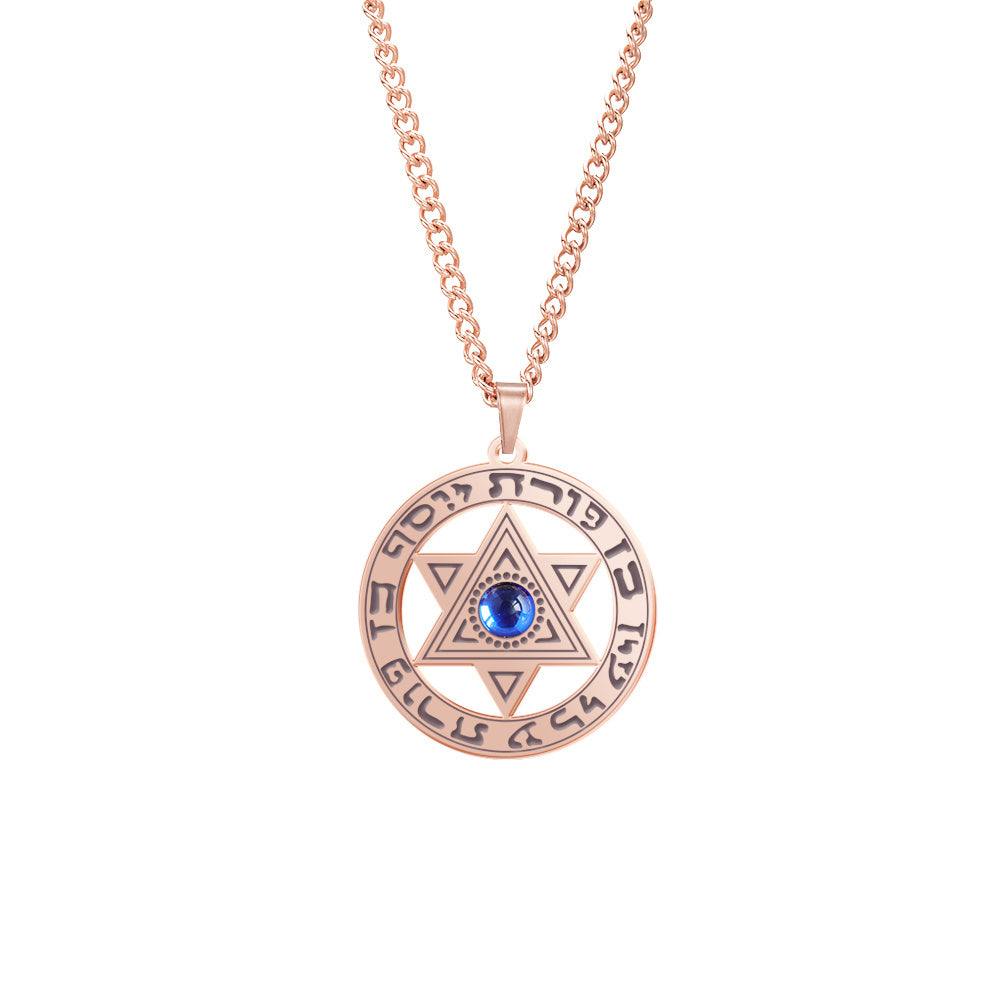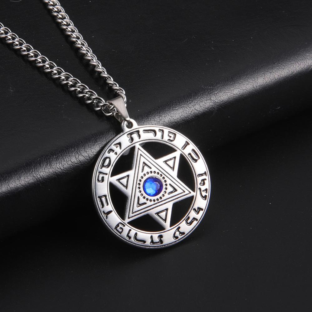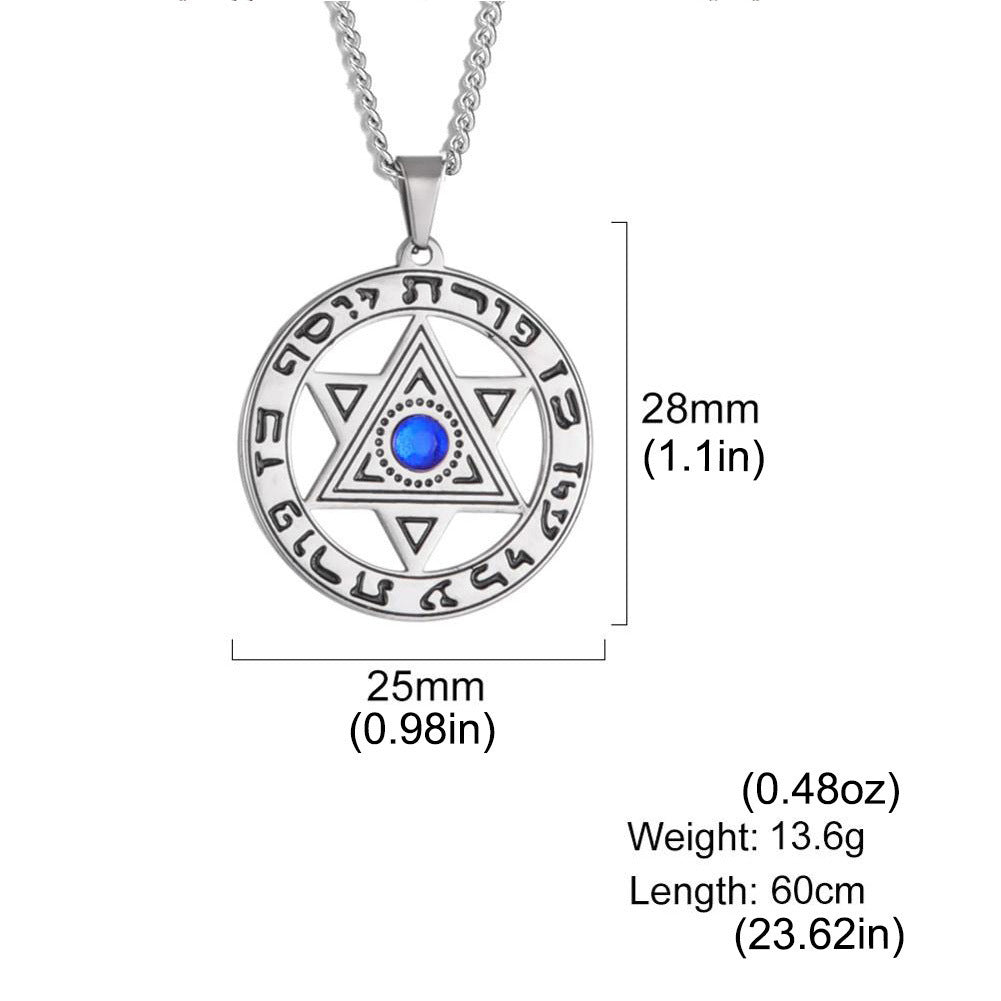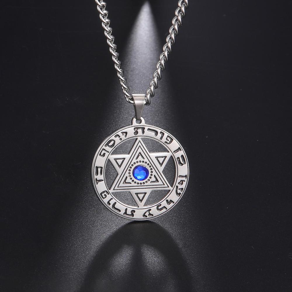 This stainless steel pendant necklace features the Star of David symbol with a crystal center. The design is a meaningful Hebrew talisman amulet.