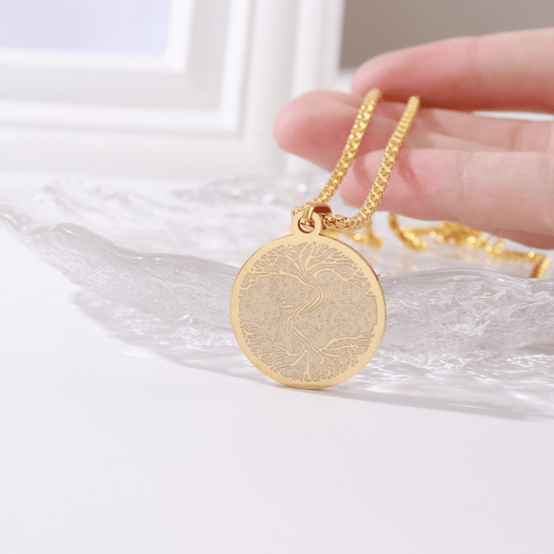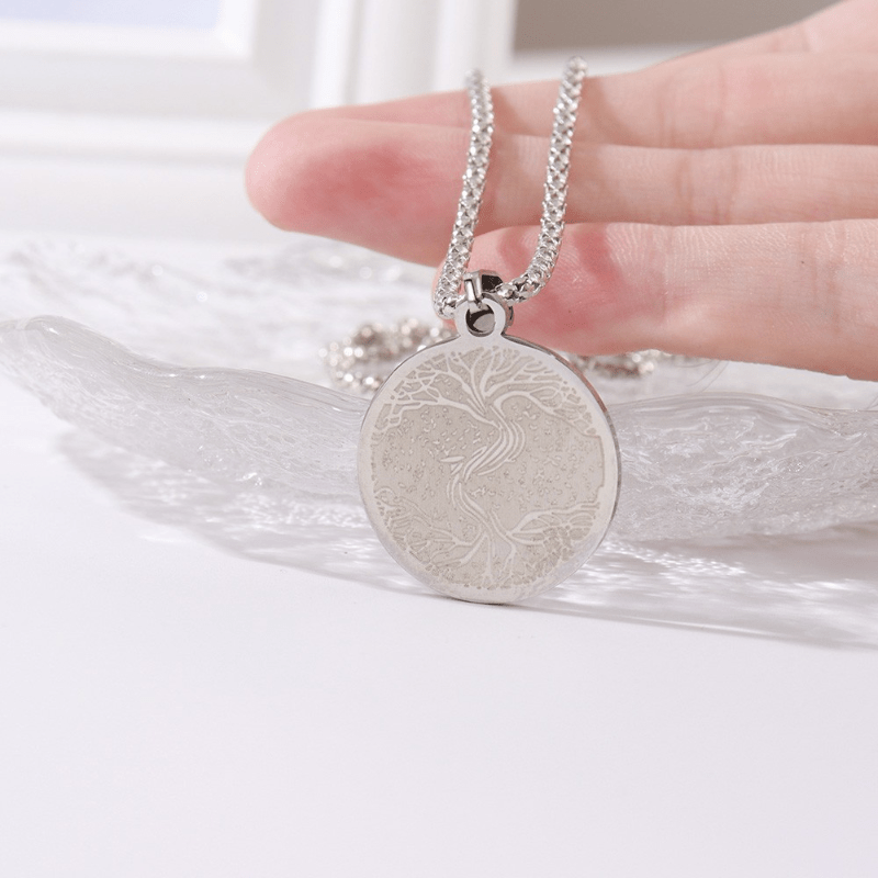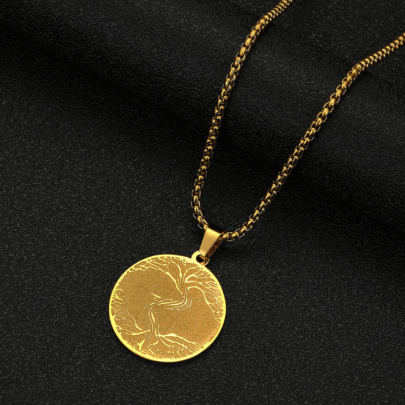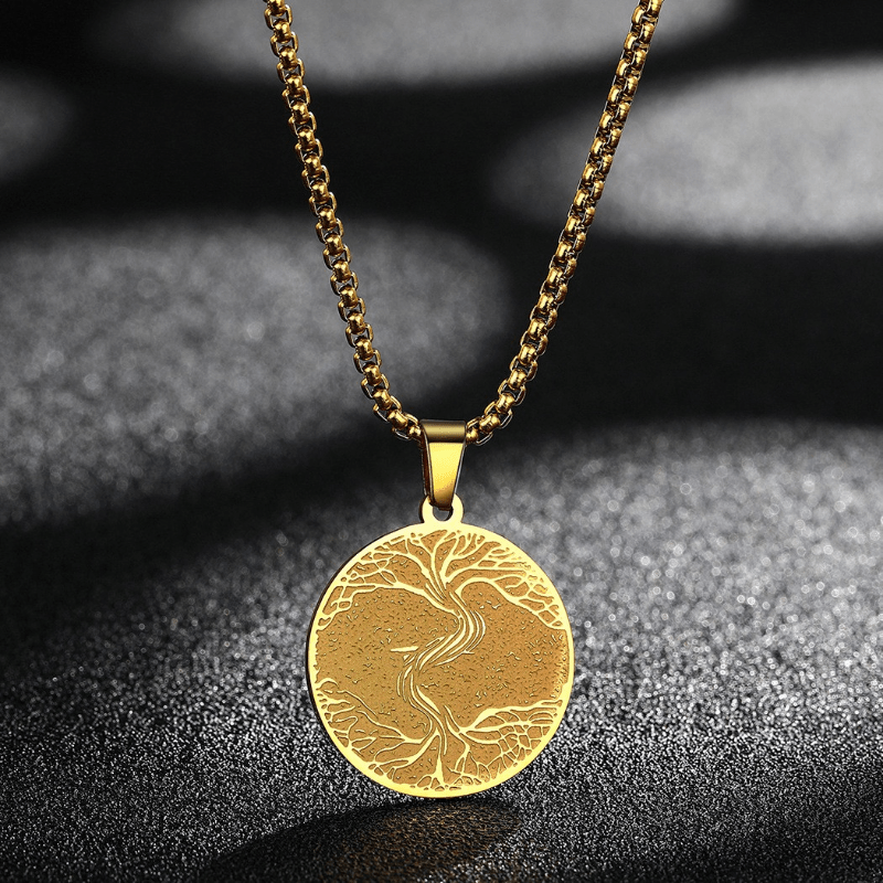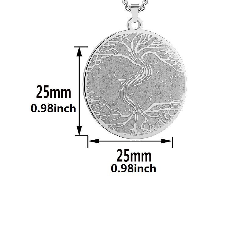 This pendant necklace features a stainless steel Viking Rune design with a Tree of Life symbol. It is a stylish accessory for men.