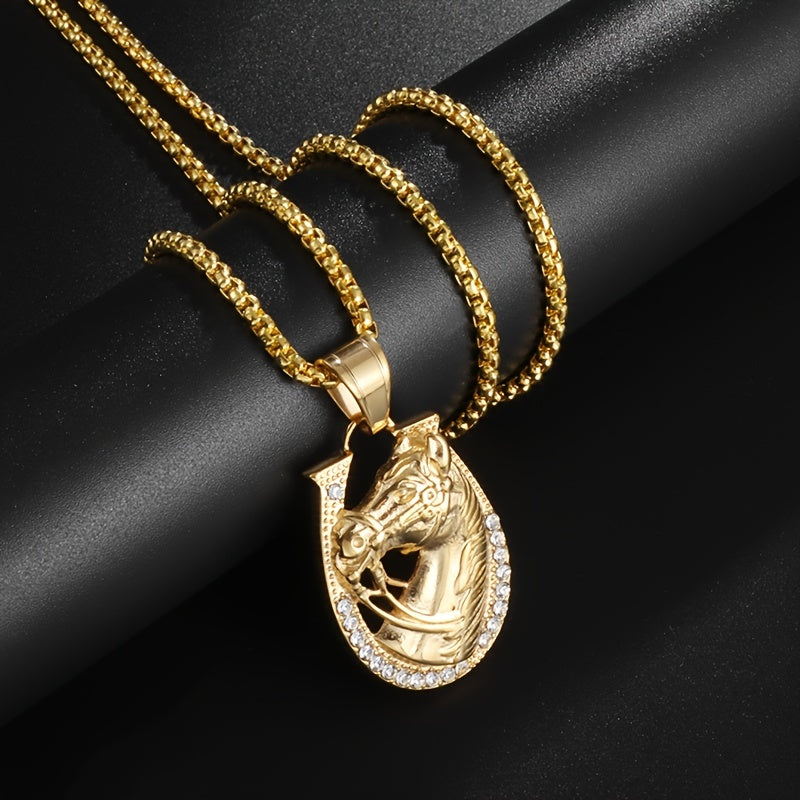 Zircon Horse Head Horseshoe Pendant Necklace Men&