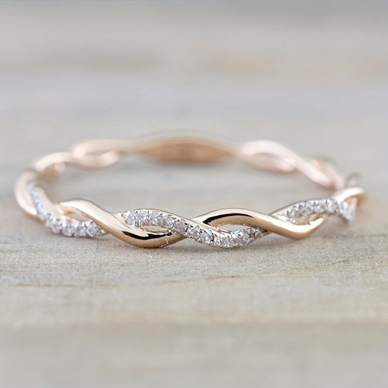 This stunning ring features artificial diamonds encrusted in a twist design, perfect for adding a touch of elegance to any outfit. Available in silver, golden, or rose golden plating.