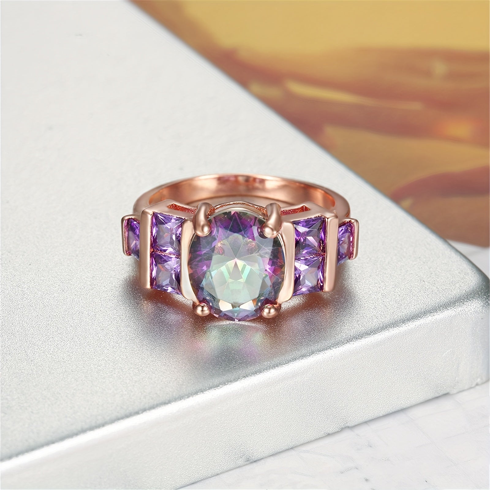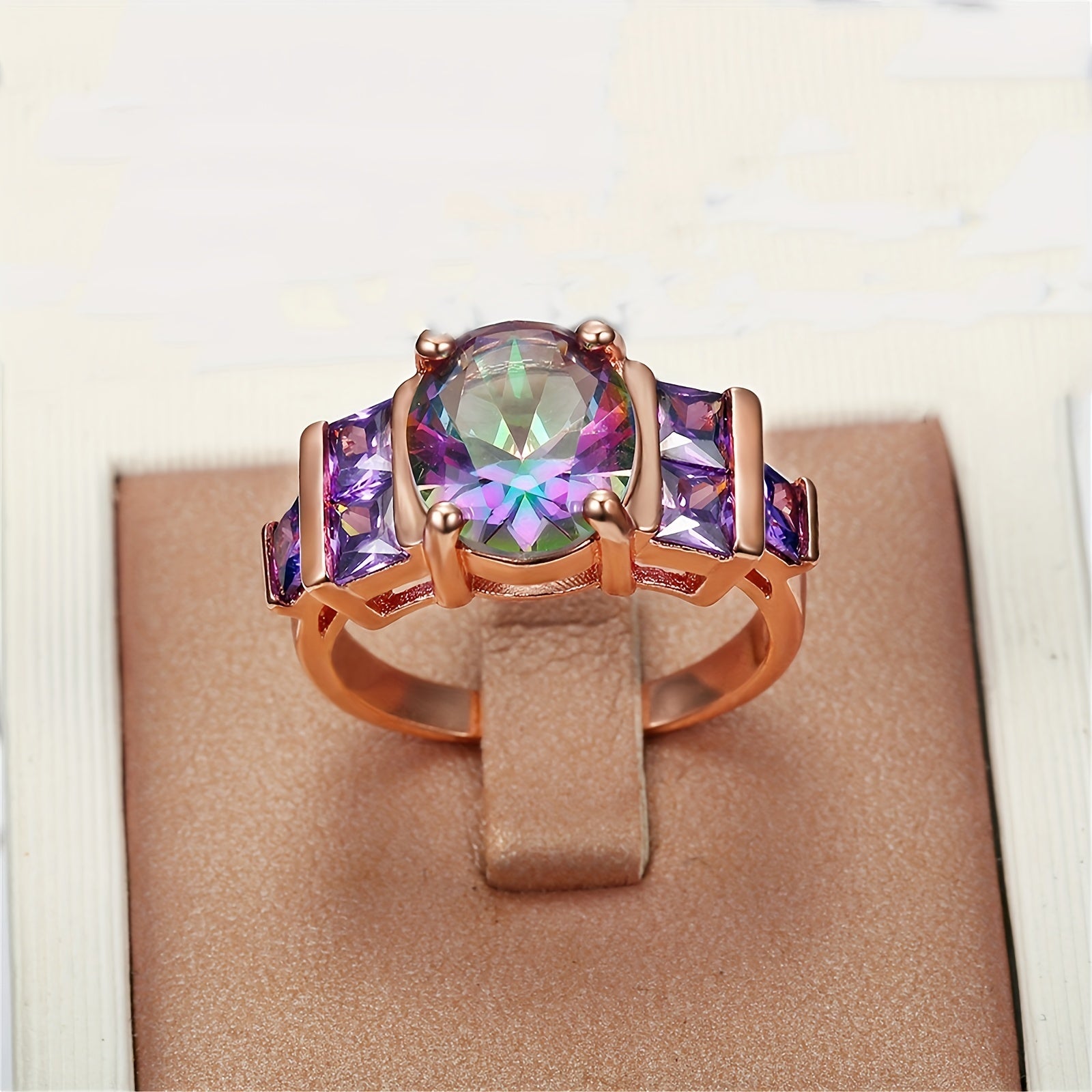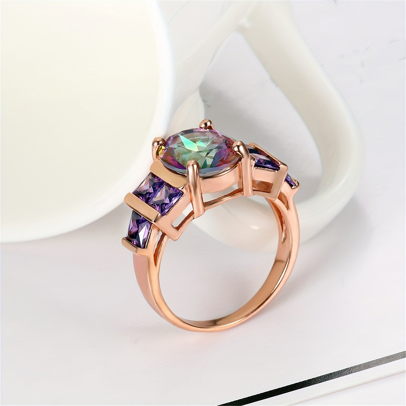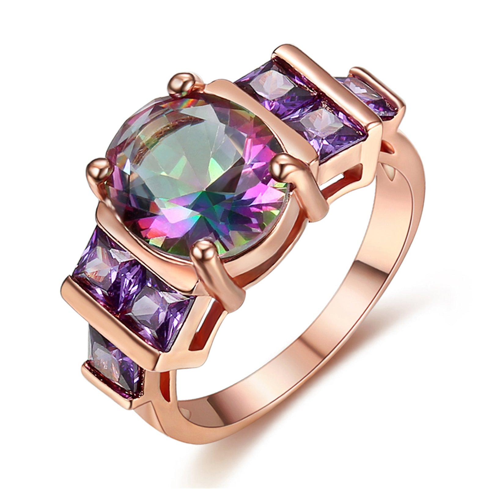 This stunning ring features colorful rainbow zircon stones set in a rose gold band, perfect for adding a pop of color to any outfit.