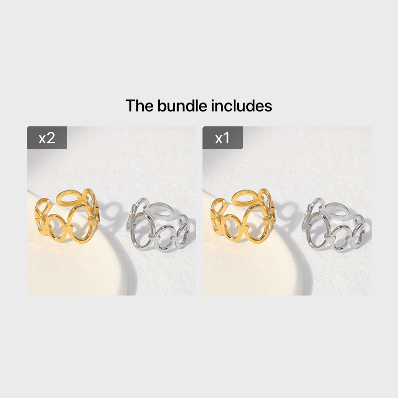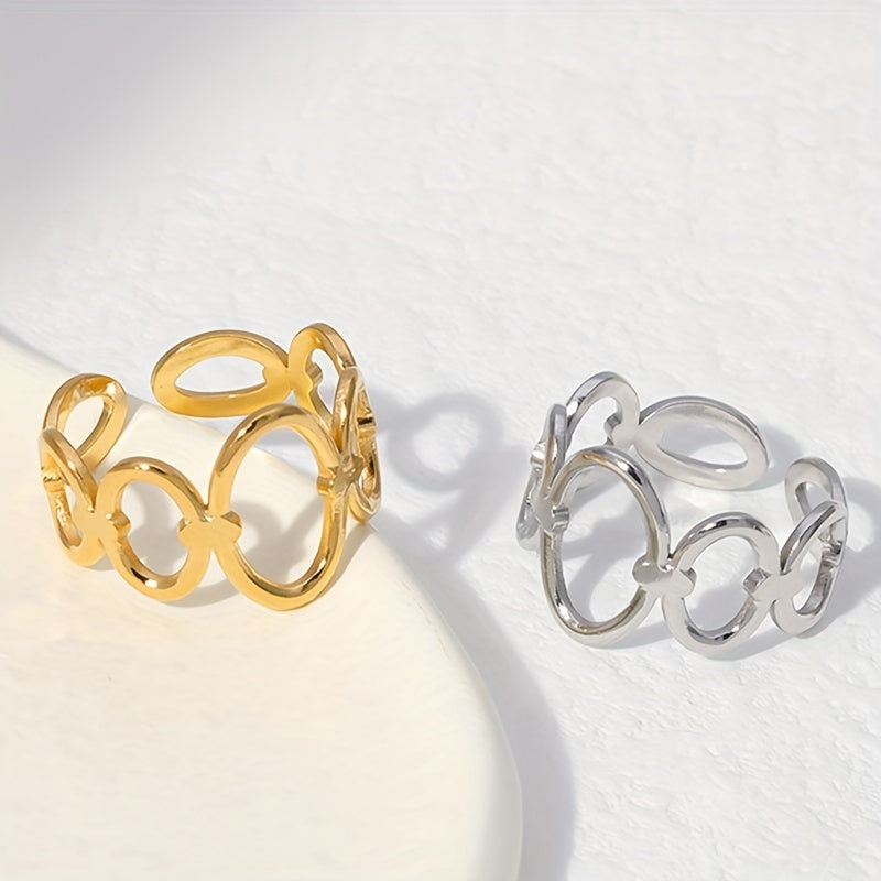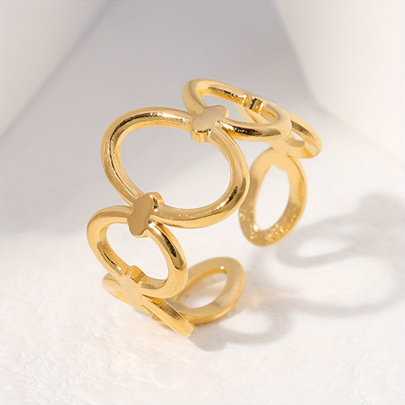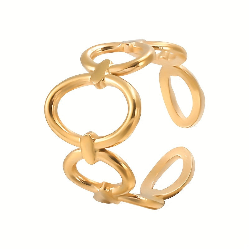 This stylish ring is made of golden stainless steel with a geometric design. It is adjustable to fit different finger sizes.