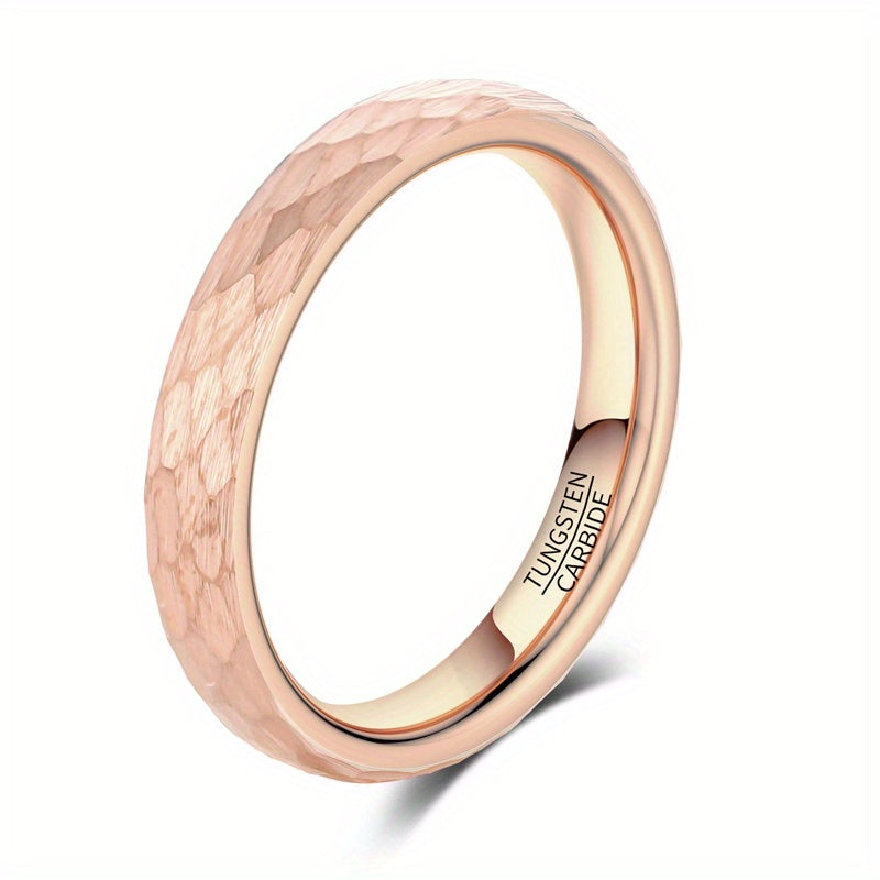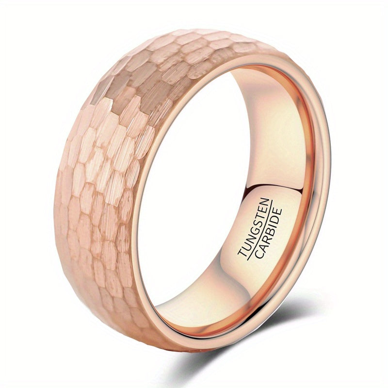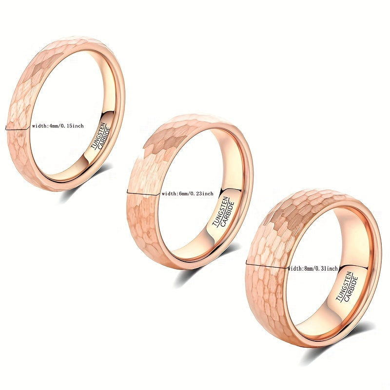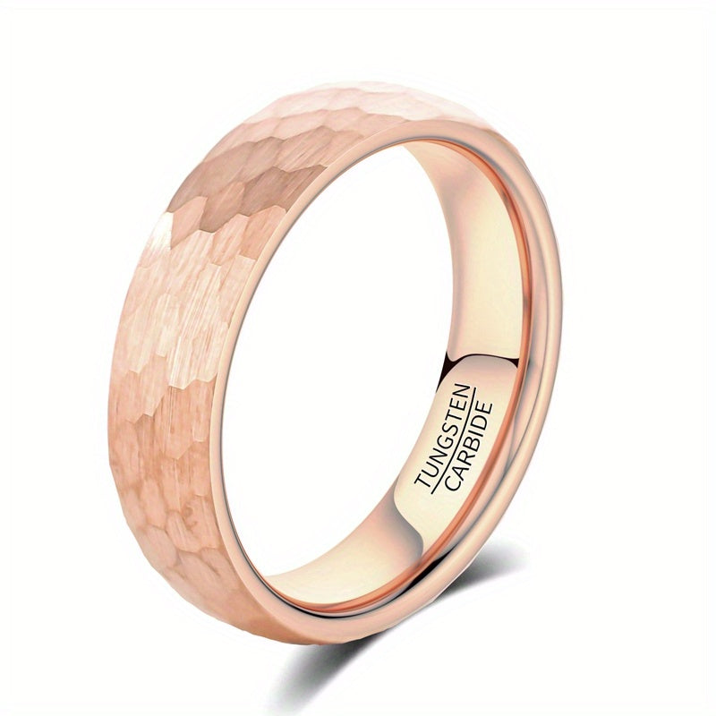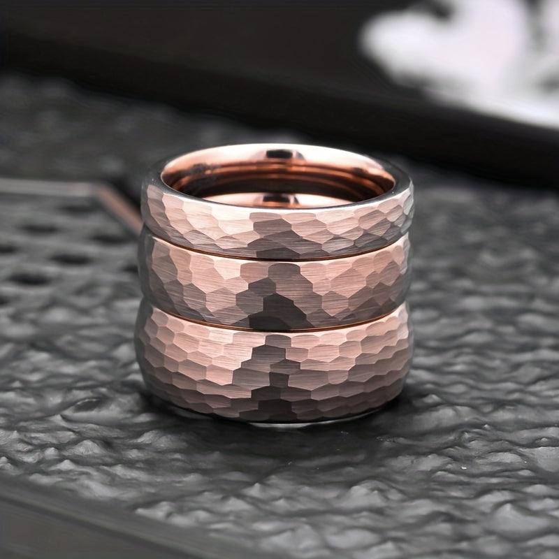 This unique tungsten ring features an irregular random hammerblow pattern with rose plating. Available in 4mm, 6mm, or 8mm width options, this ring is suitable for women, men, or as a unisex style.