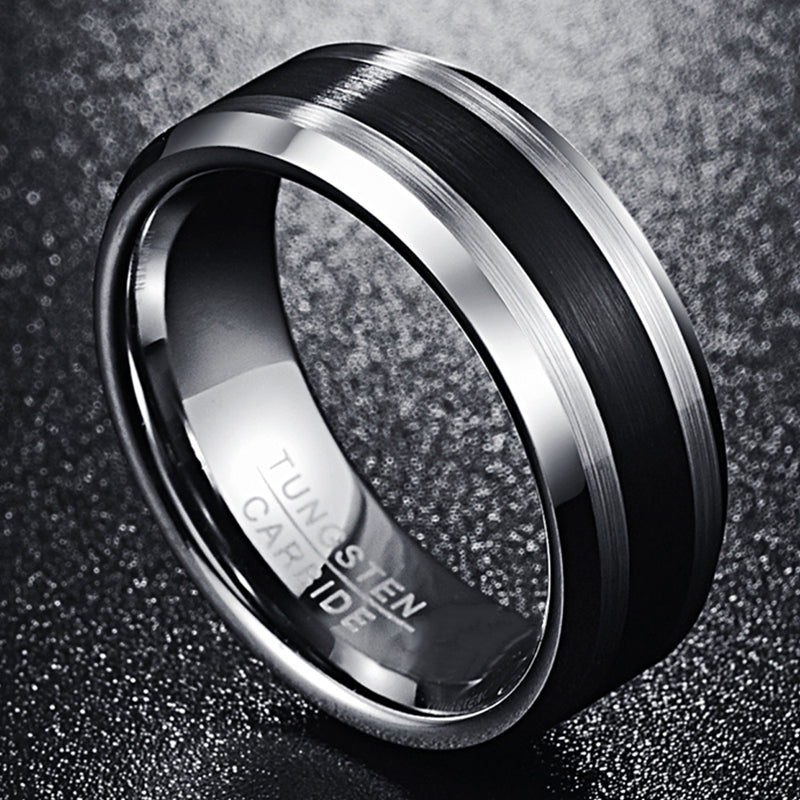 This tungsten ring features a silver gray middle and a width of 8mm. Available in sizes 7 to 14.