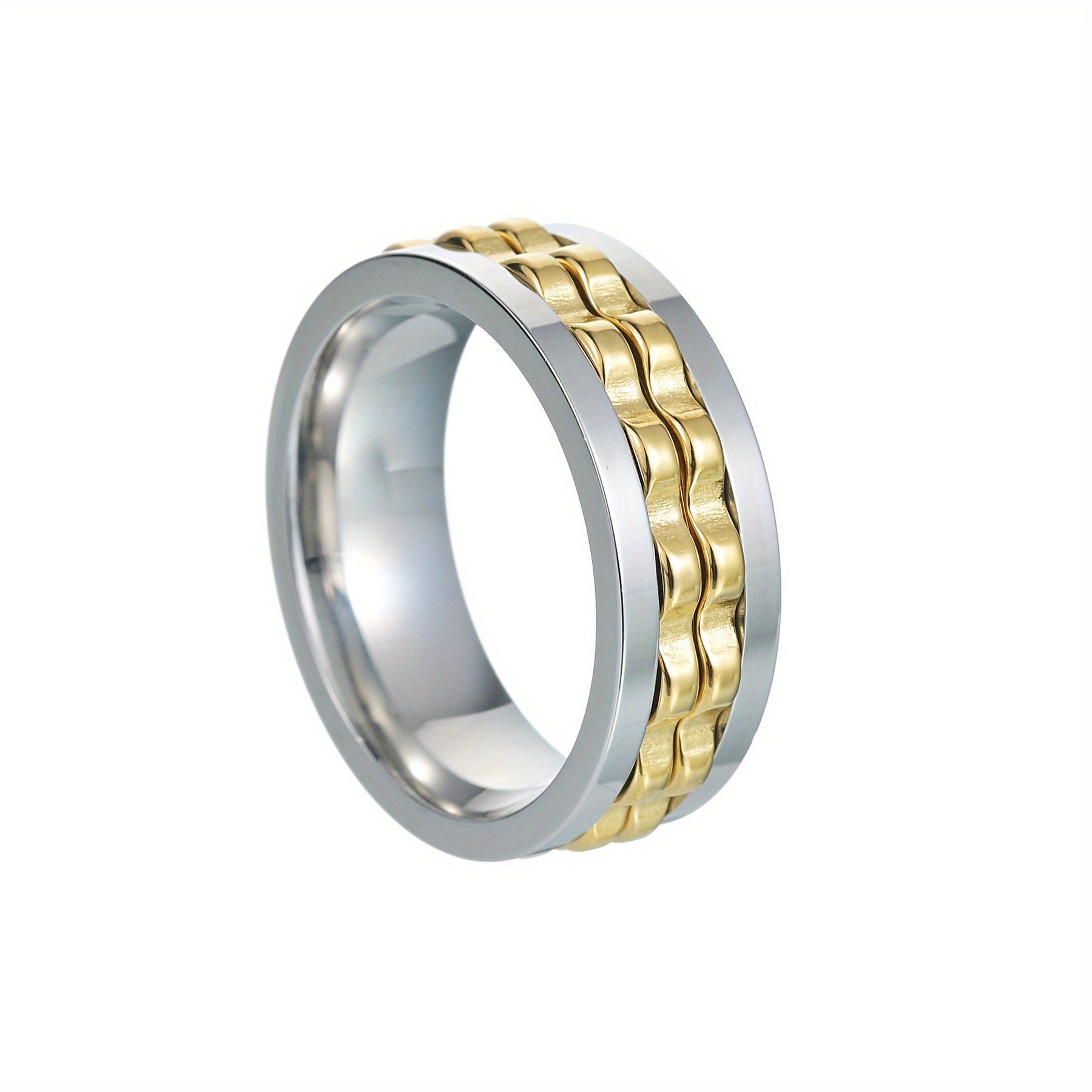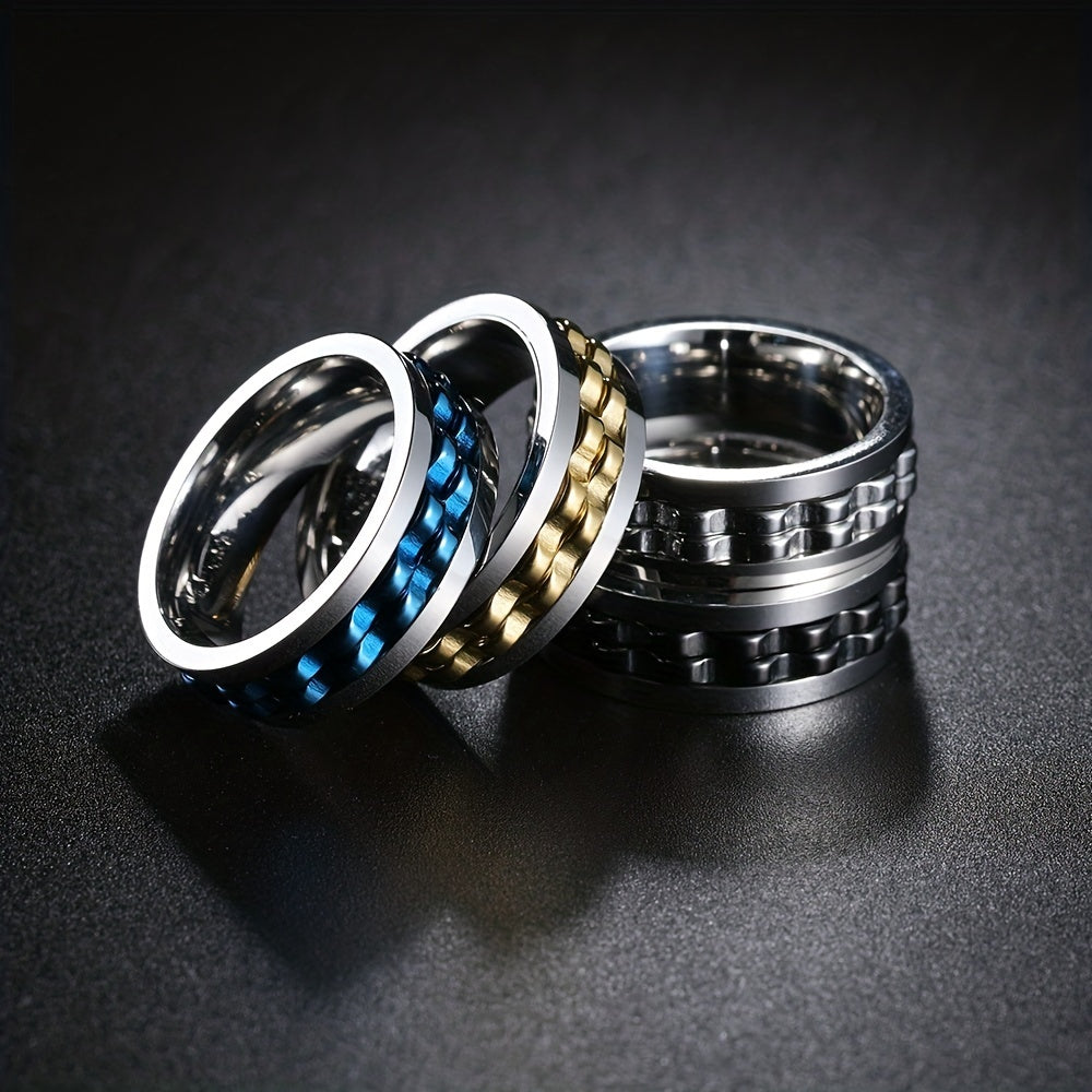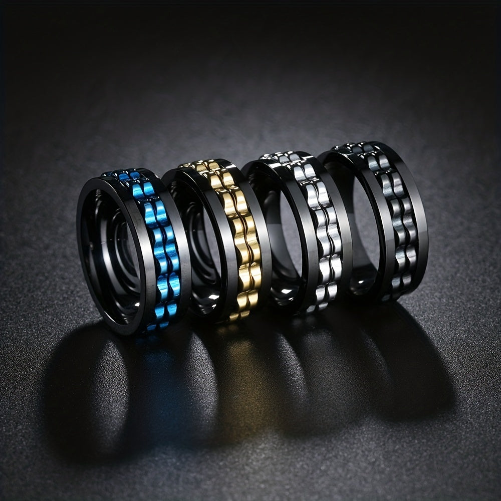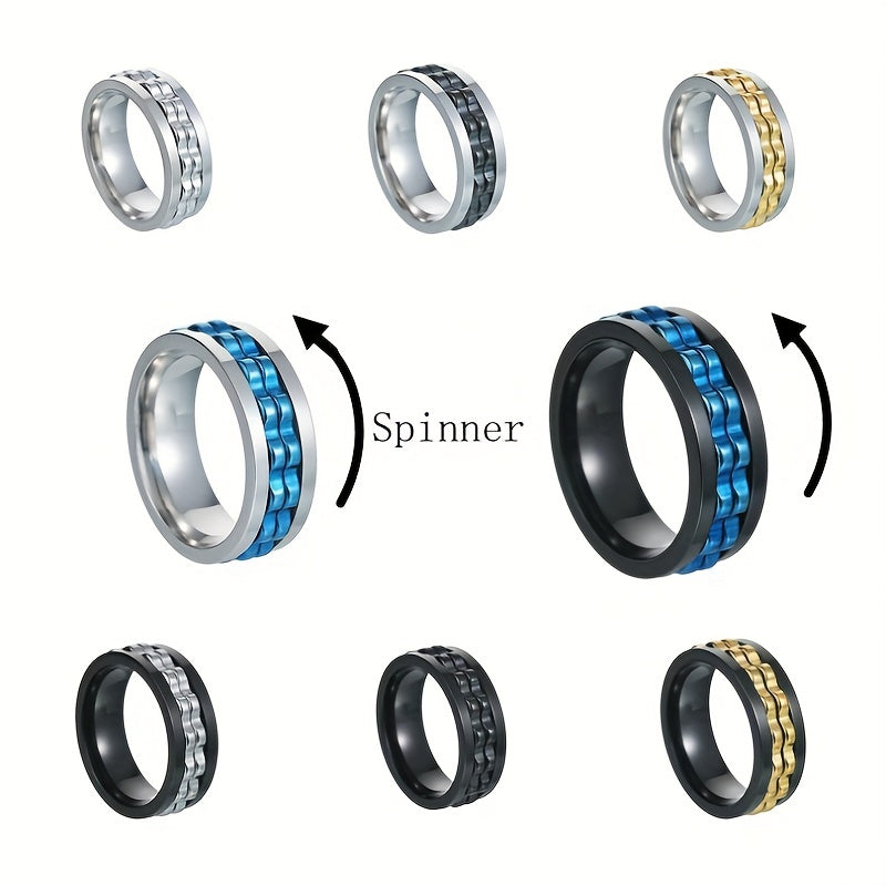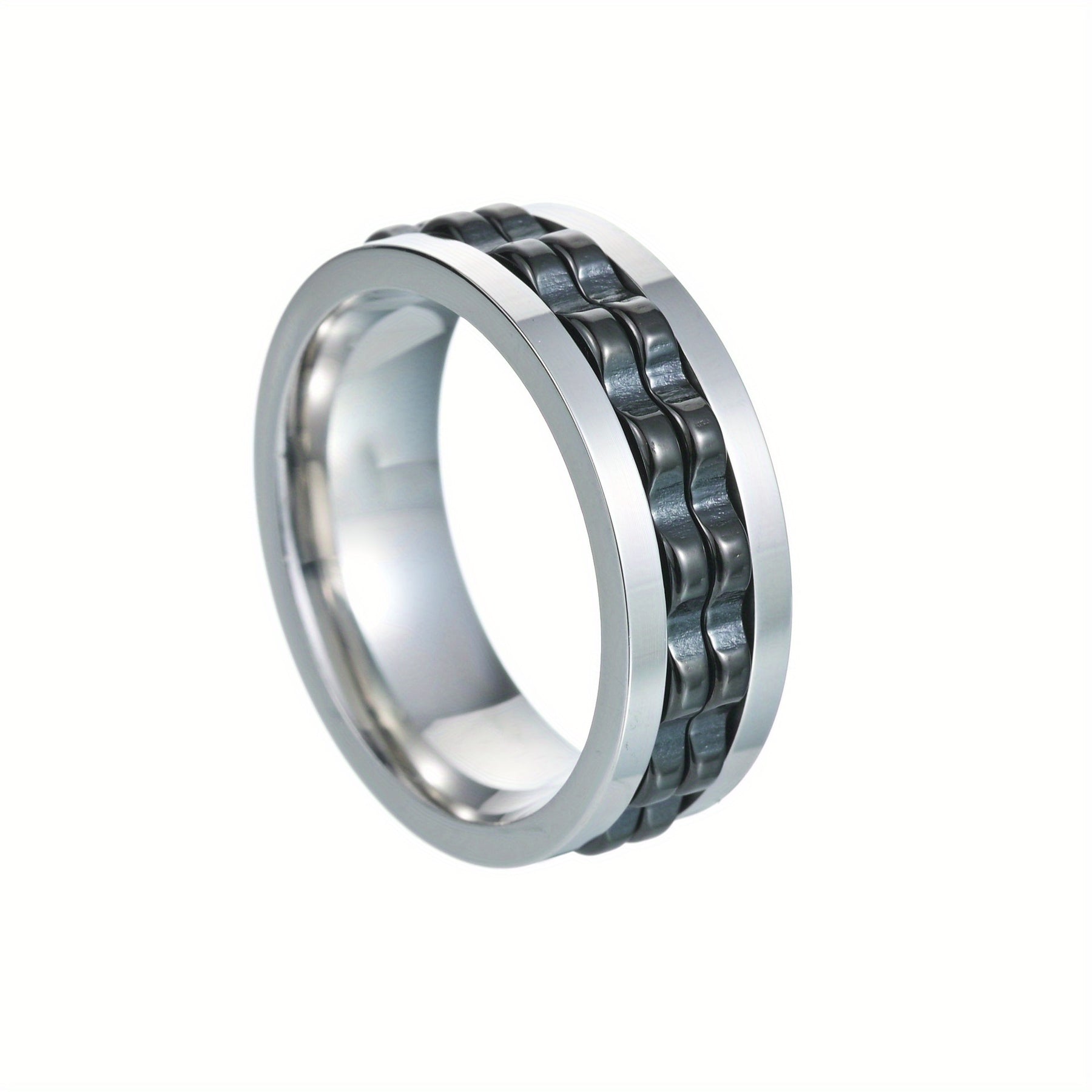 This stainless steel men's ring provides anxiety relief with a freely rotating gear fidget spinner design. A stylish accessory that helps reduce stress and provides a calming effect.