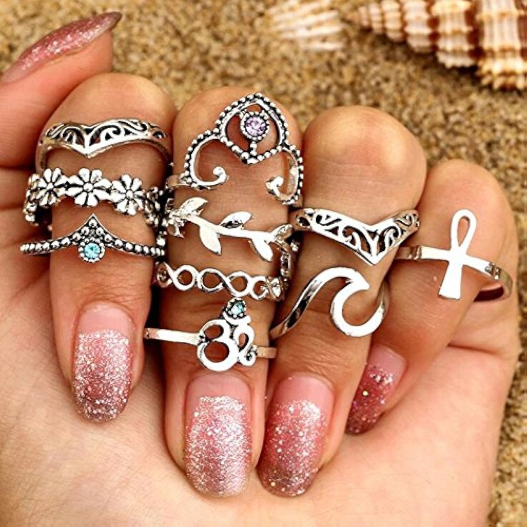 Elegant set of 10 plated oxidised rings. Made with durable materials.