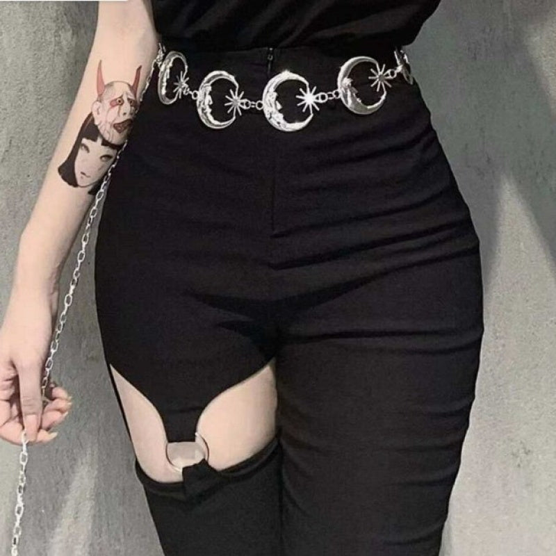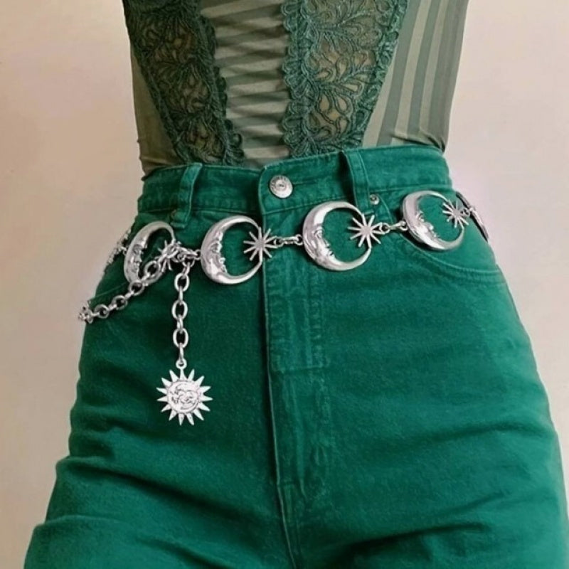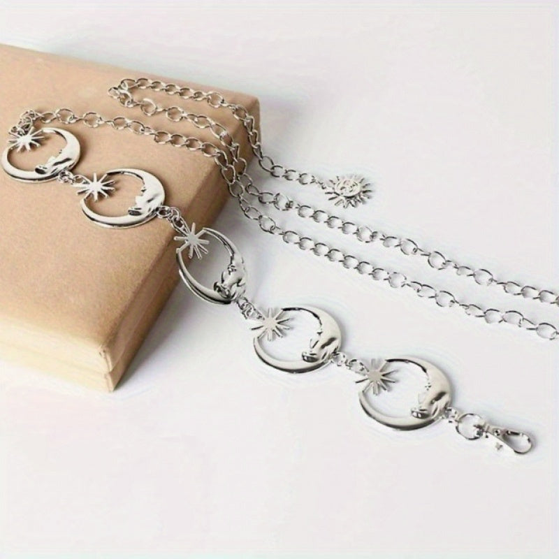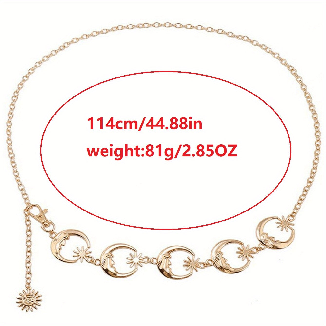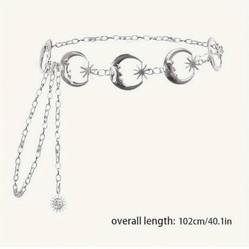Enhance your outfit with this versatile metal waist chain featuring a sun pendant and ethnic moon phases design. Perfect for adding a bohemian hip hop flair to your look, this accessory is a great addition to your beach or night out attire.