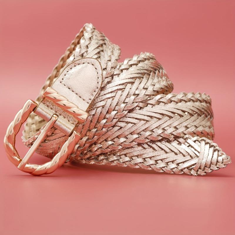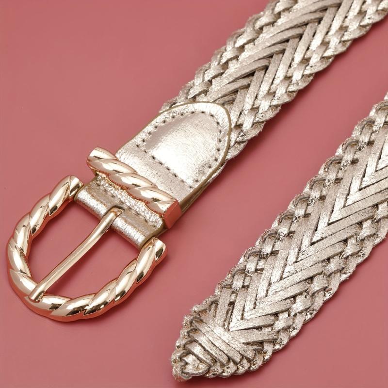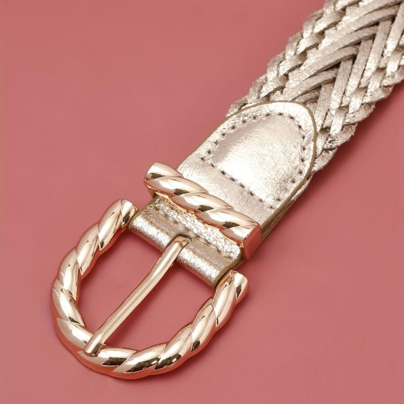 Golden PU Leather Braided Belt for Women Pin Buckle Waistband