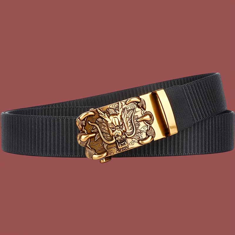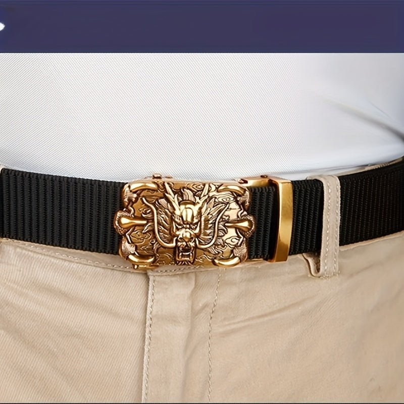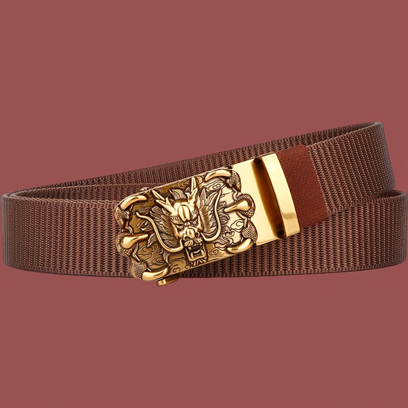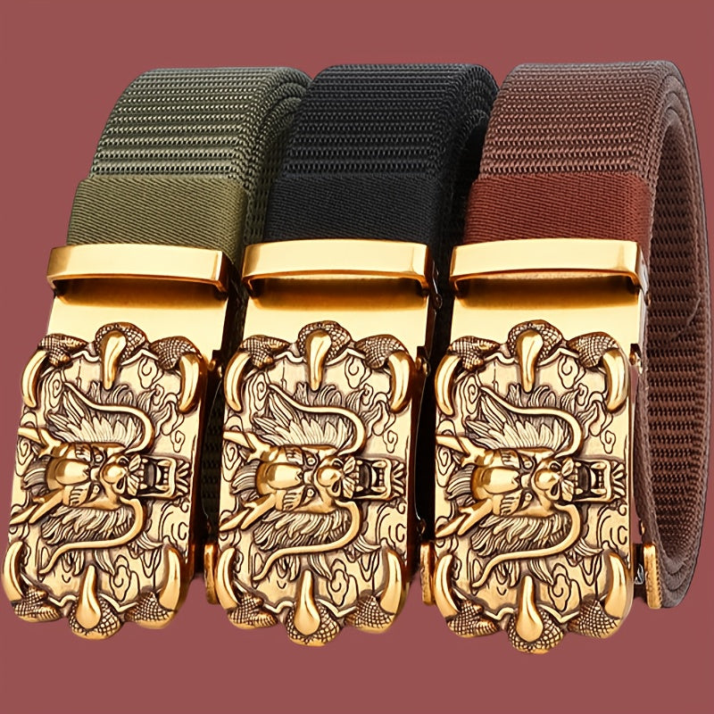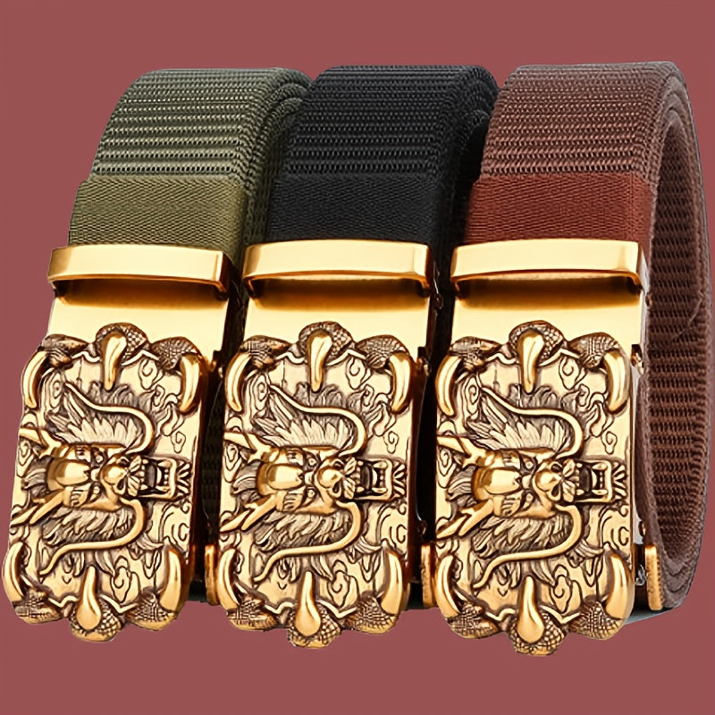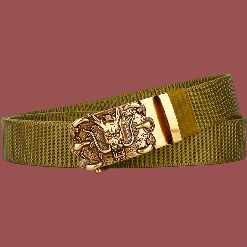 Elevate your style with this fashionable automatic buckle belt featuring an alloy buckle, thick polyester strap, and embossed golden tone design in green and brown. Ideal for daily wear.