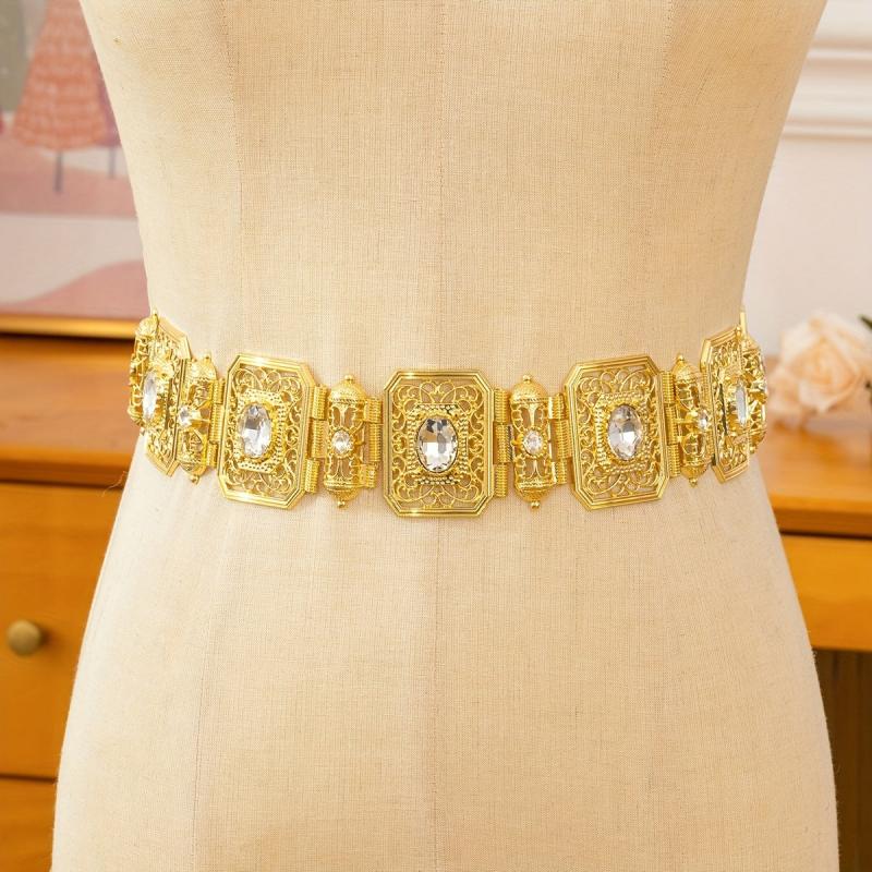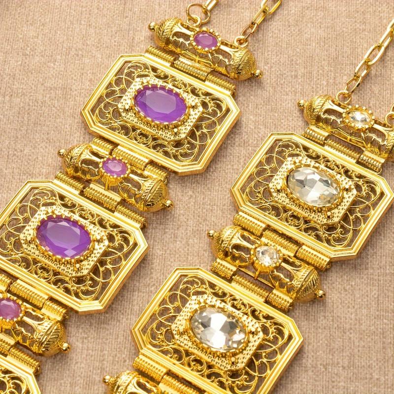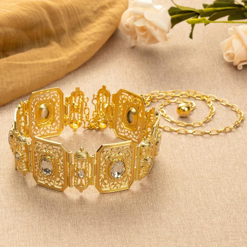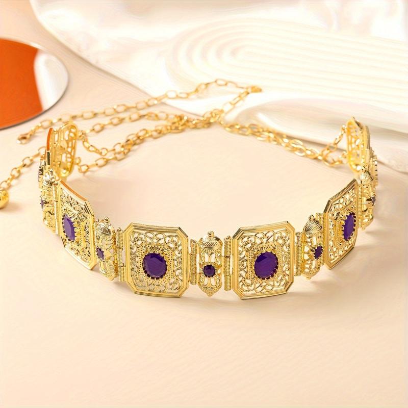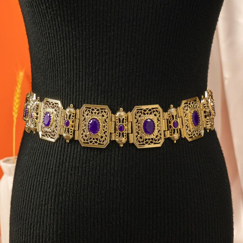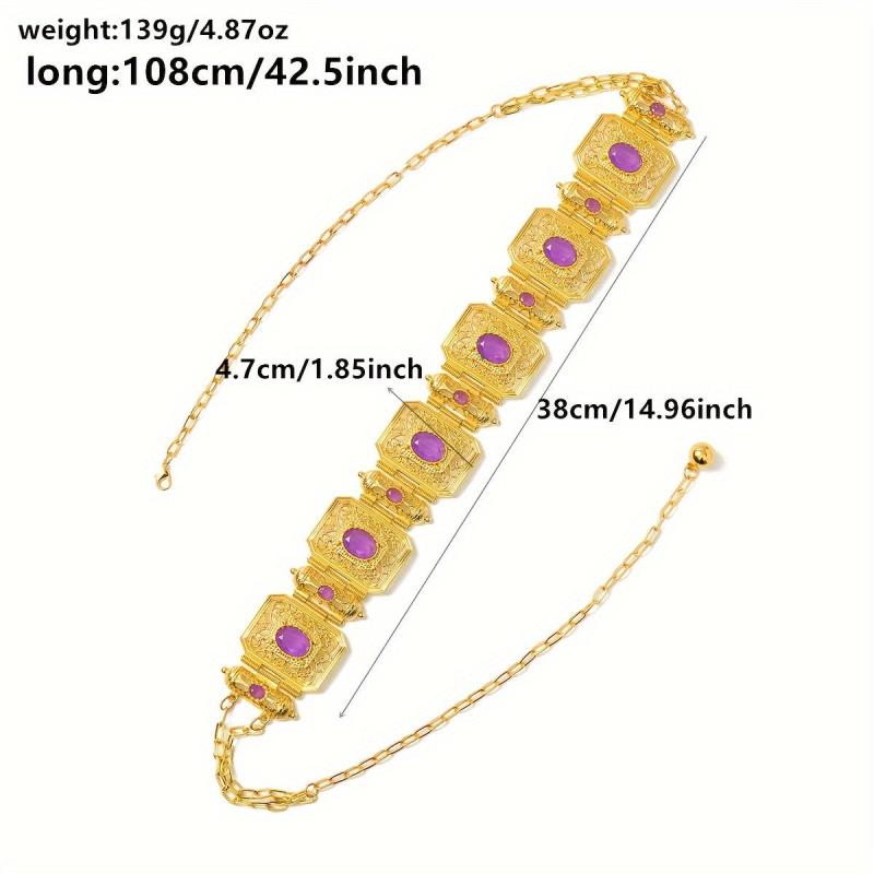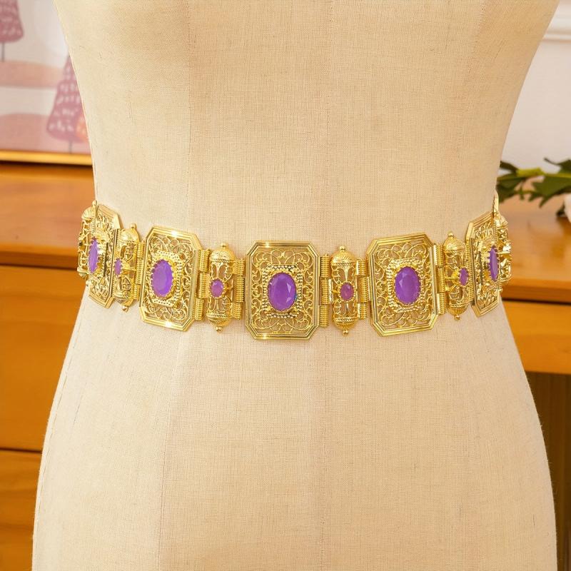 This stunning Moroccan bridal belt features a square carved hollow design with purple gemstones. It is made of golden waist chain and is a perfect accessory for weddings.