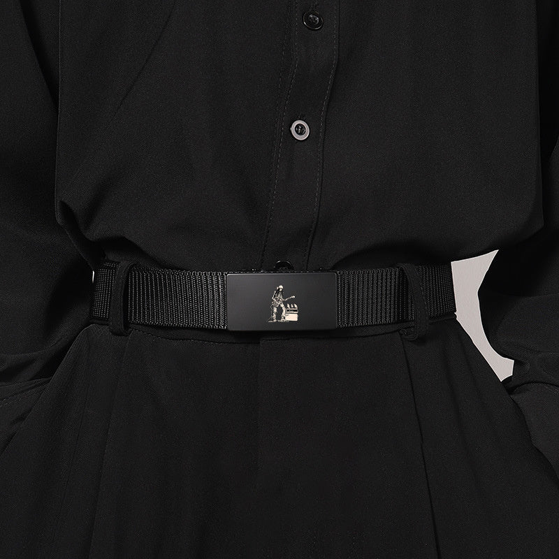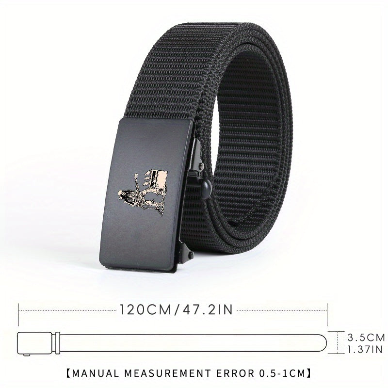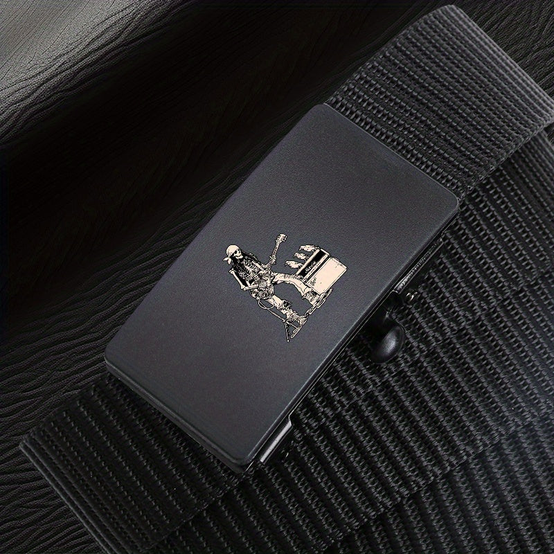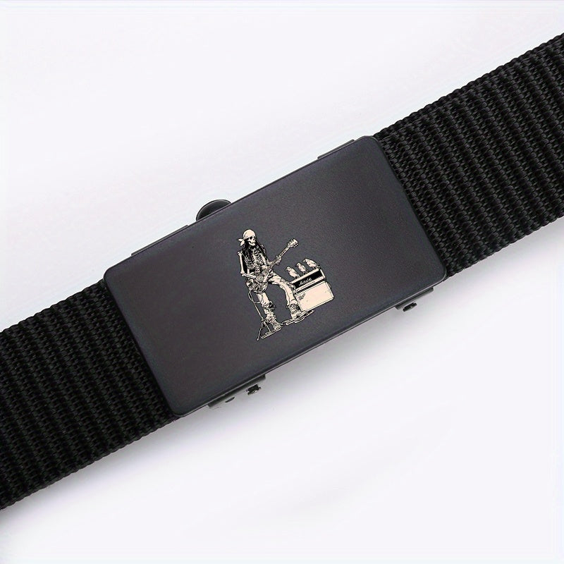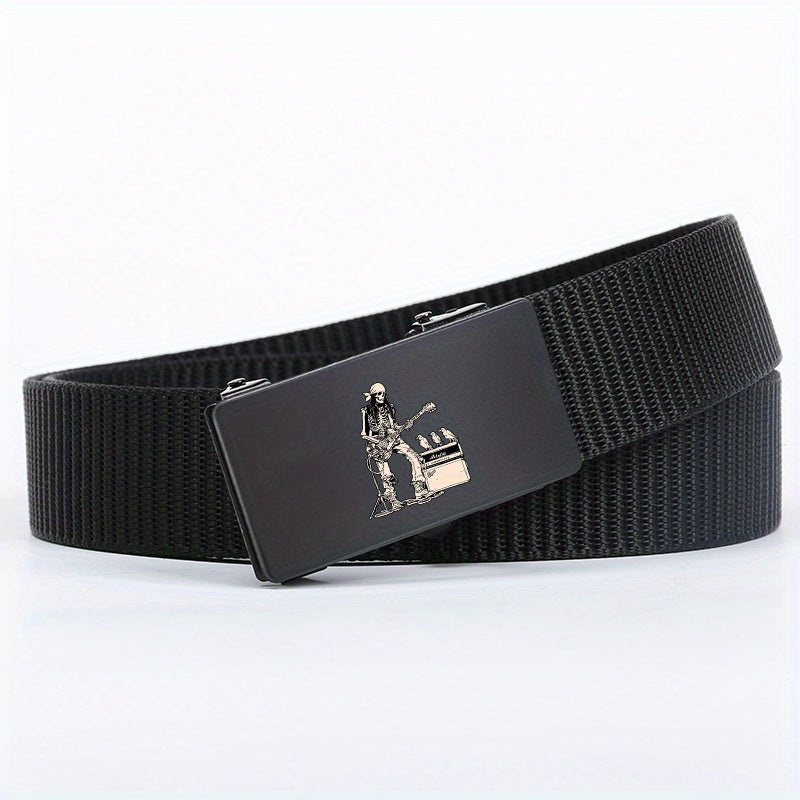 This stylish belt features a rock skull pattern and an automatic buckle, making it a versatile accessory for casual and business outfits. It is made of high-quality polyester material with a guitar skeleton design, making it a great gift for men.