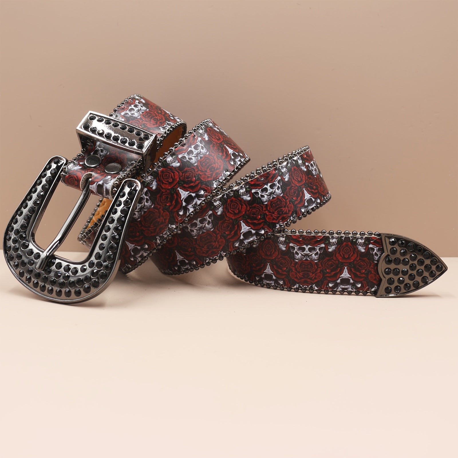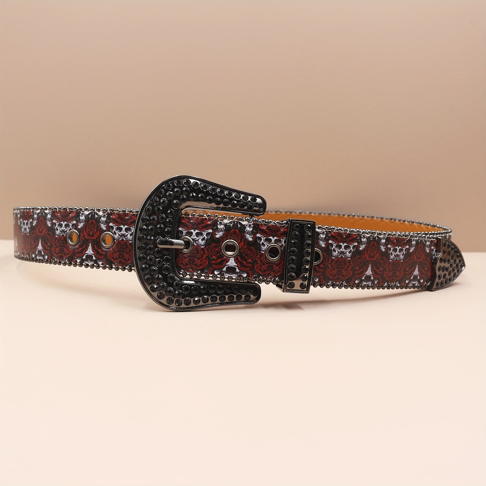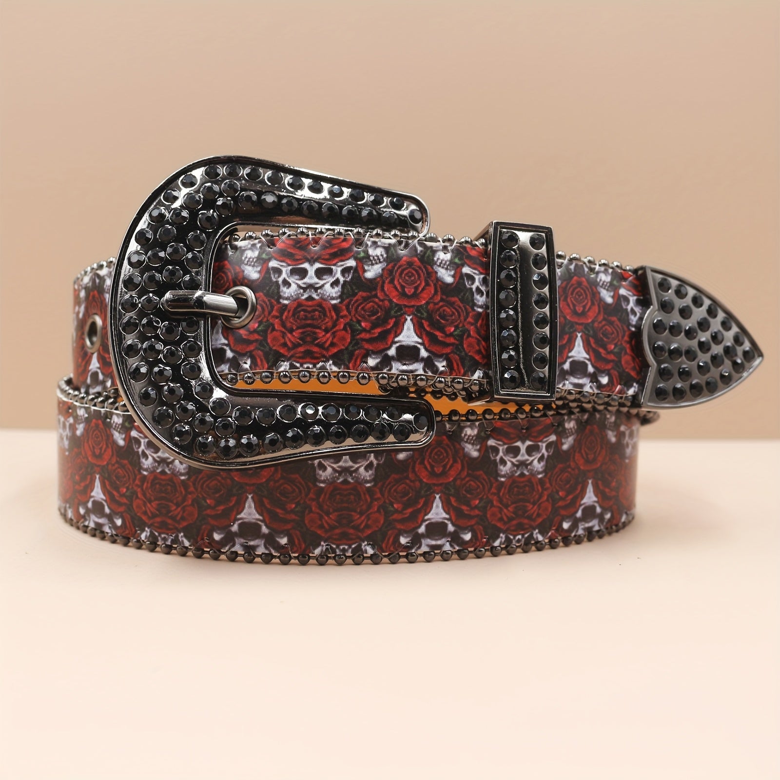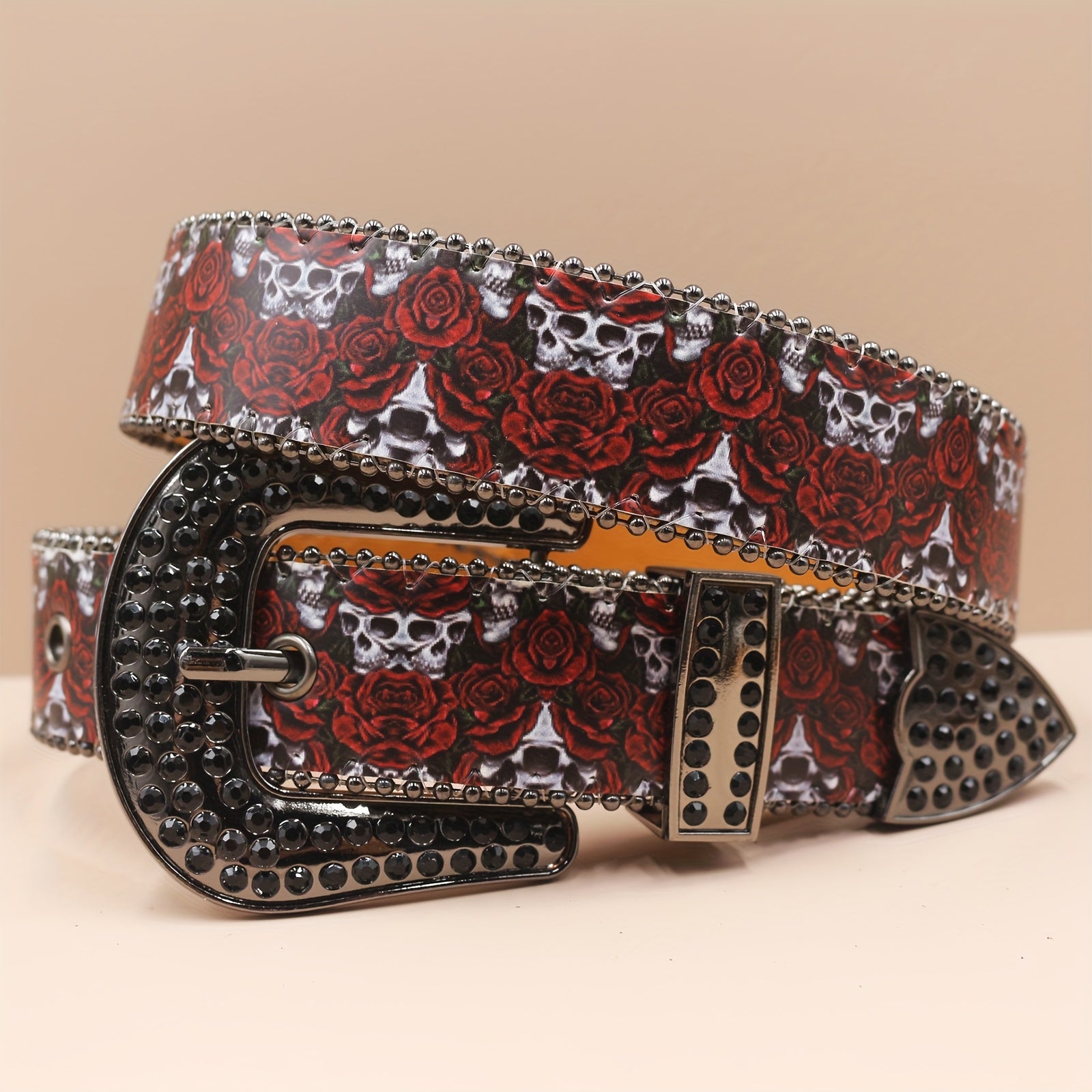 Add a touch of edgy style to your outfit with this skull and flower print rhinestone belt. Made of faux leather, it's the perfect accessory for jeans and dresses alike.