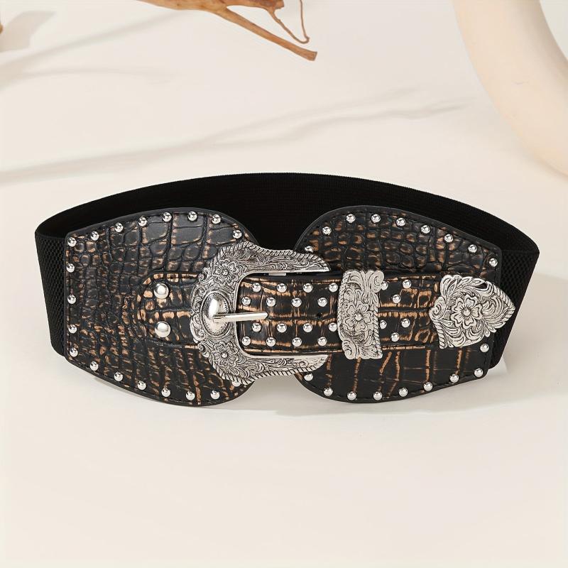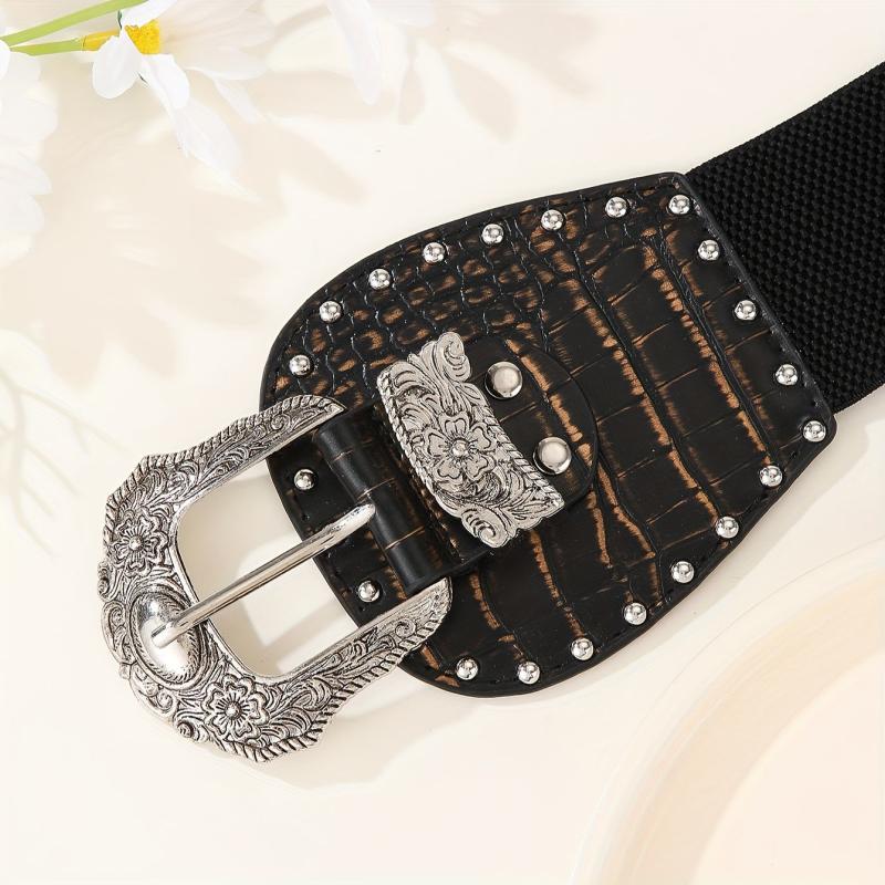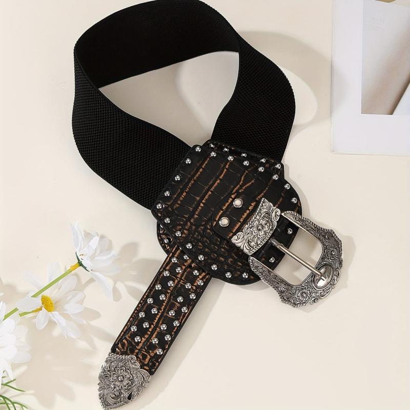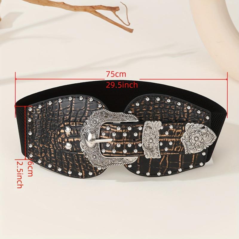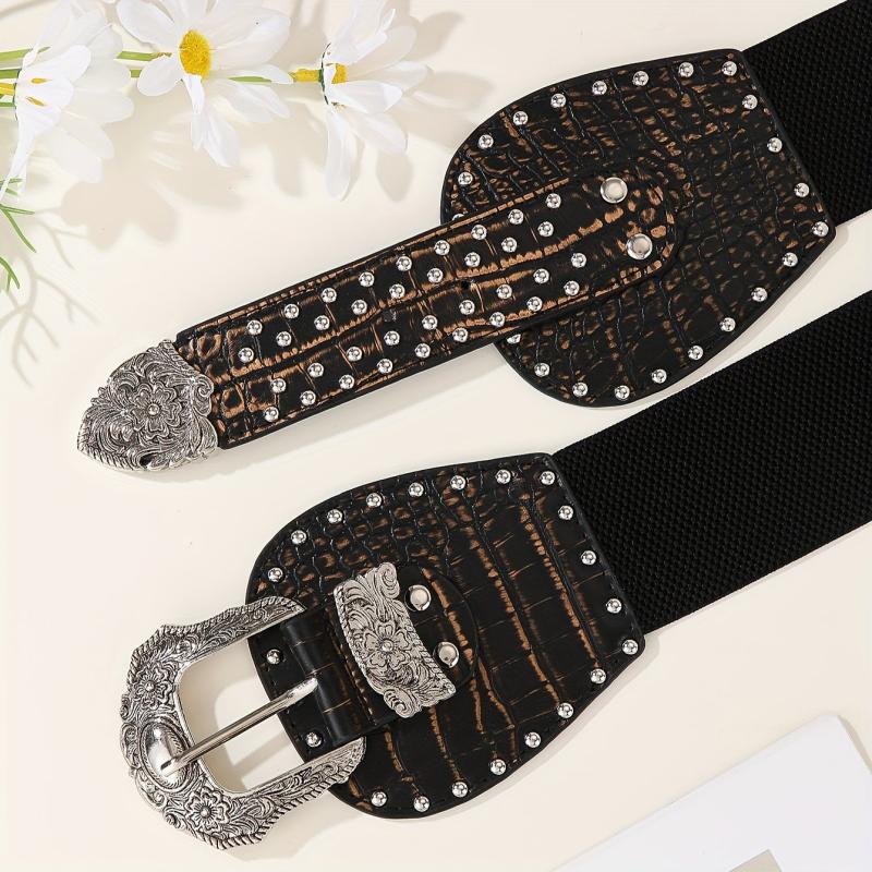 Add a touch of western charm to your outfit with this vintage crocodile skin belt. The silver studs and decorative buckle make it perfect for casual outings, beach days, and evening events.