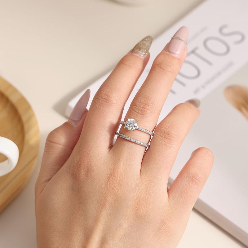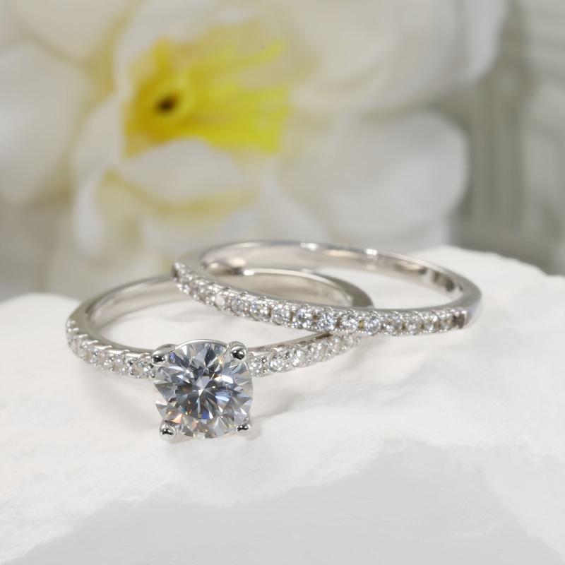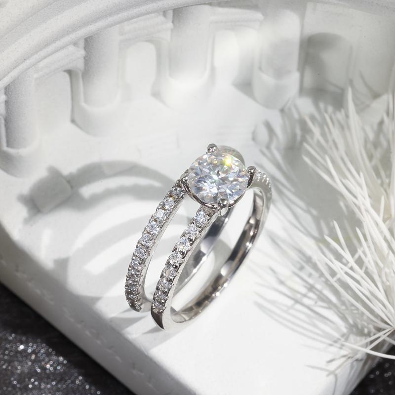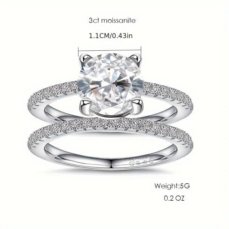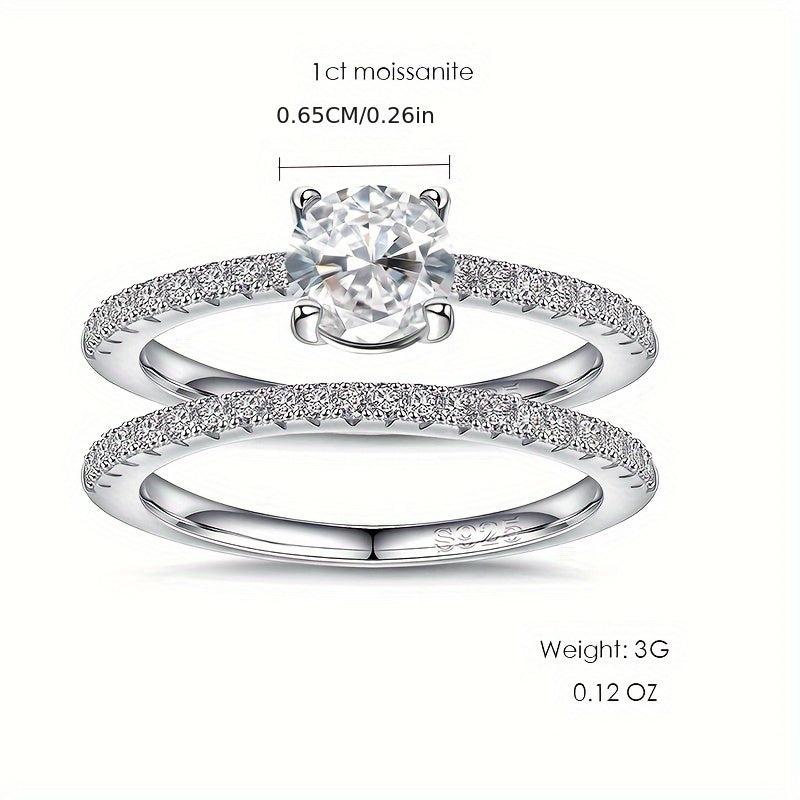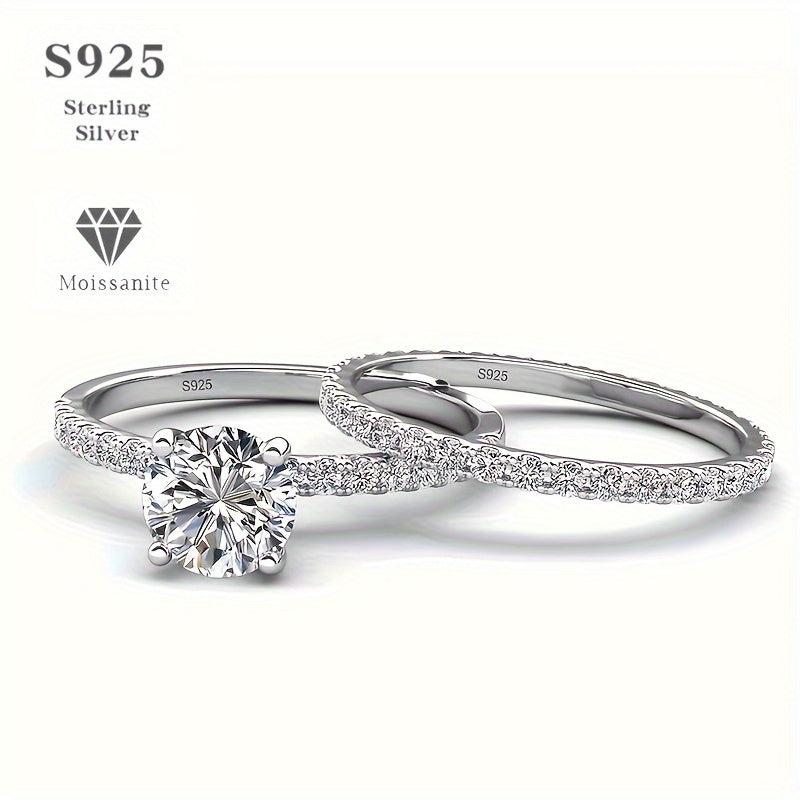This 2pcs set includes a round cut Moissanite engagement ring and wedding band. Crafted in S925 sterling silver, this bridal set is perfect for women.