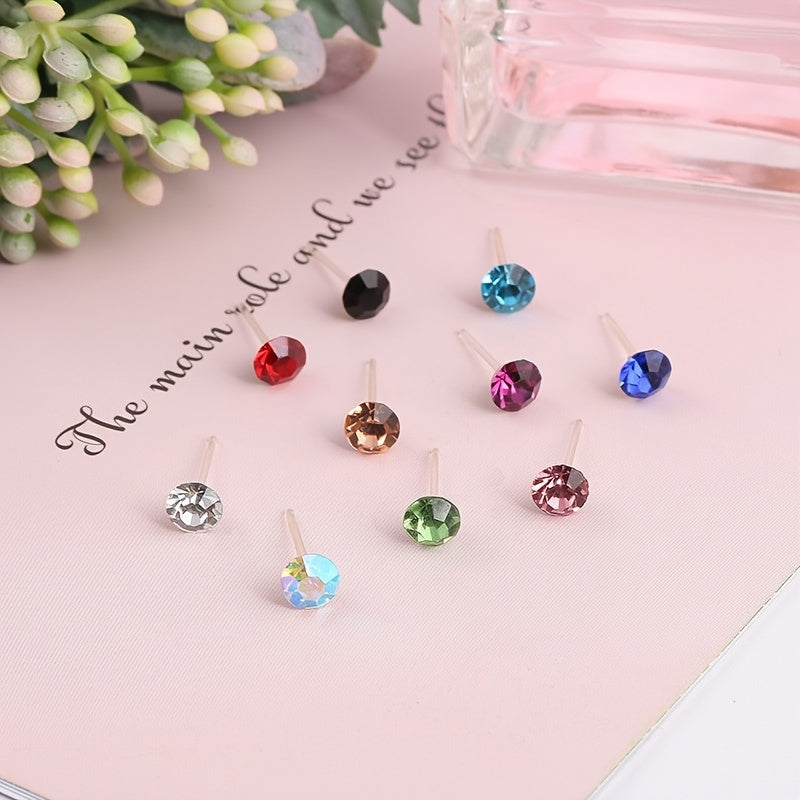 Add a touch of sparkle to your outfit with this set of 10 pairs of rhinestone stud earrings. Perfect for daily wear and gift giving, these minimalist style earrings are versatile and chic.