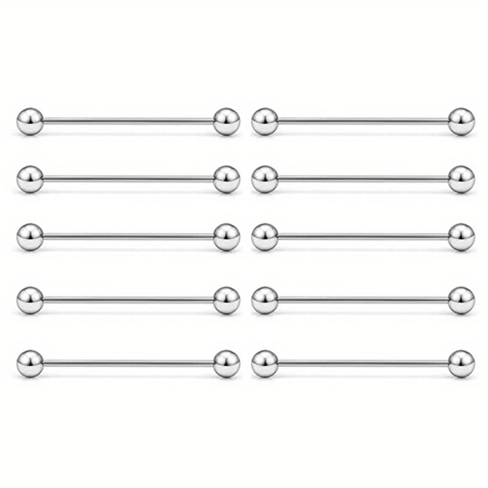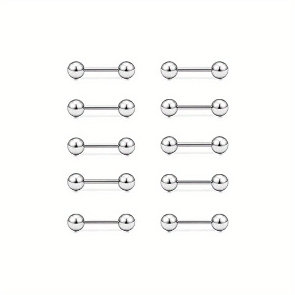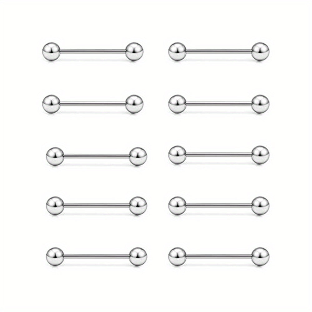 Adorn your piercings with this set of 10 round ball and barbell shape tongue rings and nipple rings. Made of high-quality stainless steel for durability and hygiene.