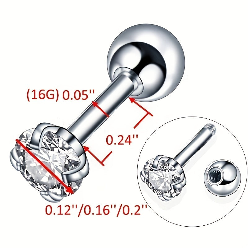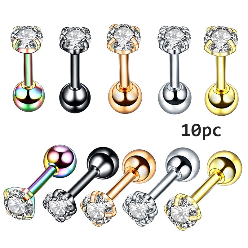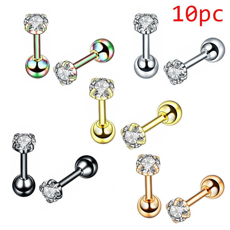 Add a touch of sparkle with these zircon inlaid stud earrings, perfect for cartilage piercings. A set of 10 pairs to mix and match for any occasion.