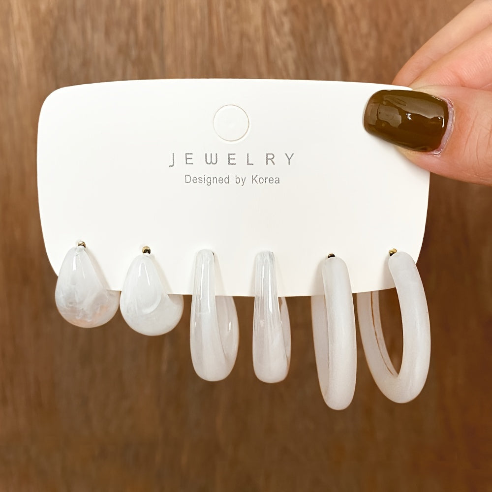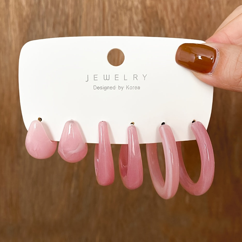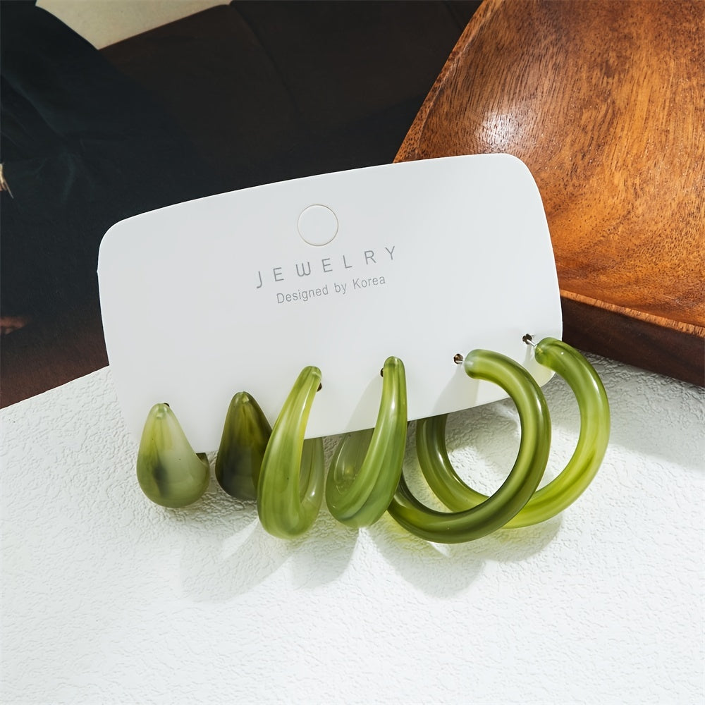 Enhance your style with this set of 3 pairs of multicolor C shape resin metal earrings. Perfect for daily wear or special occasions.
