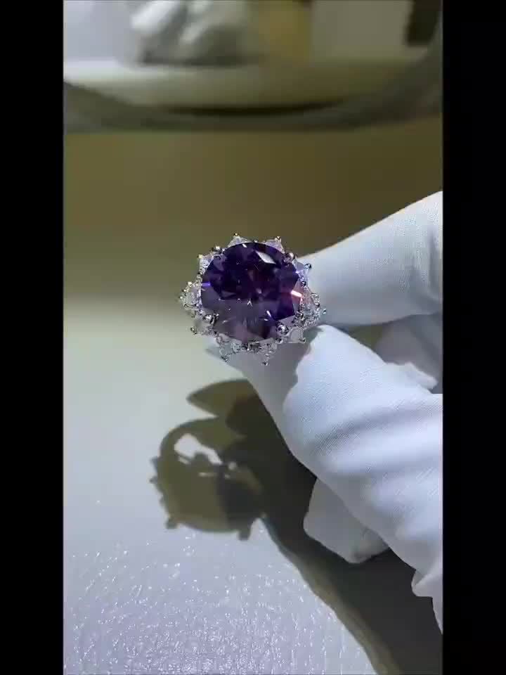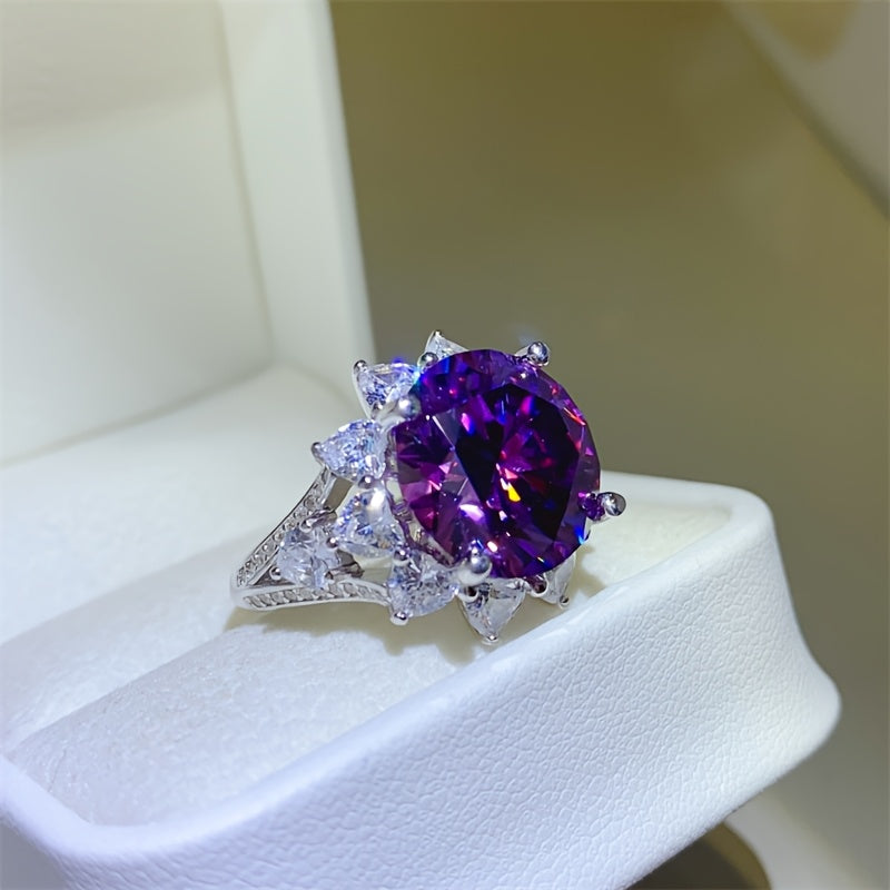 Make a statement with this stunning 10ct purple moissanite ring. The ring features a beautiful D moissanite stone that is perfect for parties and special occasions. It is an ideal accessory for ladies who want to add a touch of glamour to their outfit.