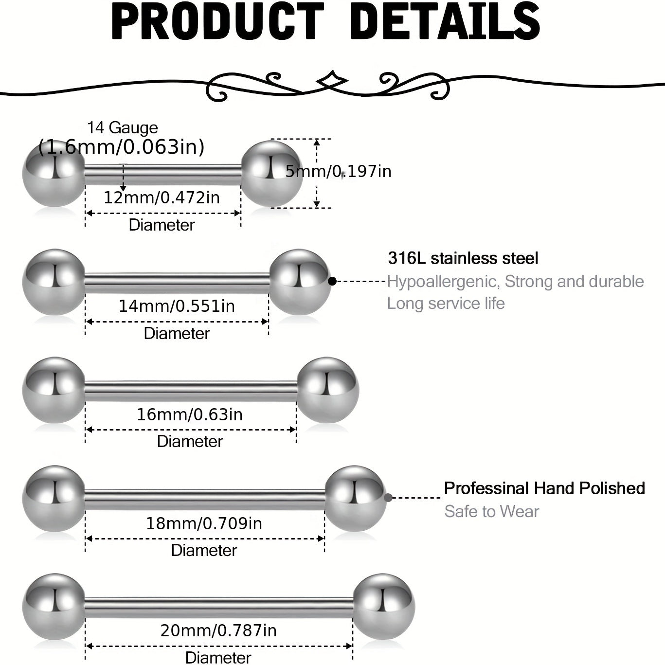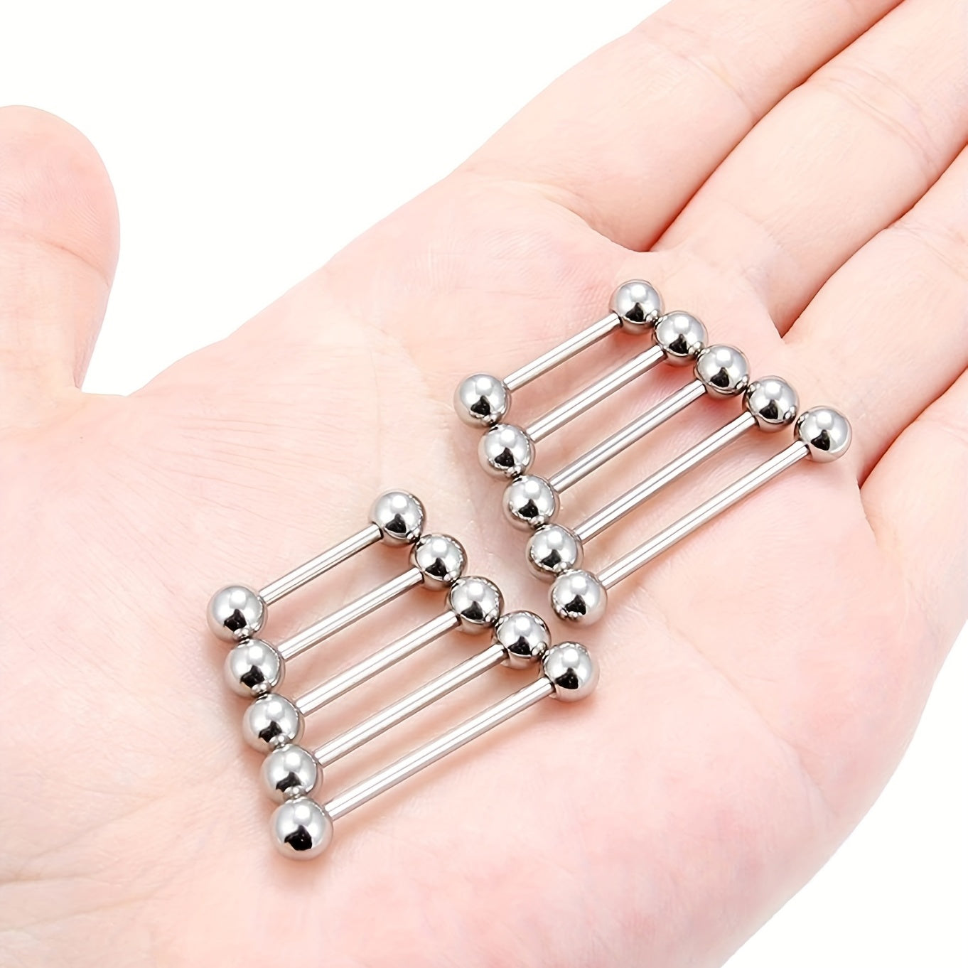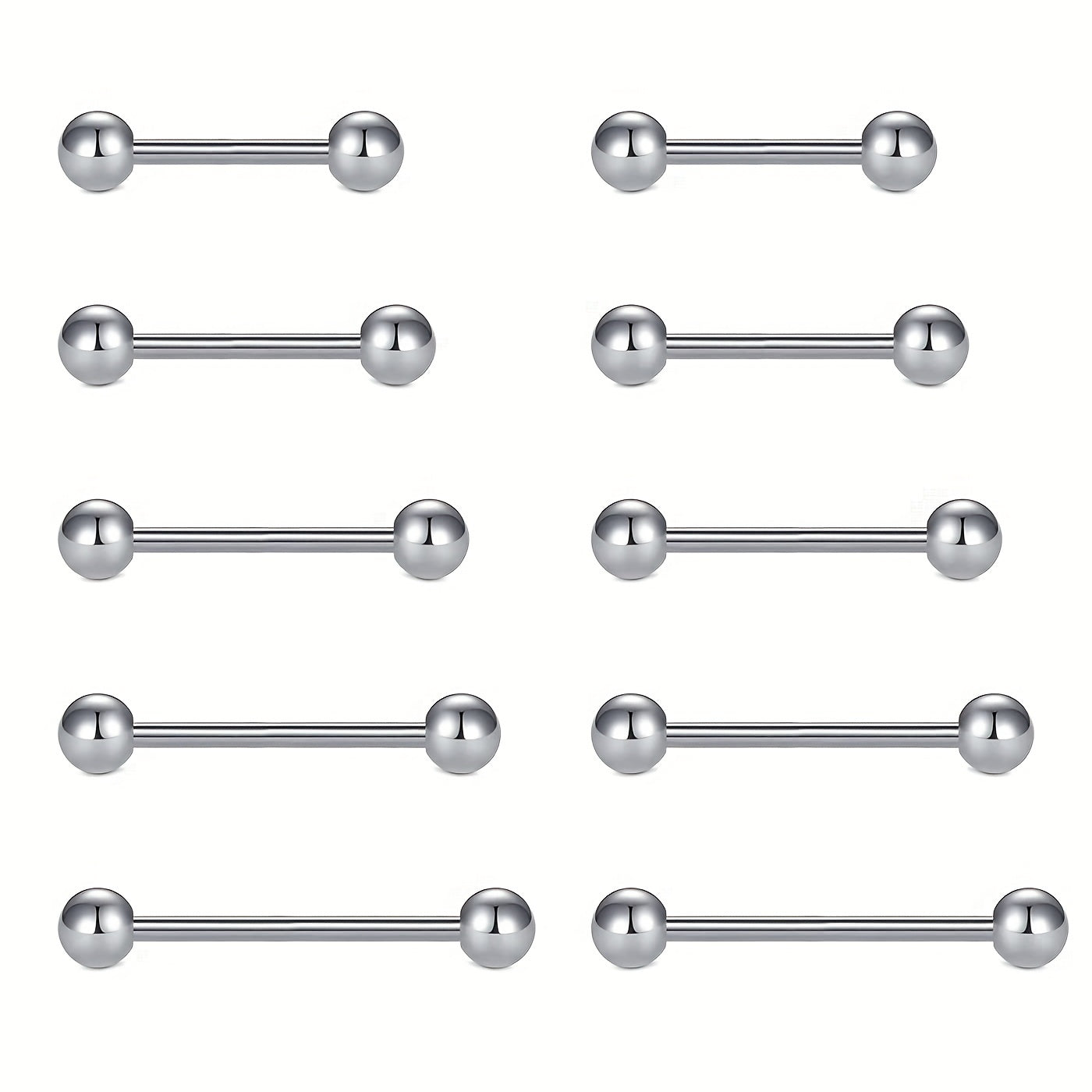 This set includes 10 pieces of 14 gauge surgical steel tongue nipple rings with different bar lengths (12-20mm). Suitable for men, these straight barbells are durable and stylish.