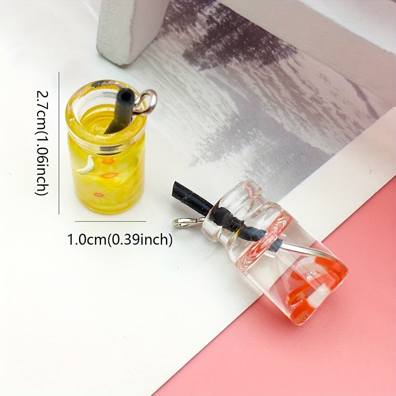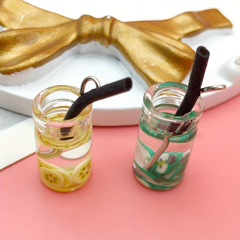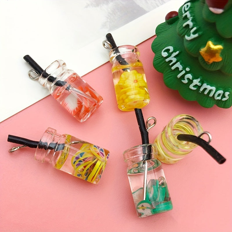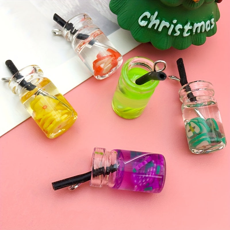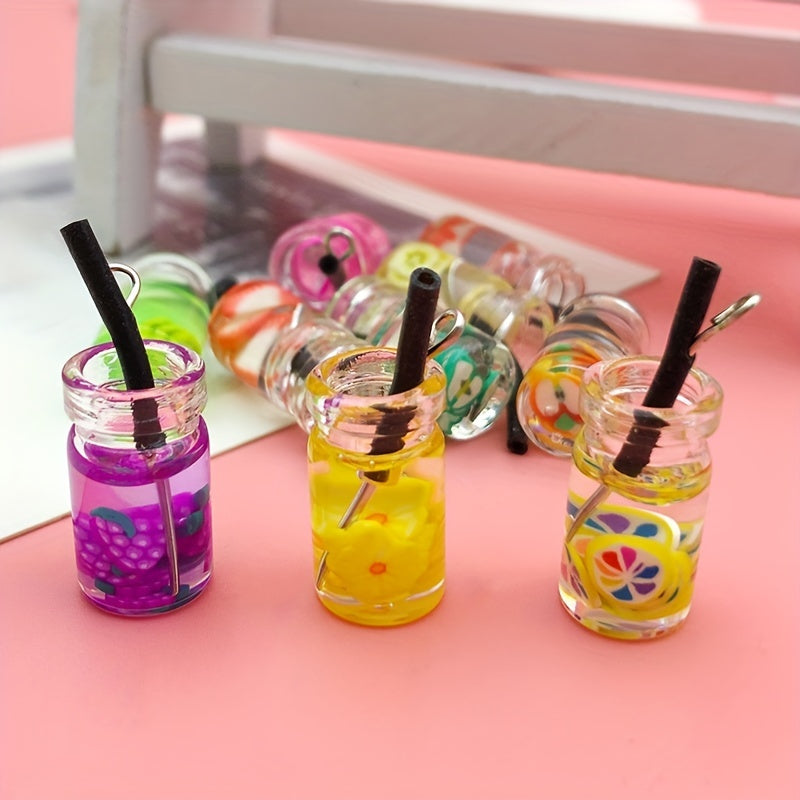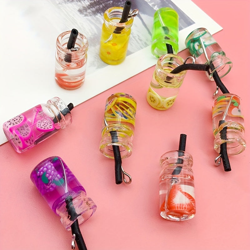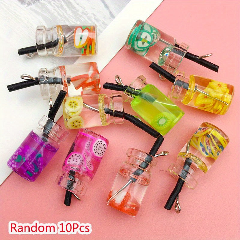 This pack includes 10 pieces of 10x27mm glass resin fruit tea cup bottle charms perfect for creating necklaces, bracelets, earrings, and keychains. Ideal for DIY jewelry making projects.