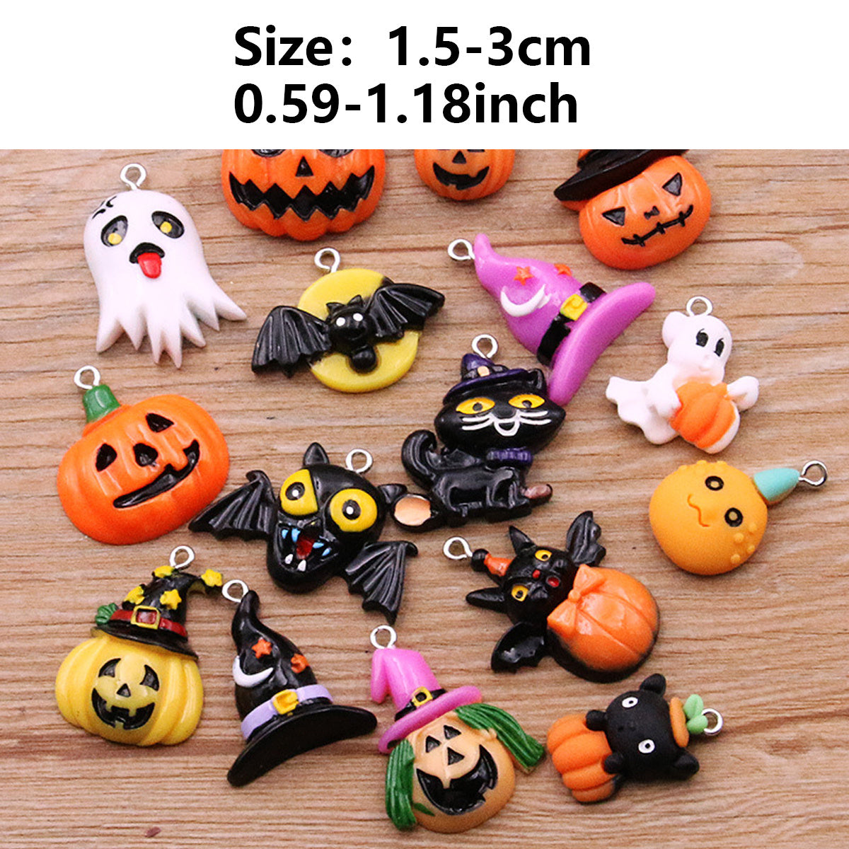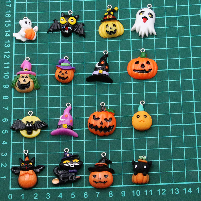 Get into the Halloween spirit with this set of 10 mixed charms perfect for DIY projects. Each charm features a spooky Halloween design including pumpkins, hats, bats, and skulls. Use them to create earrings, keychains, or any other Halloween-inspired crafts.