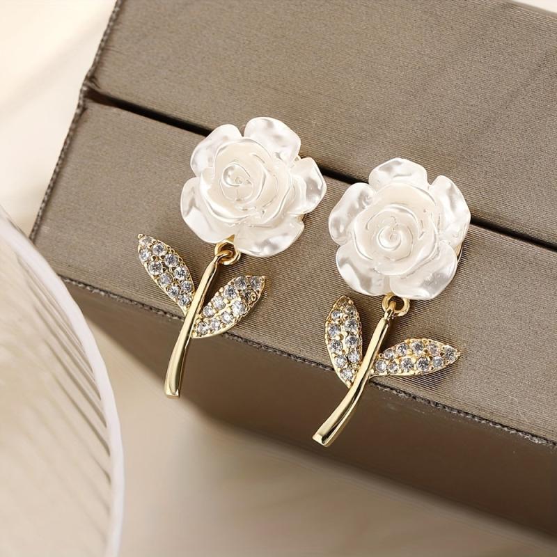 Sparkling rose stud earrings with zirconia stones, plated with 14K gold for an elegant look. Made of copper material, perfect for daily wear or special occasions.
