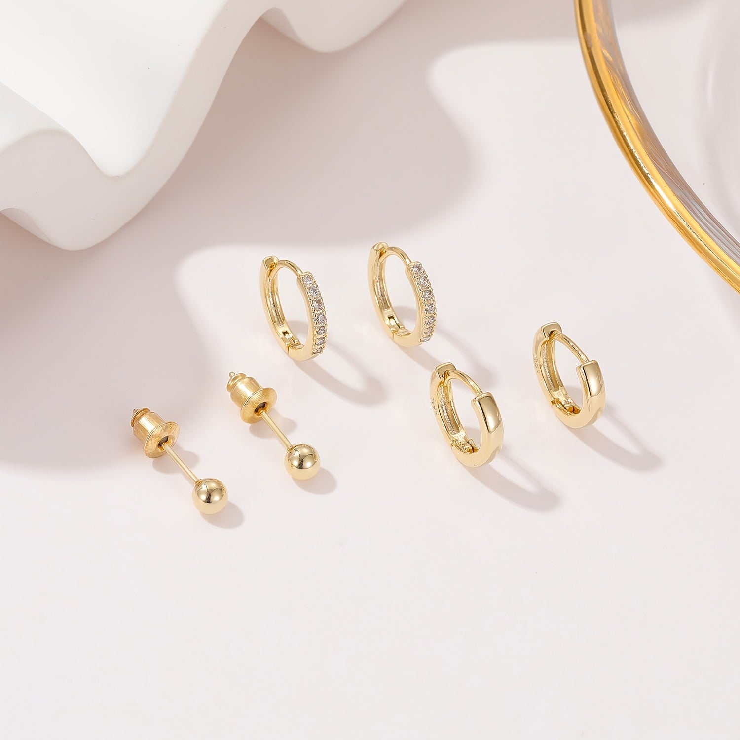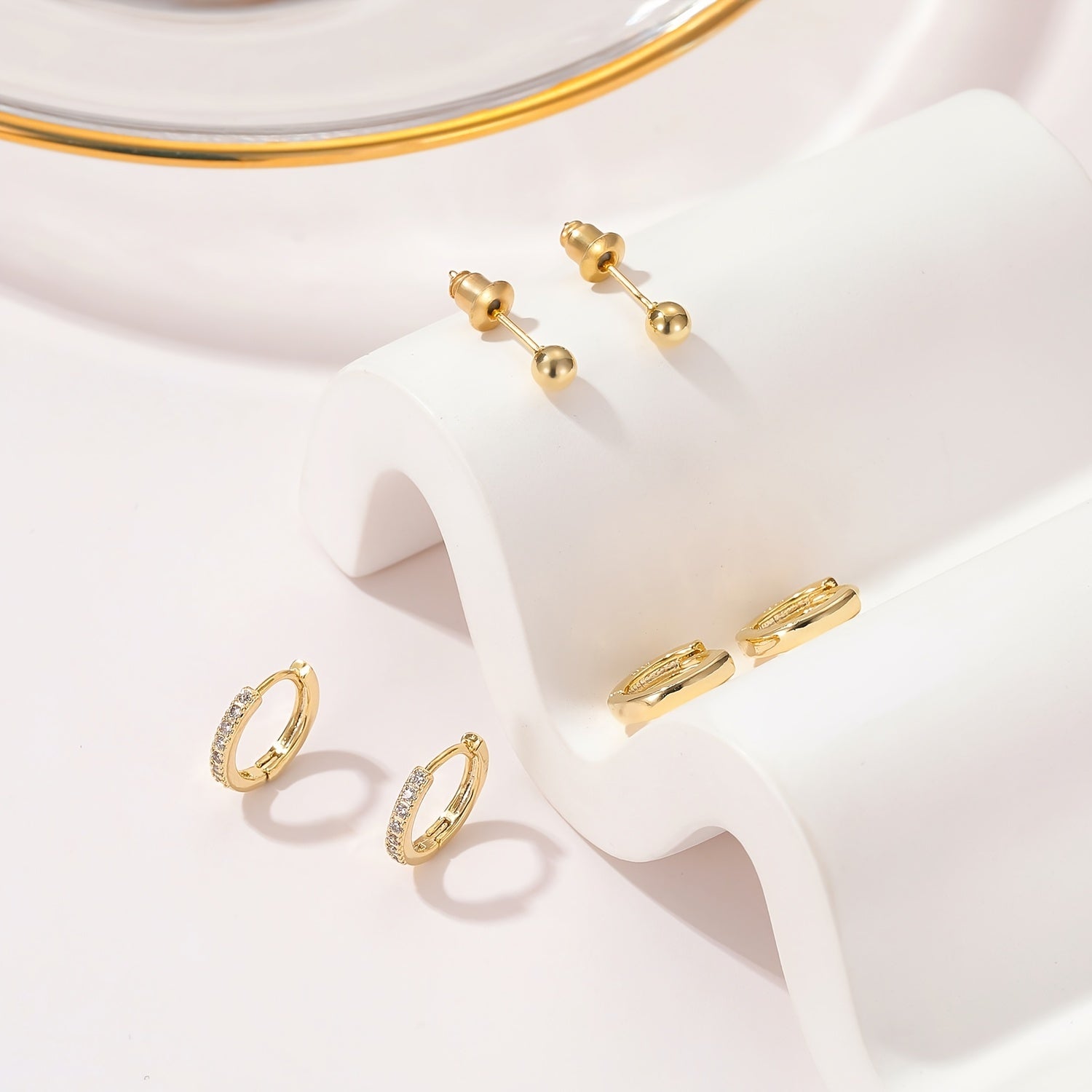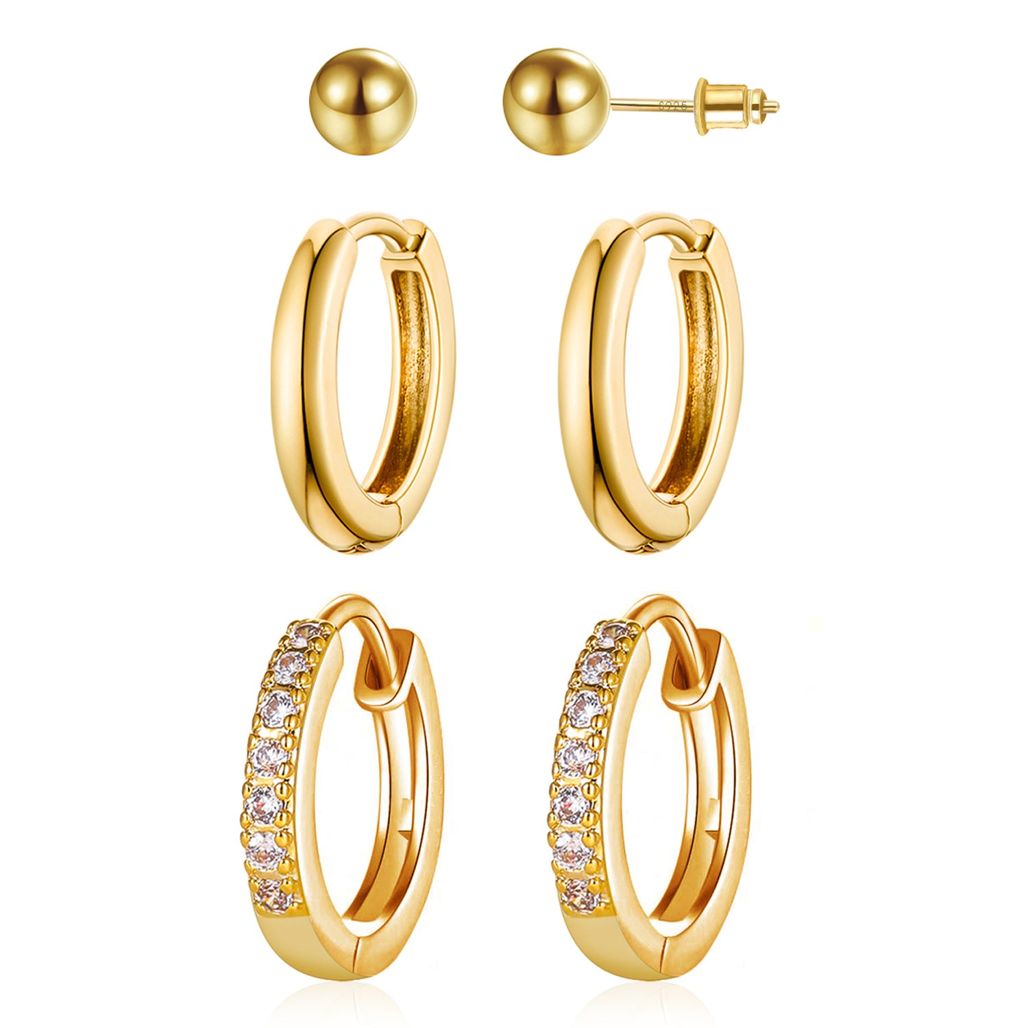 Add a touch of elegance with this set of 3 pairs of earrings featuring ball stud, small huggie hoop, and 14K plated designs.