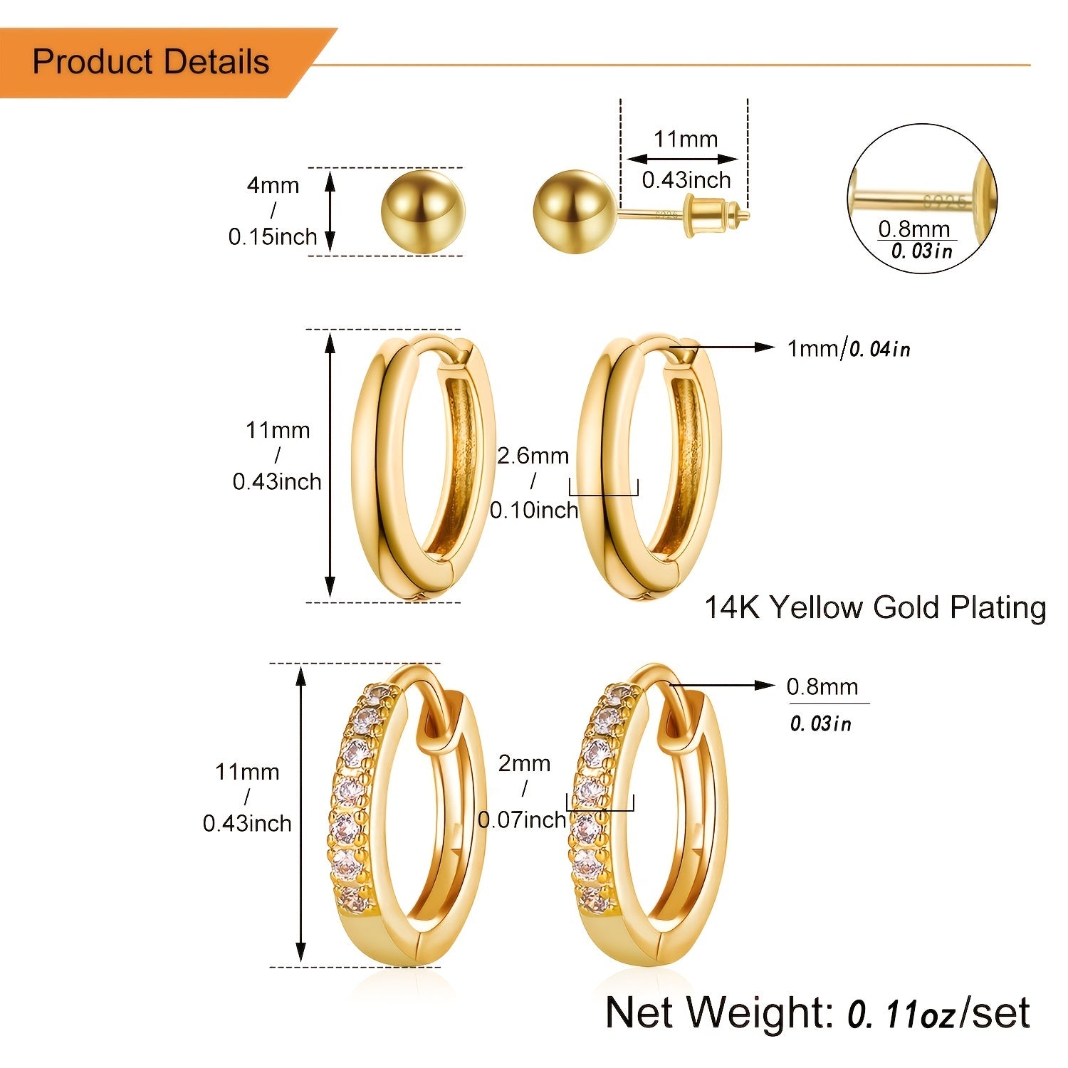 14K Plated Ball Stud Earring Small Huggie Hoop 3Pairs Set