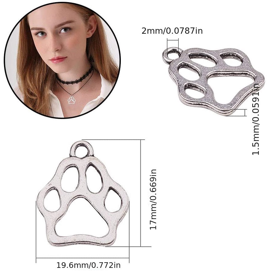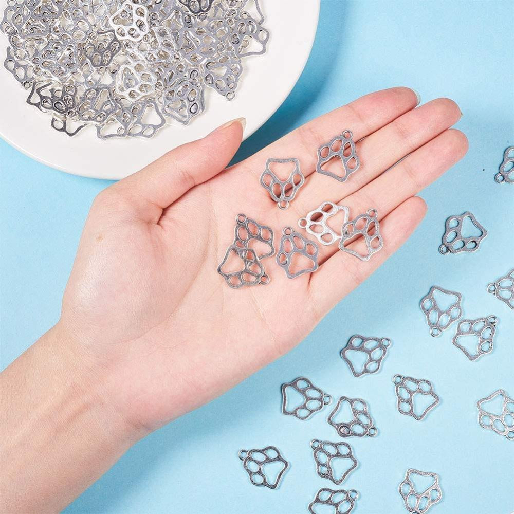 This box contains around 150 antique silvery hollow dog paw prints pendants made of zinc alloy with a 2mm hole, perfect for creating necklaces and bracelets.