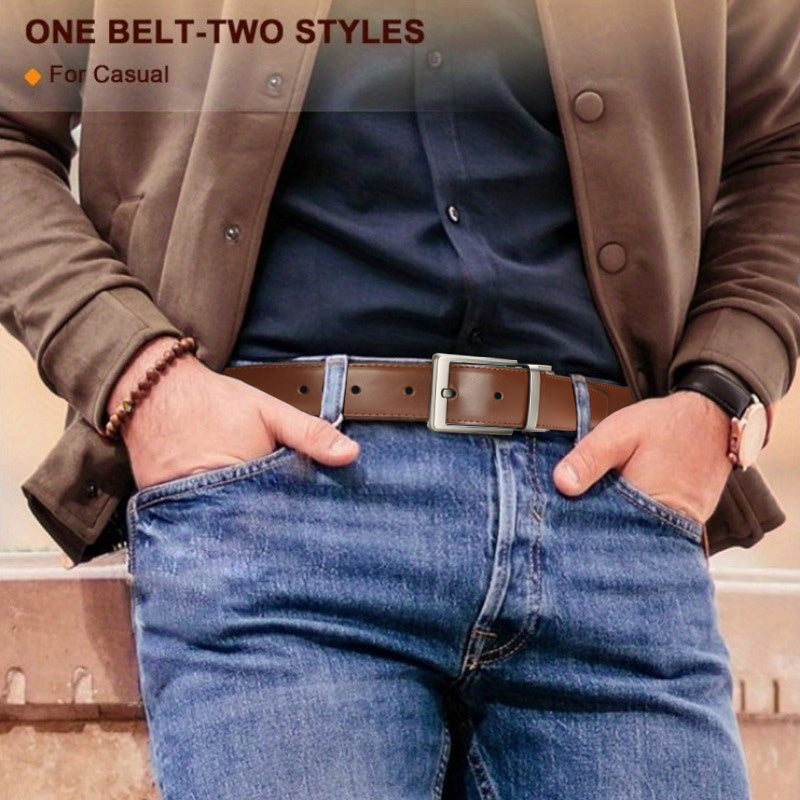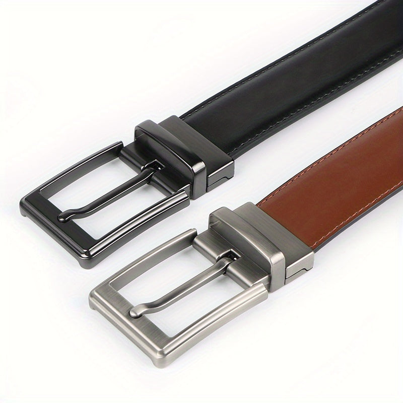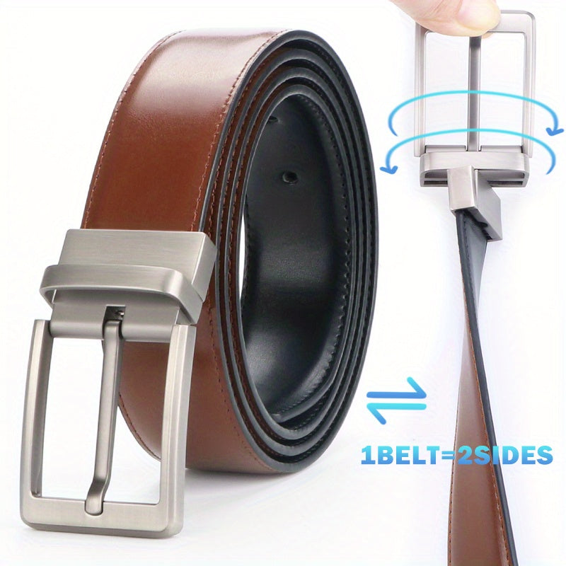 2pcs Men's Leather Belts Rotating Pin Buckle Double Sided Wear Brown