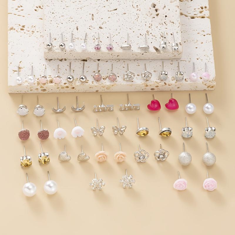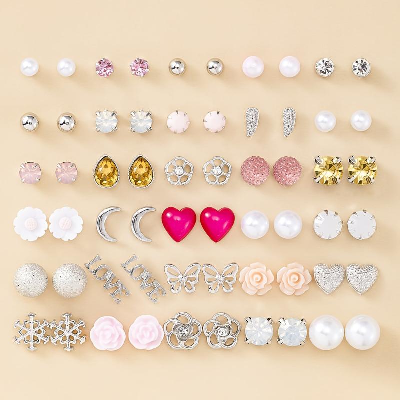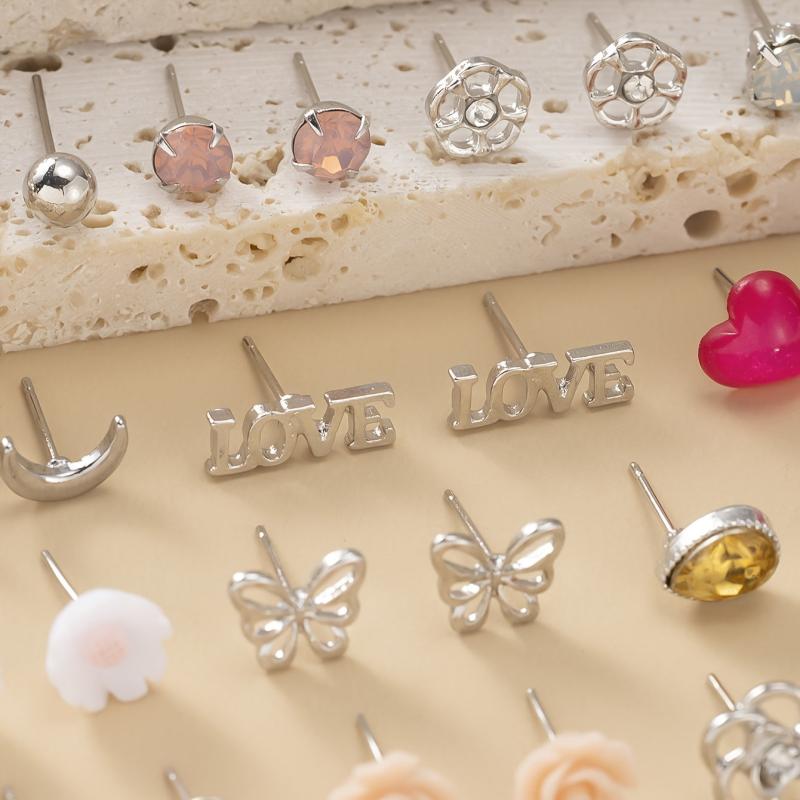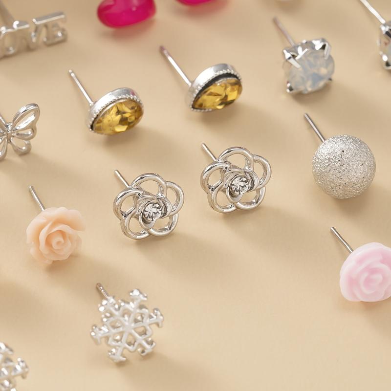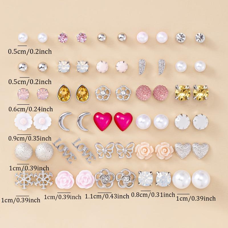 This set includes 30 pairs of metal and resin earrings in various designs such as heart, moon, rhinestone, and rose flower. Perfect for accessorizing during vacation or as a holiday gift.