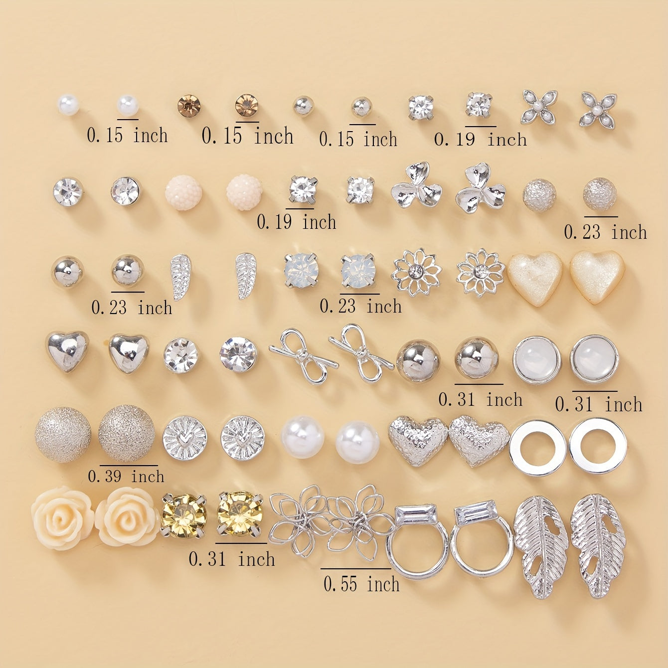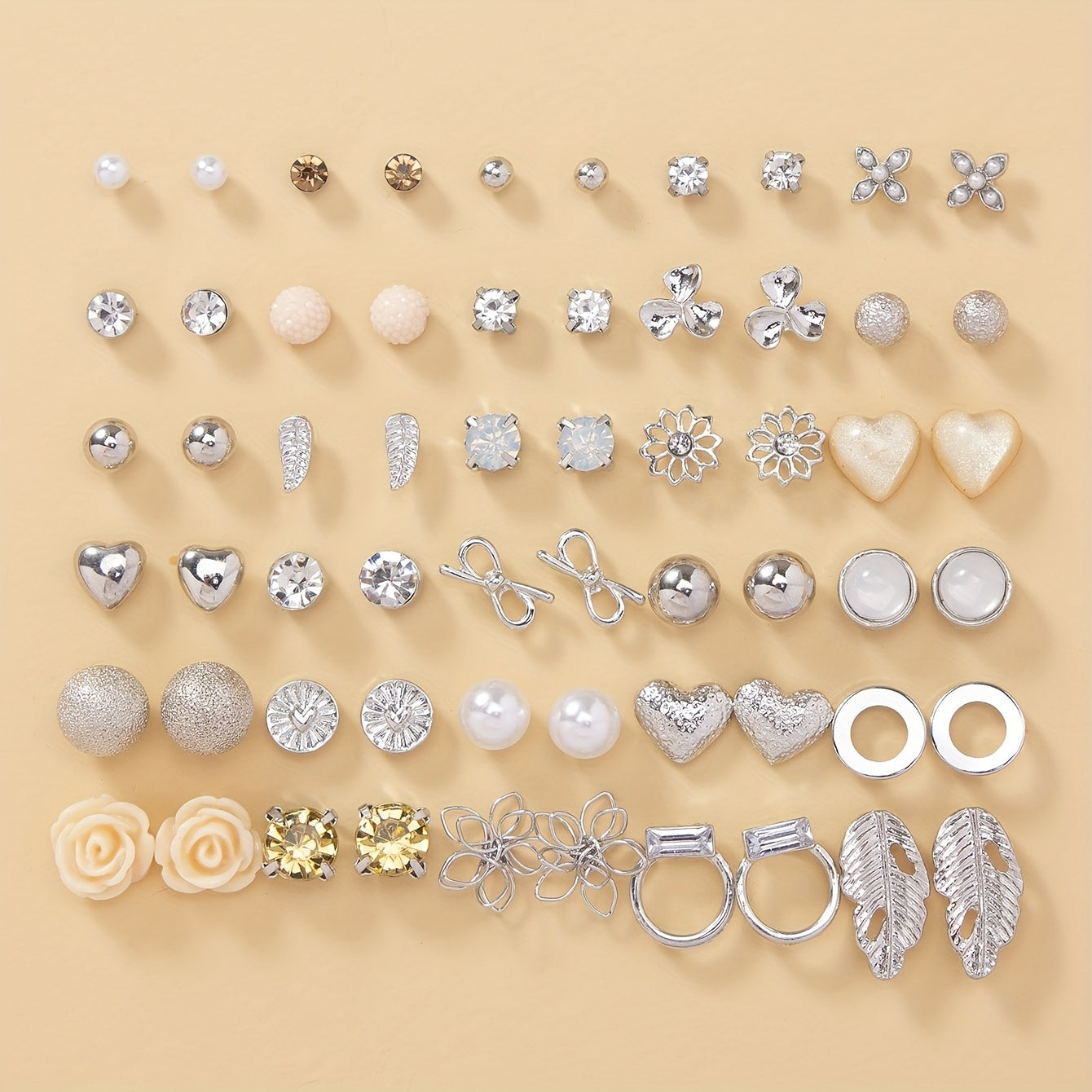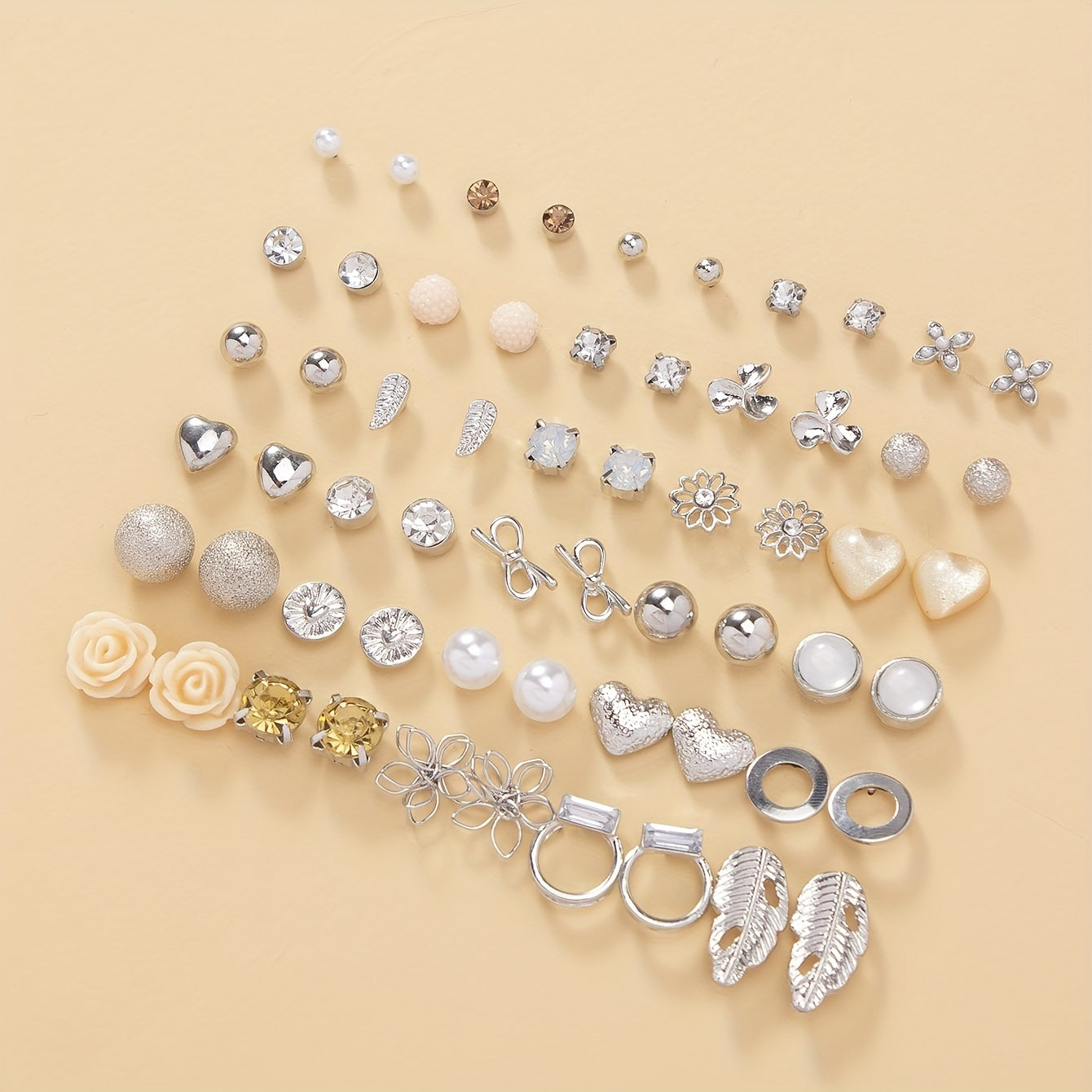 This set includes 30 pairs of stud earrings featuring rhinestones, hearts, flowers, pearls, and leaves. Perfect for adding a touch of elegance to any outfit.