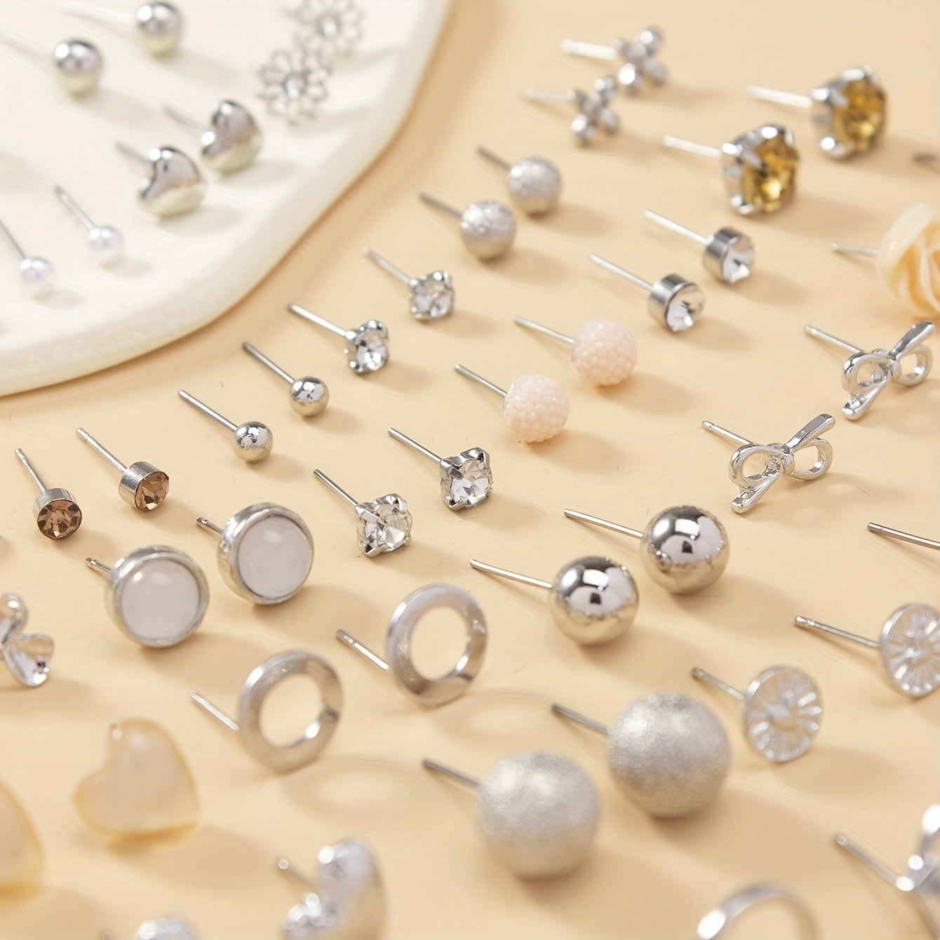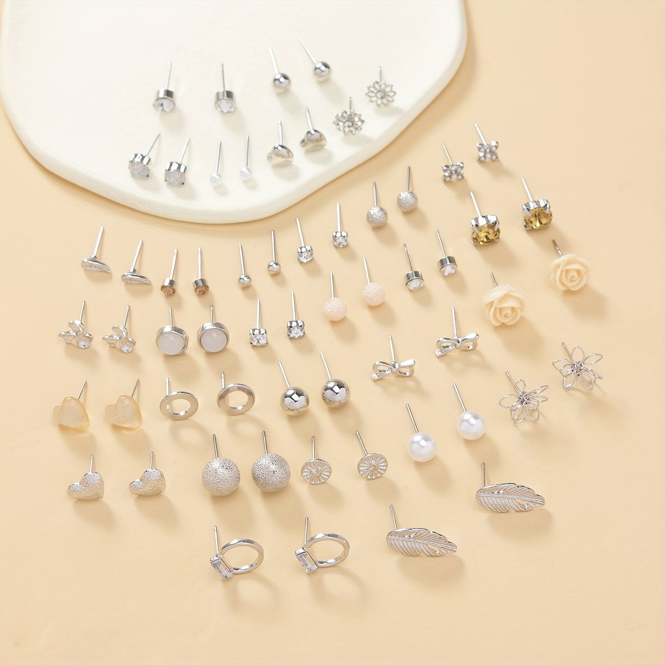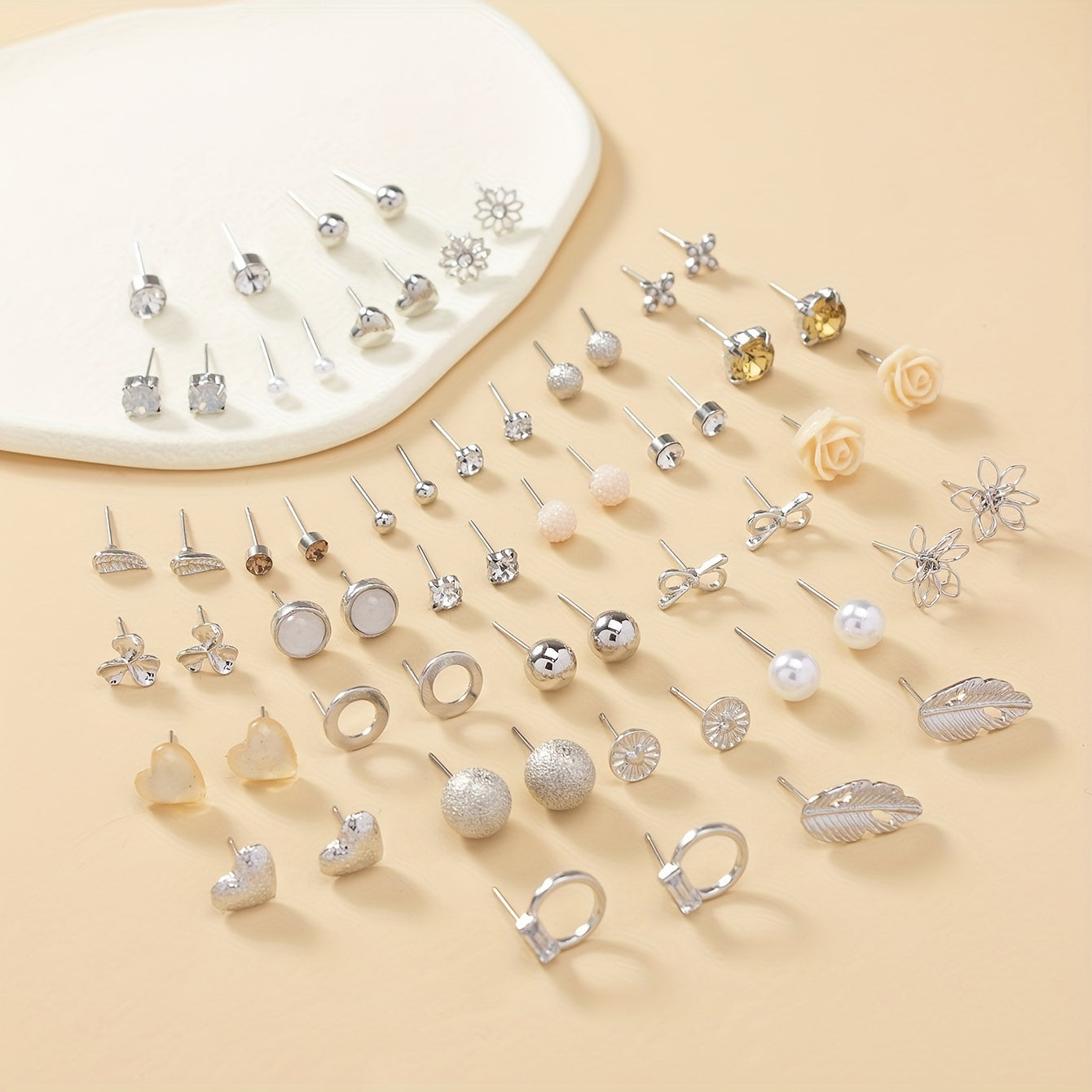This set includes 30 pairs of stud earrings featuring rhinestones, hearts, flowers, pearls, and leaves. Perfect for adding a touch of elegance to any outfit.