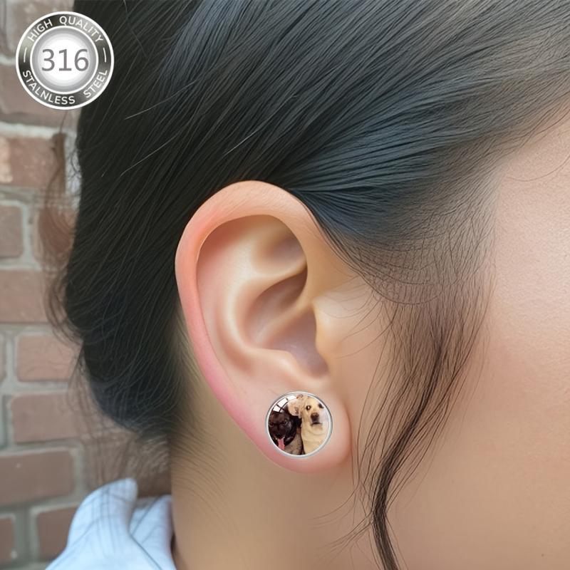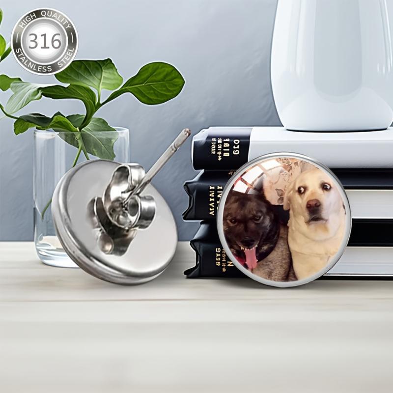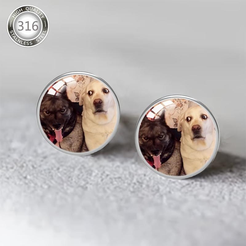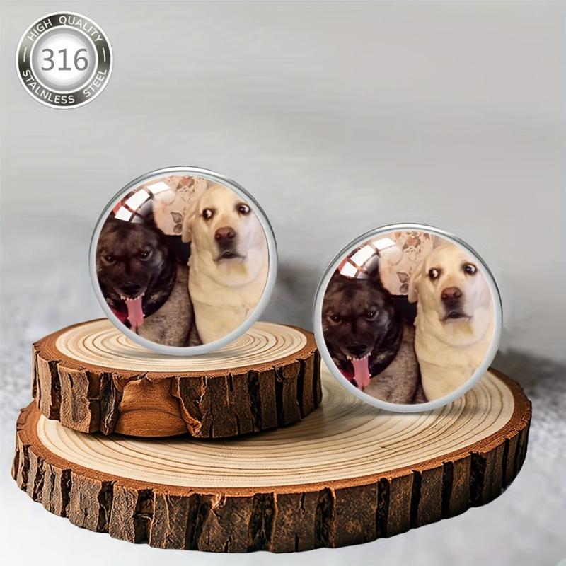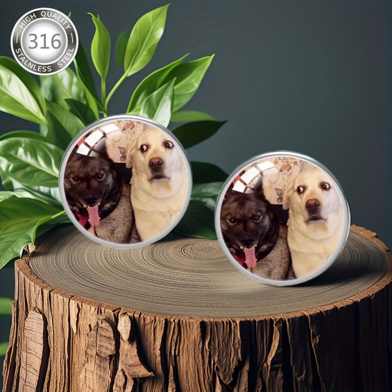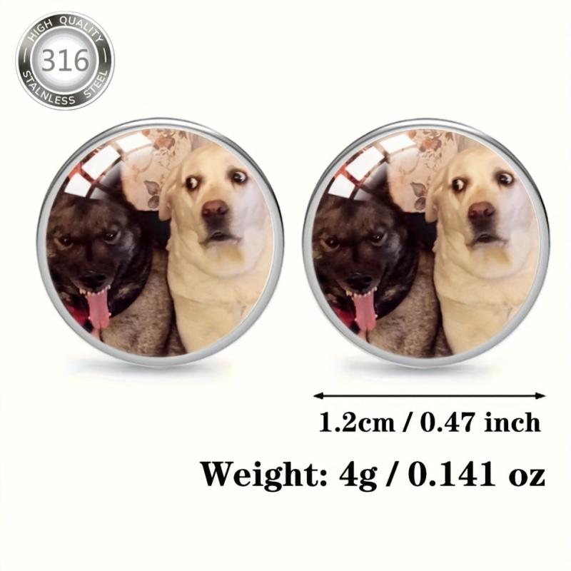 These hypoallergenic stainless steel dog couple earrings feature a convex glass inlay animal design. Perfect for daily wear and parties, they make a great jewelry gift for pet enthusiasts.