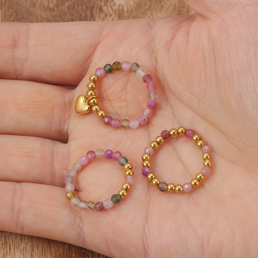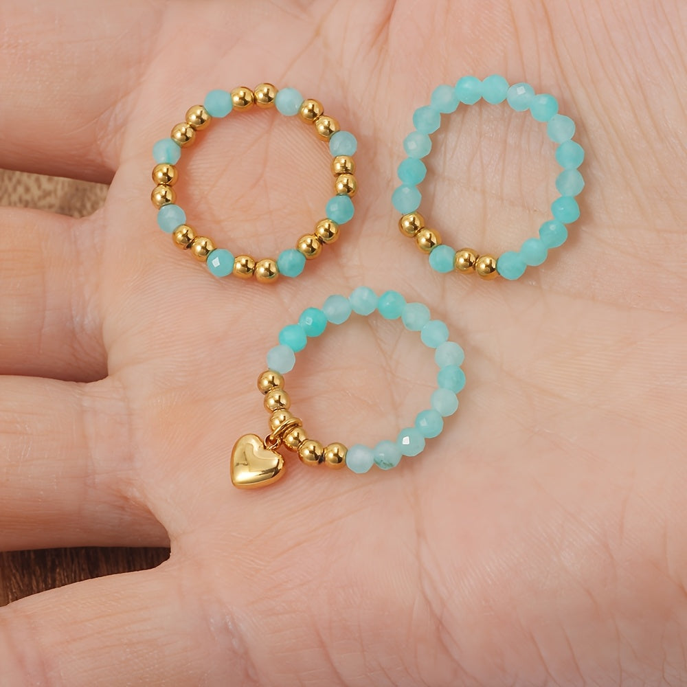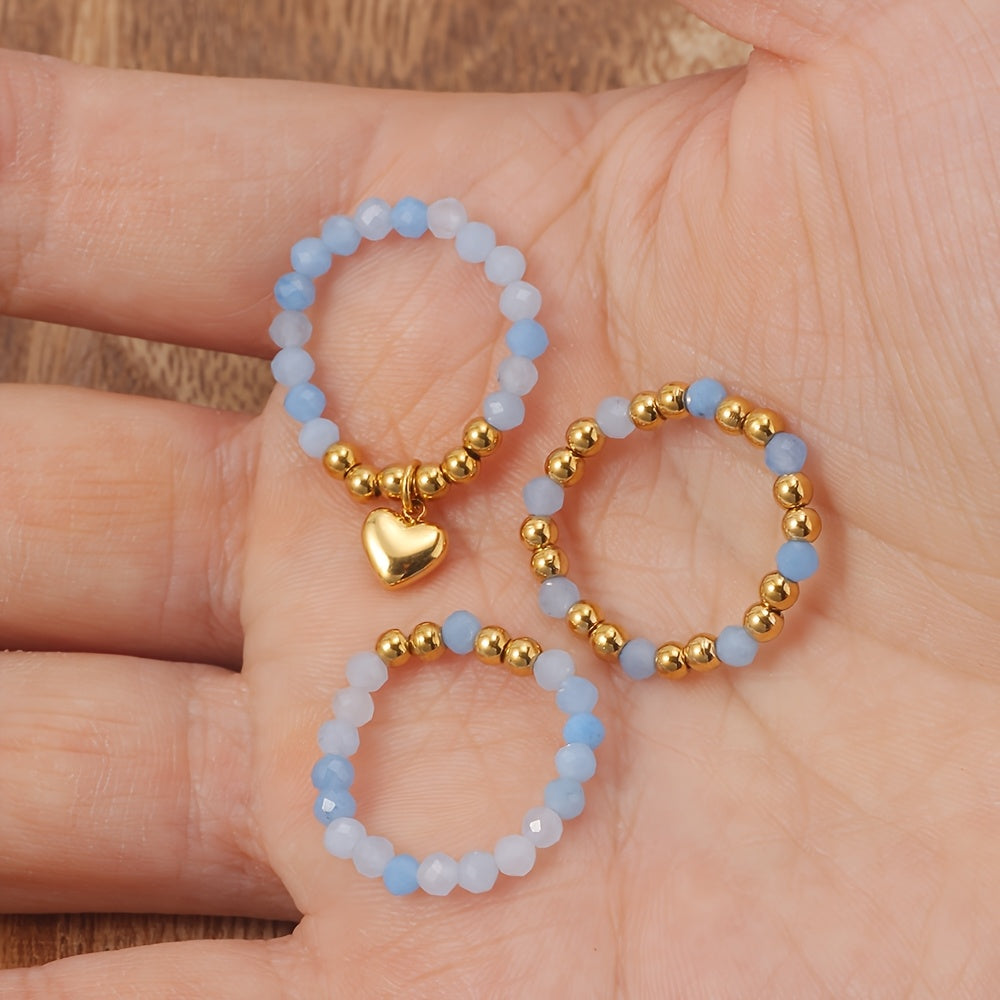 3pcs Rainbow Beaded Stretch Rings Set Heart Charm Pendant Elastic Finger Rings
