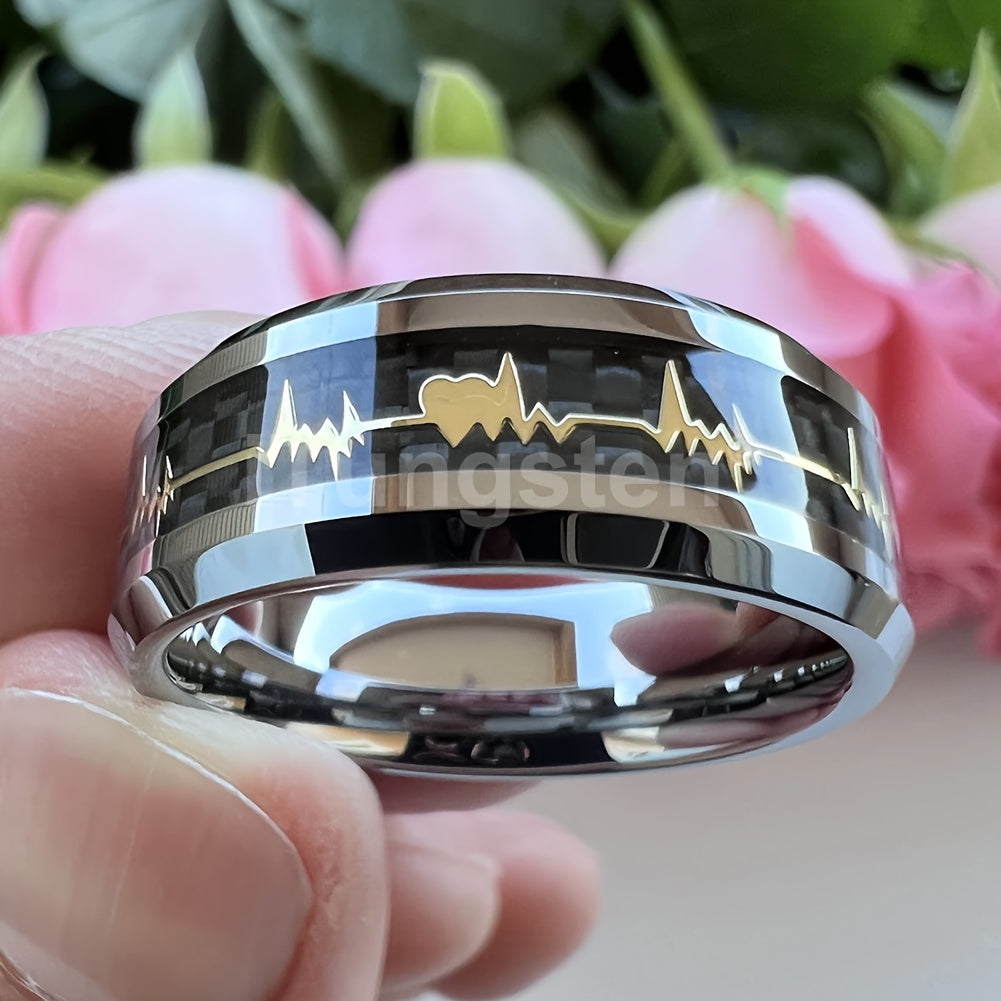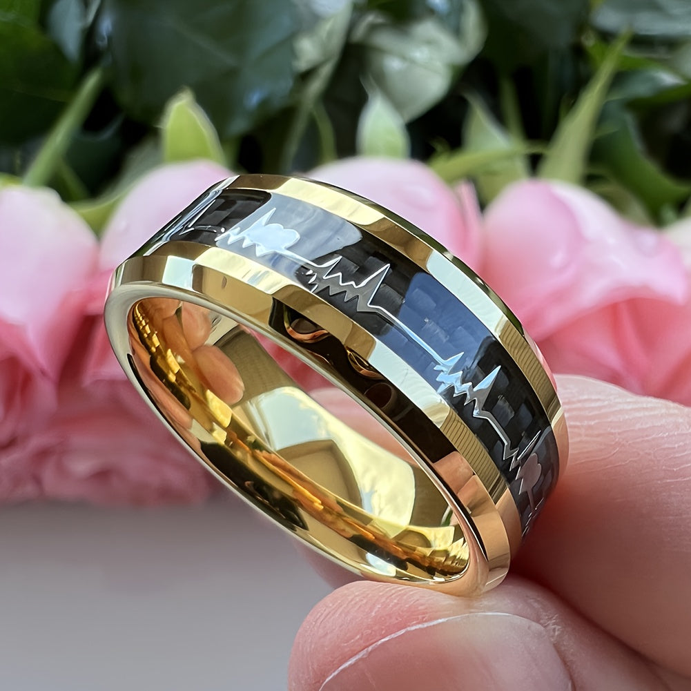 This set includes 4 Hawaiian inspired stainless steel rings with carbon fiber and fire inlaid details. Perfect for Valentine's Day or any special occasion.
