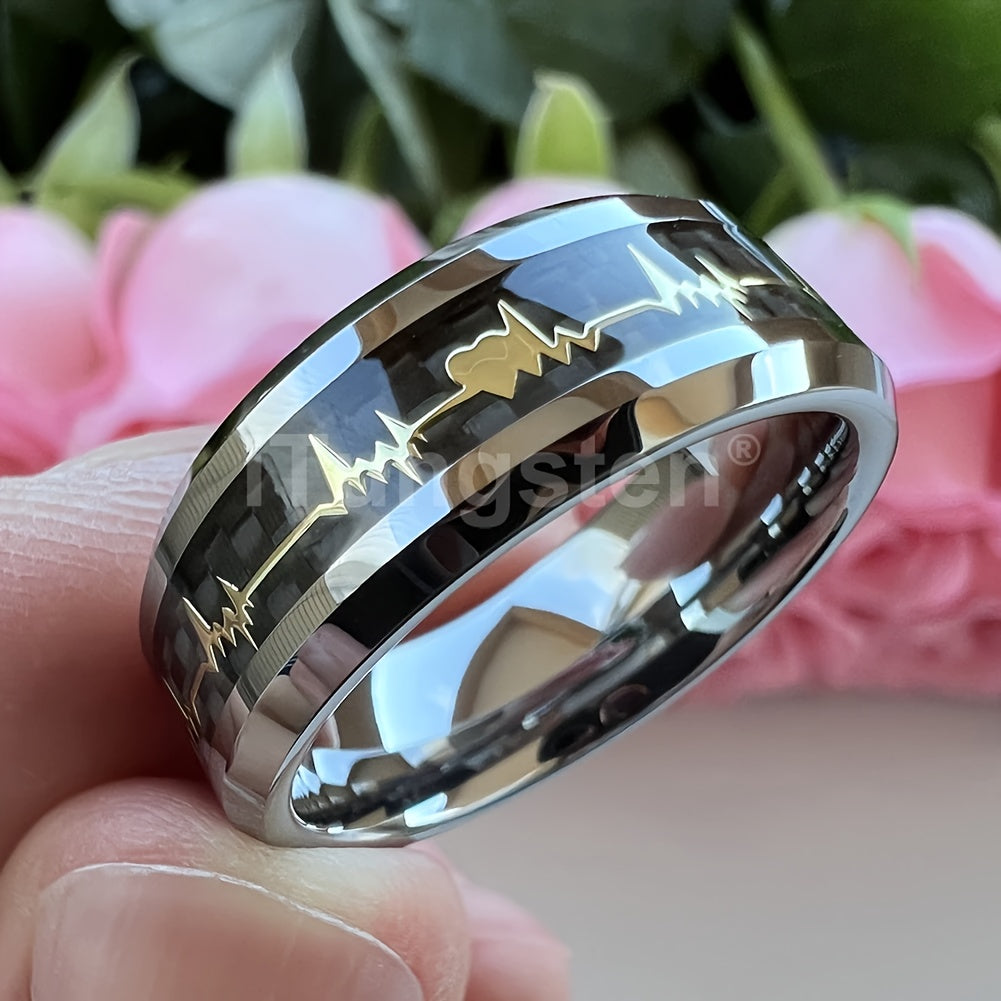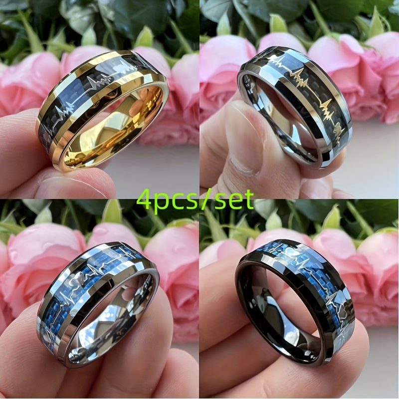 4pcs Set 8mm Hawaiian Stainless Steel Rings Carbon Fiber Inlaid Wedding Bands