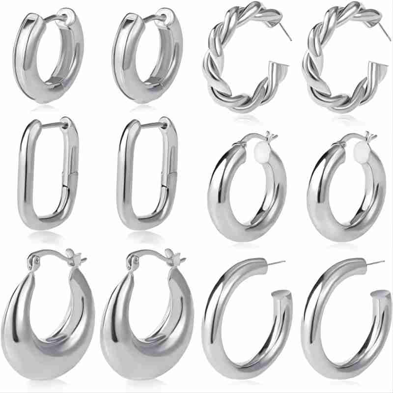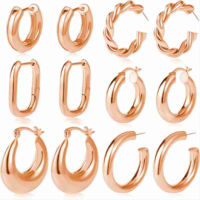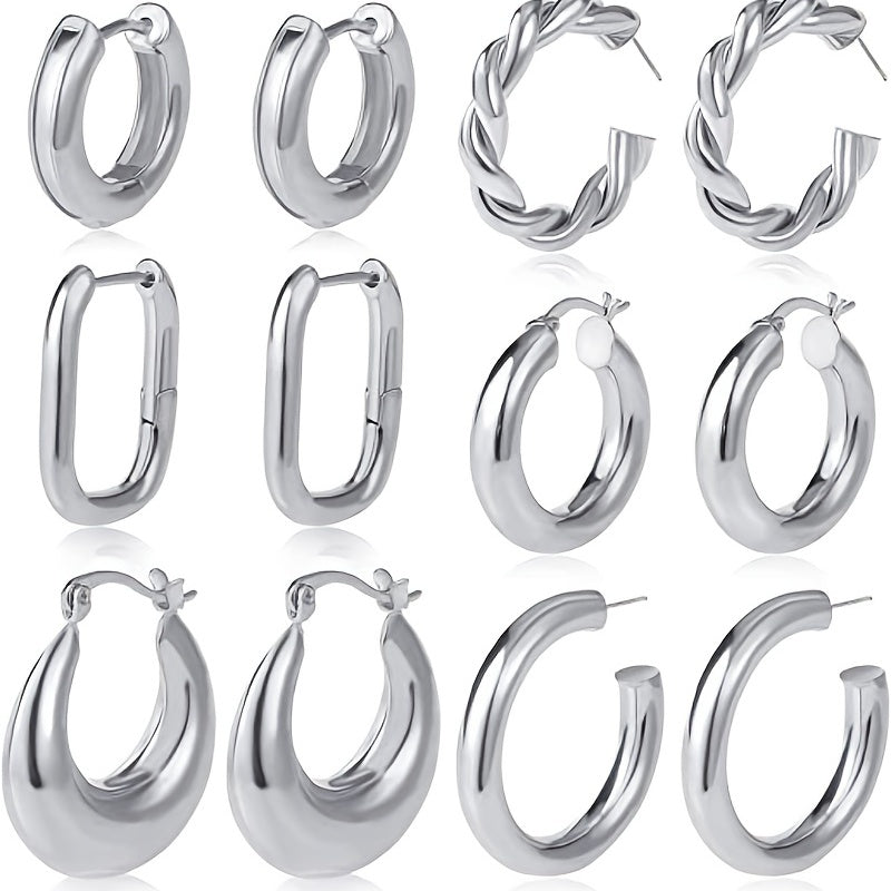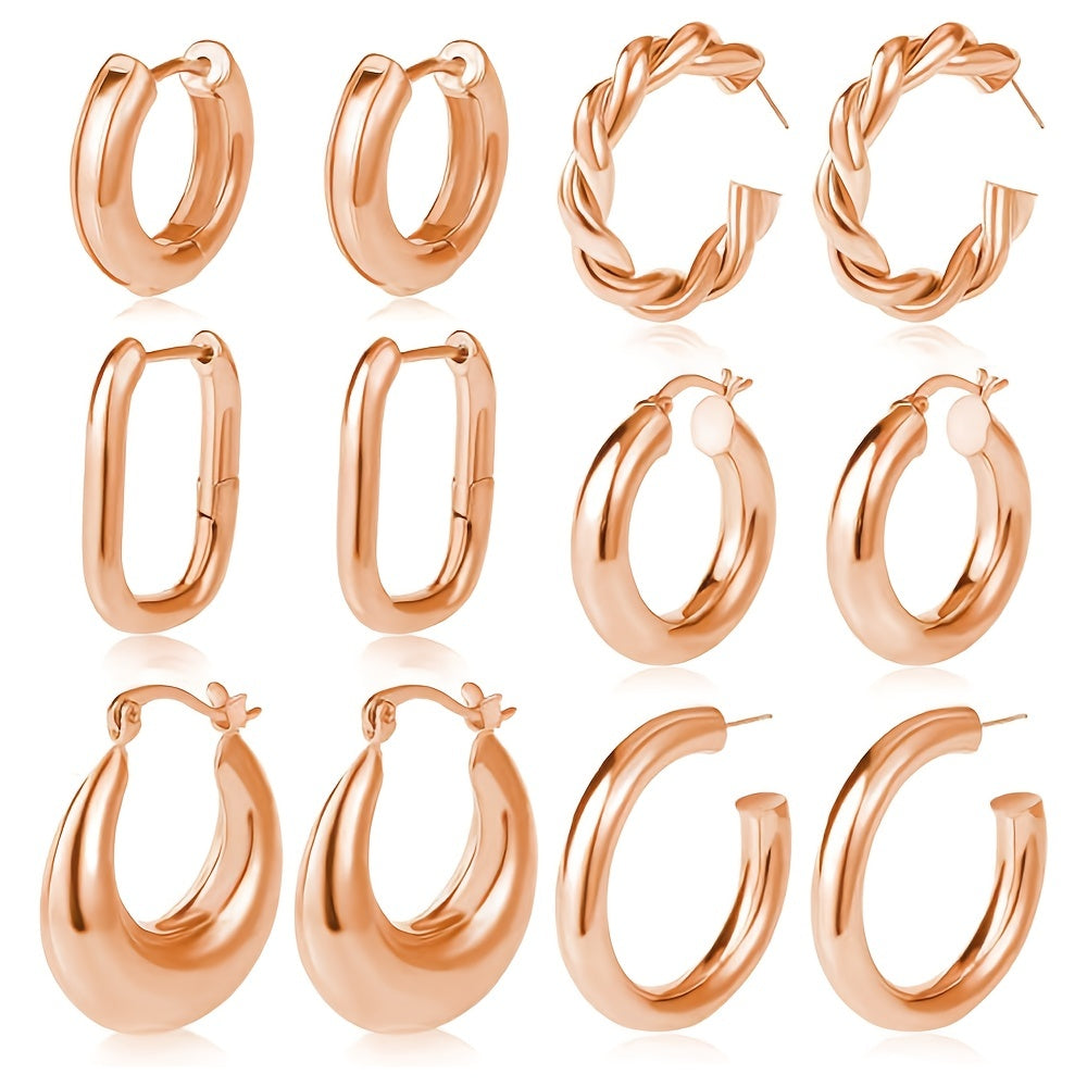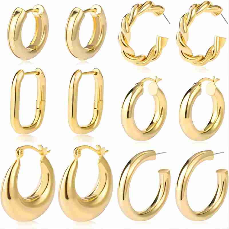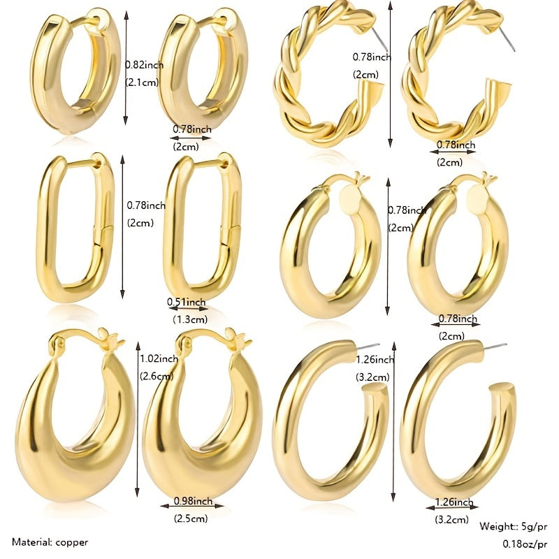 Get this set of 6 pairs of C-shaped chunky hoop earrings plated with 18K gold for women and girls. A perfect gift for any occasion!