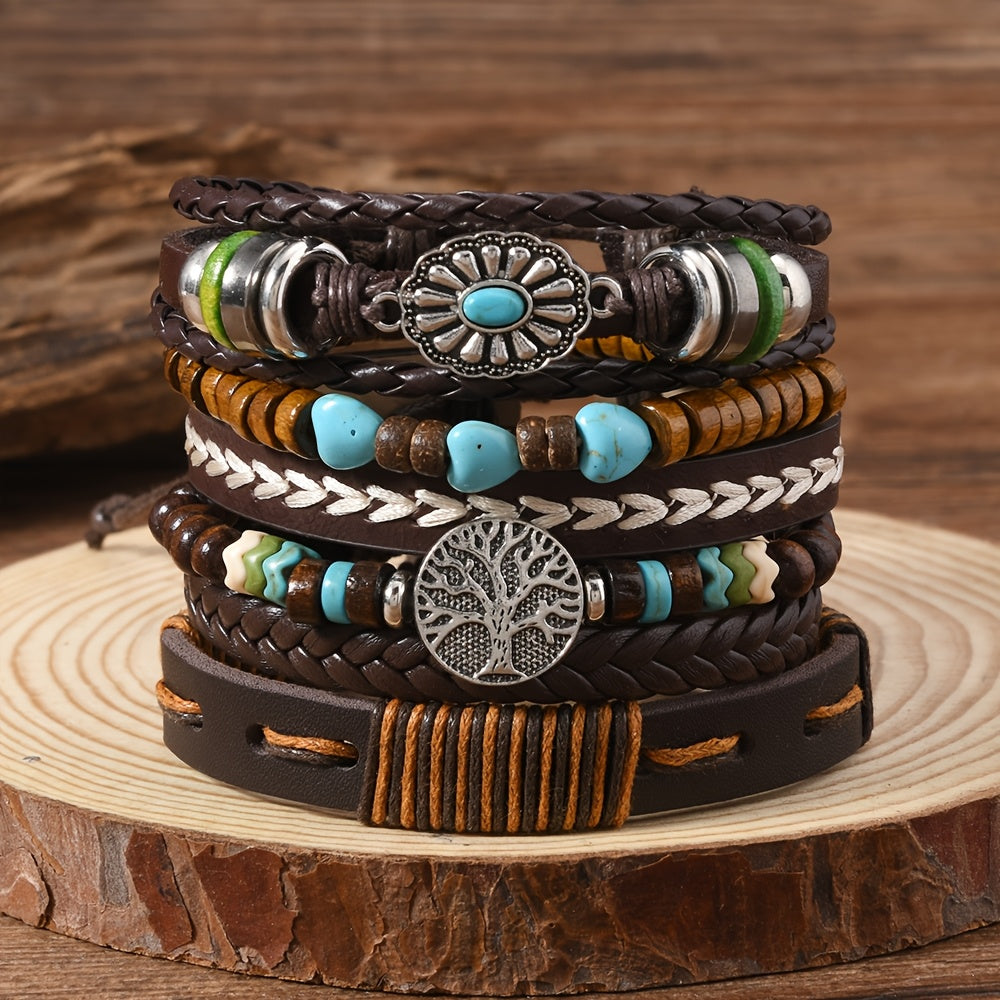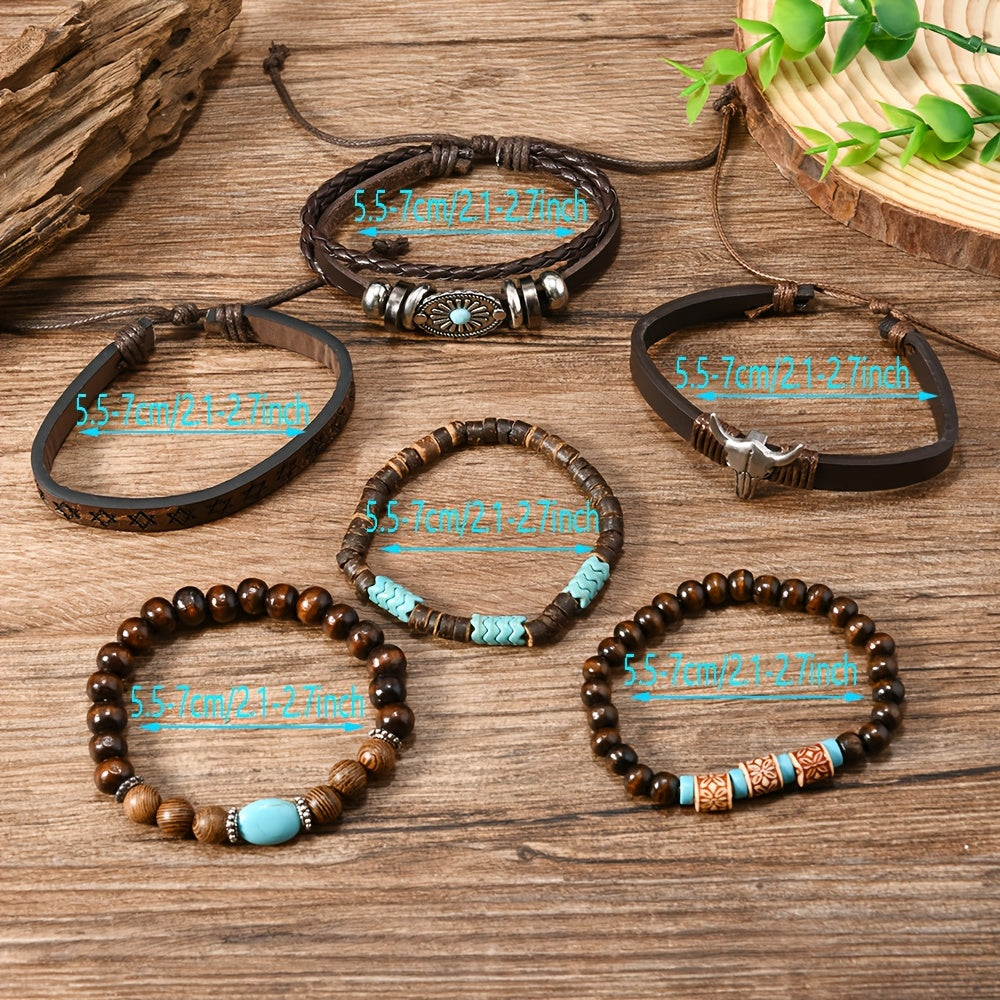 This 6-piece set of men's bracelets features a turquoise bull head design on faux leather layers for an ethnic outdoor wear style. It makes a great gift for men who appreciate unique accessories.