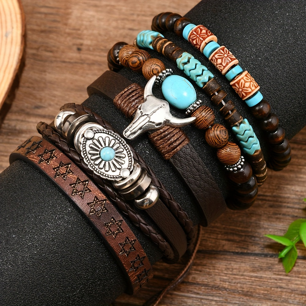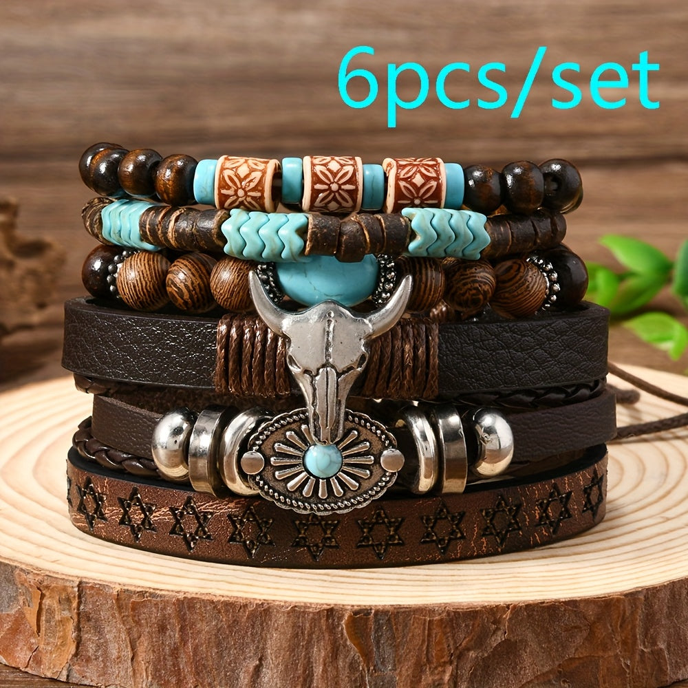 6pcs Men's Turquoise Bull Head Bracelet Layer Ethnic Style Gift
