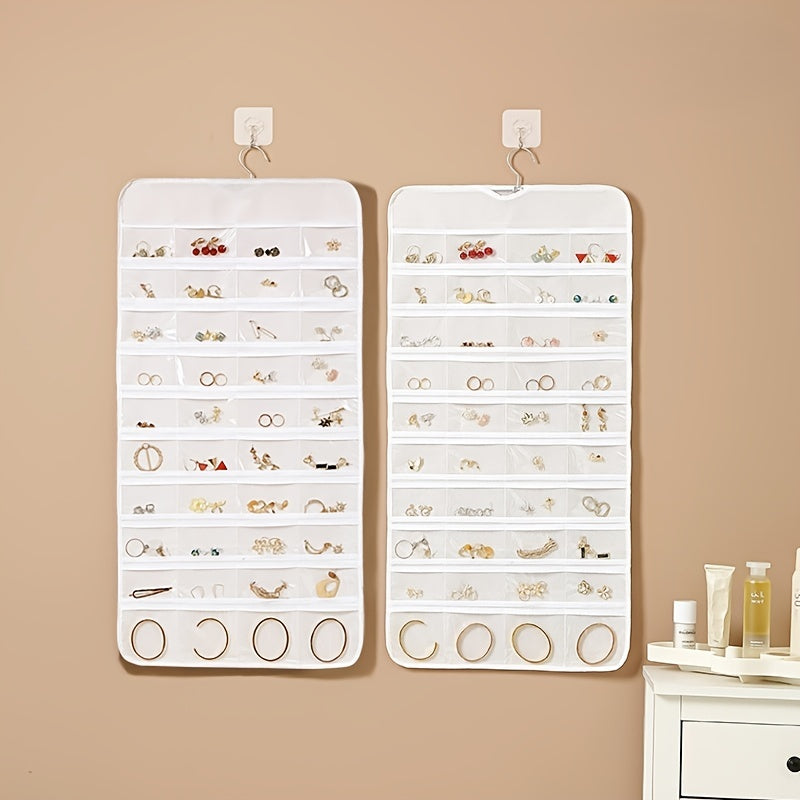 Keep your jewelry organized and easily accessible with this two-tier fabric jewelry organizer. With 80 pockets, it offers plenty of space for earrings, necklaces, bracelets, rings, and more.