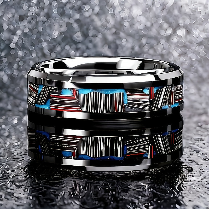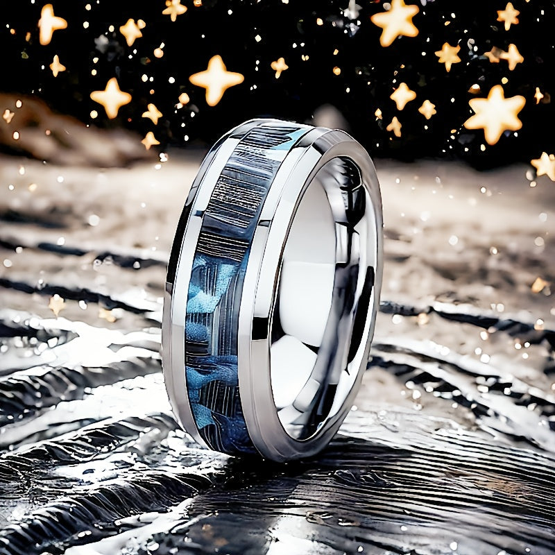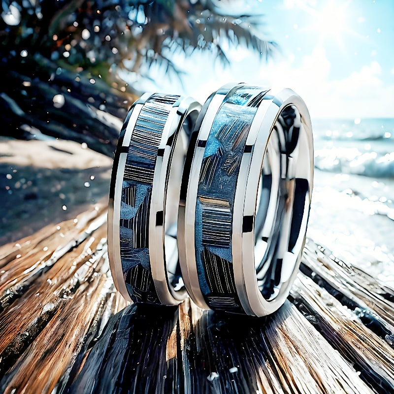 This stylish ring features a unique design with silvery ceramic inlay. Perfect for engagements, weddings, and as a couple's ring.
