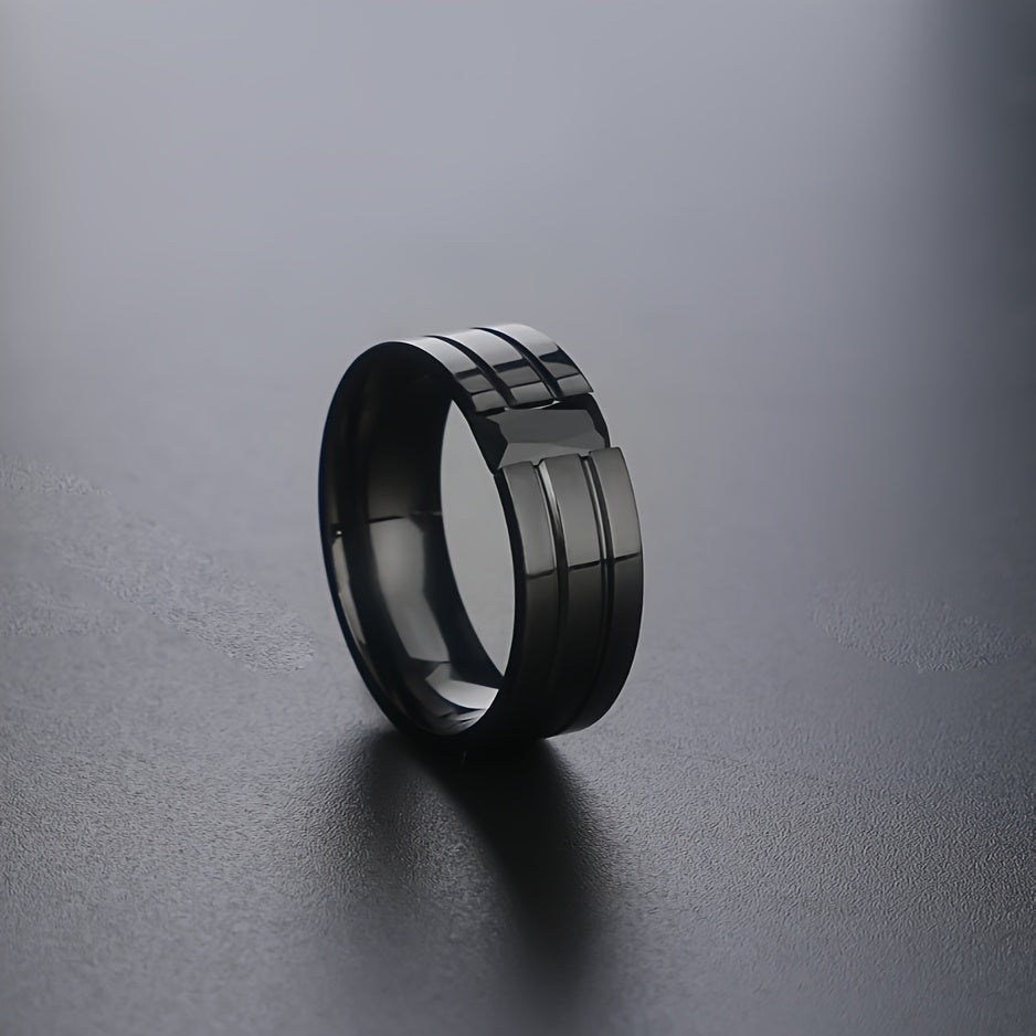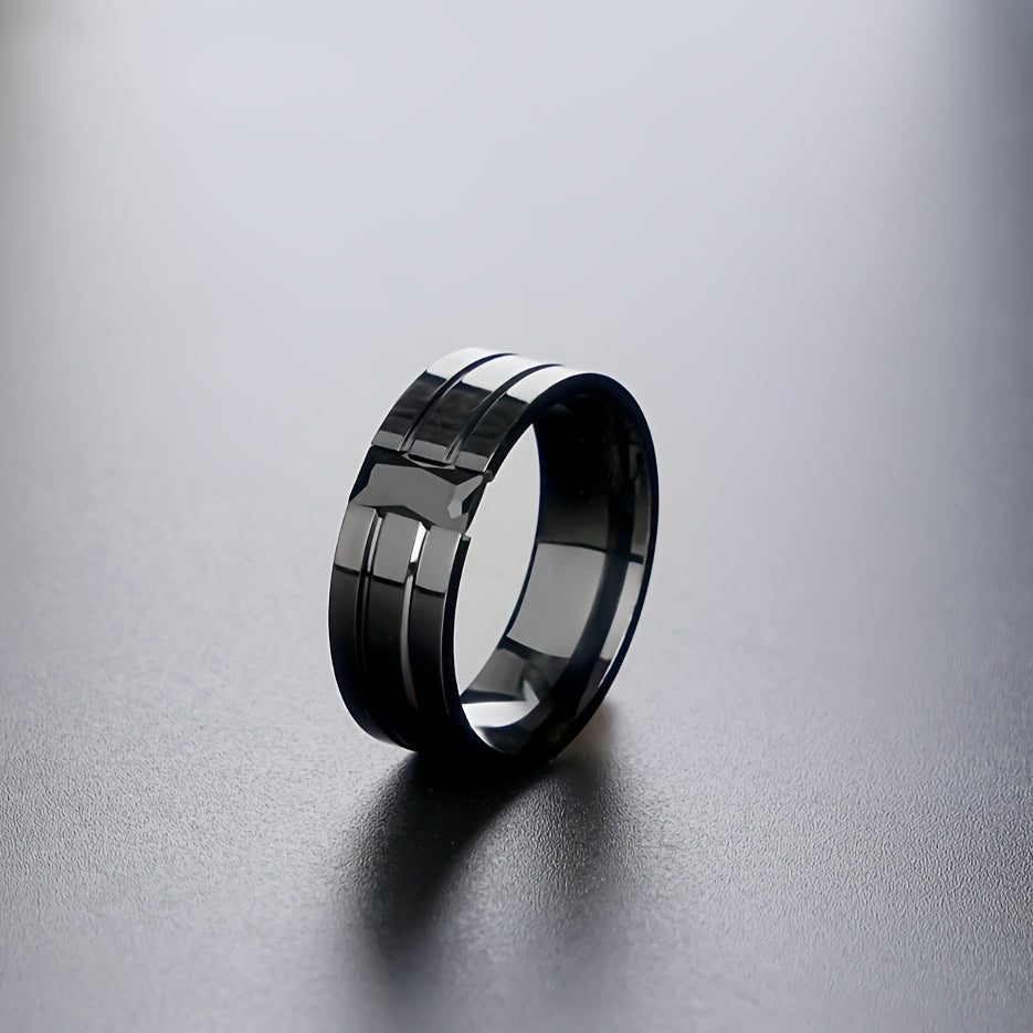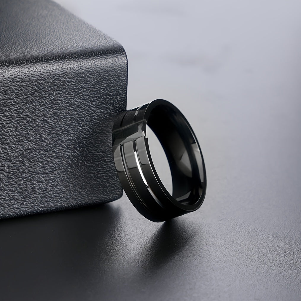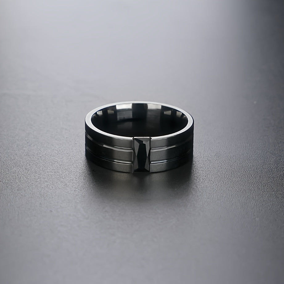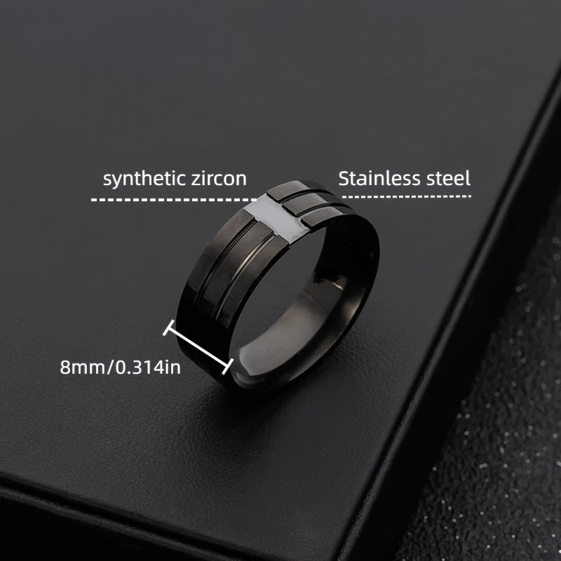 This 8mm wide ring is made of titanium and 304 stainless steel, suitable for both men and women. It features a minimalist modern design with synthetic zircon high G.