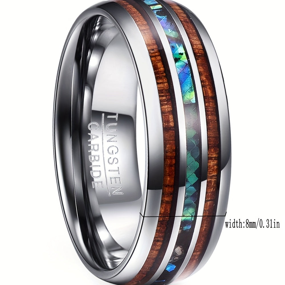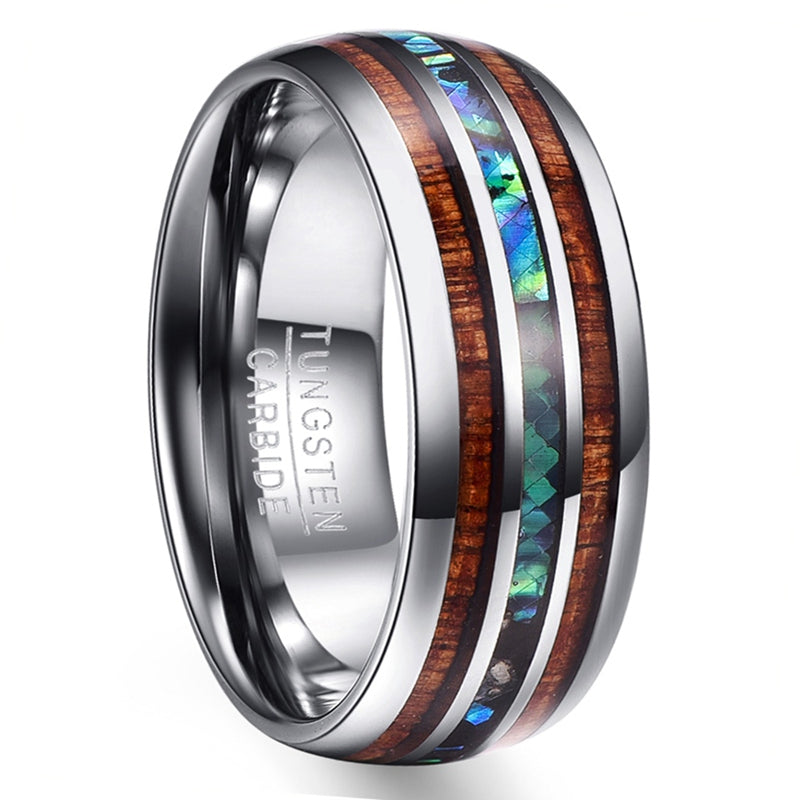 This men's tungsten ring features an inlaid wood grain abalone pattern. Available in sizes 7 to 14.