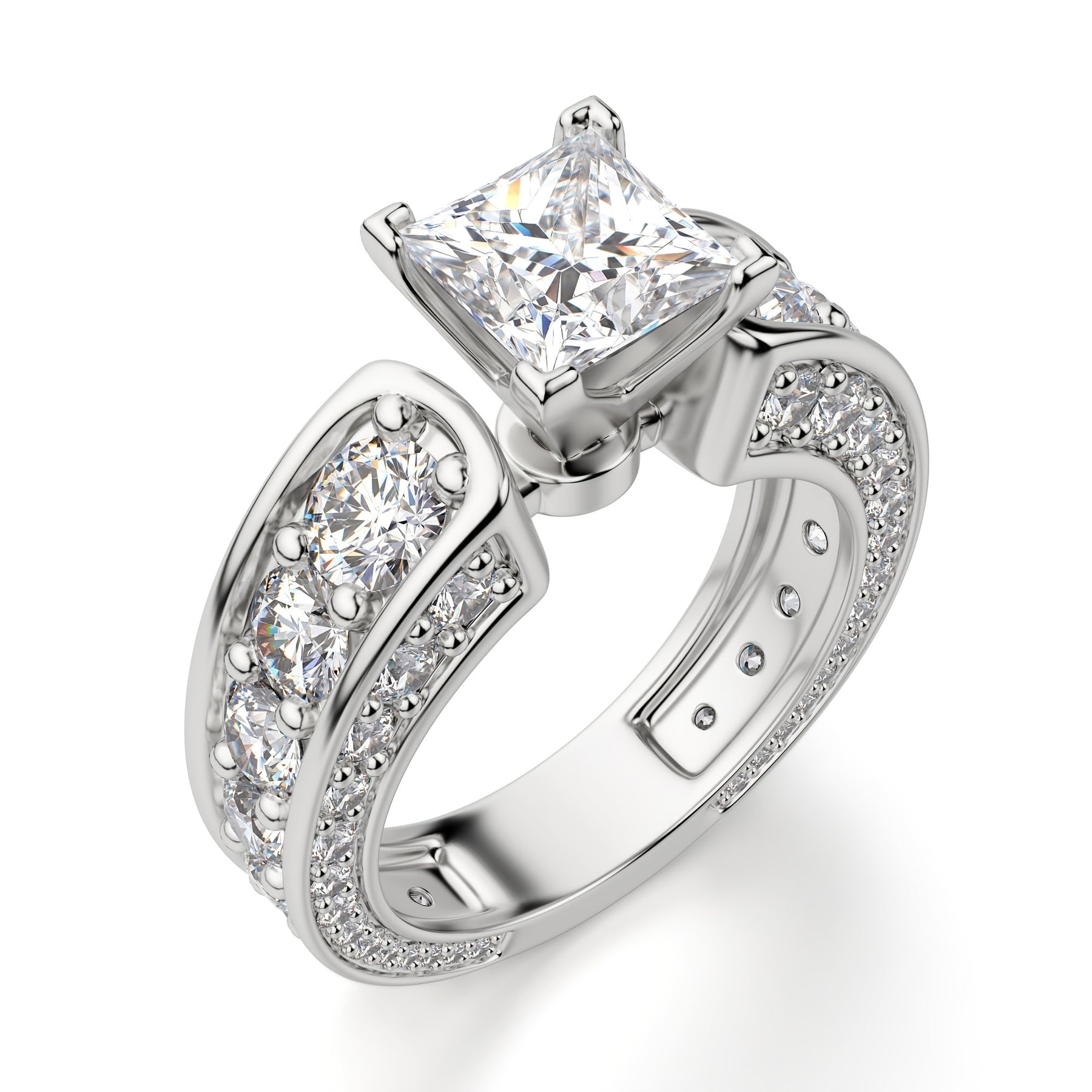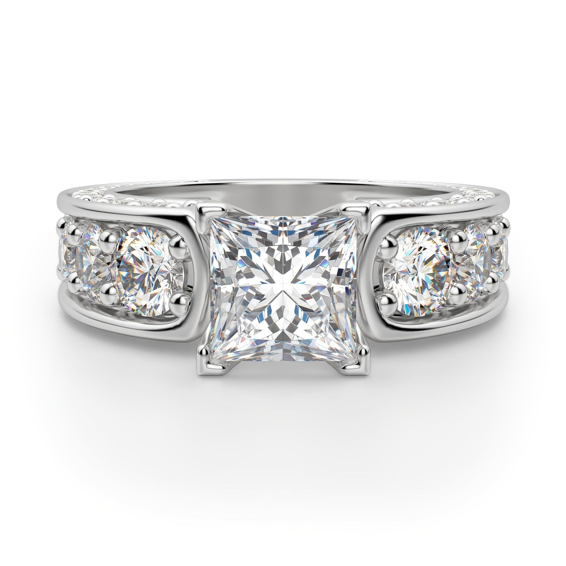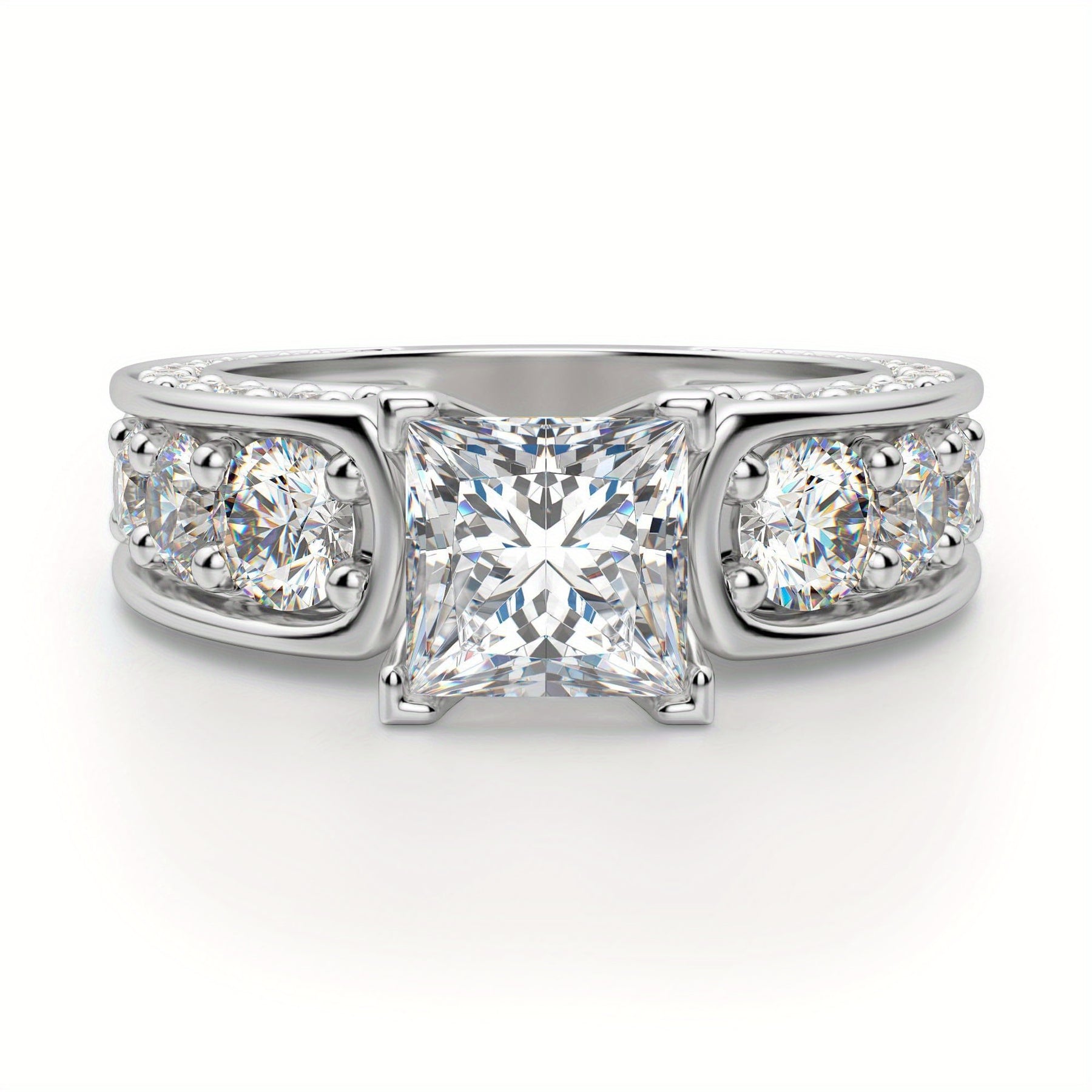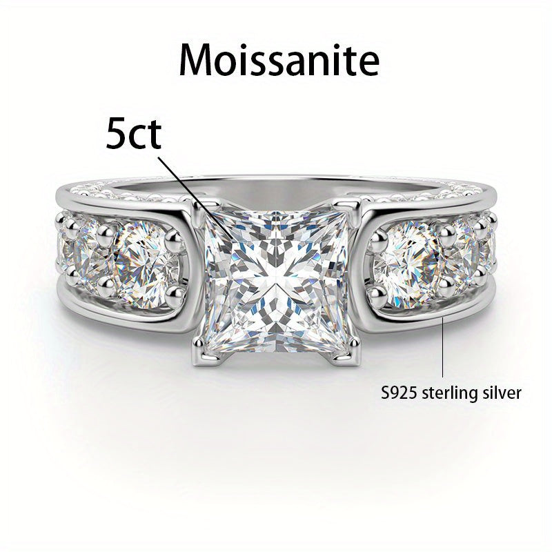 Make a statement with this elegant sterling silver ring featuring a 5 carat princess cut moissanite stone. Perfect for engagements, weddings, anniversaries, or promises.