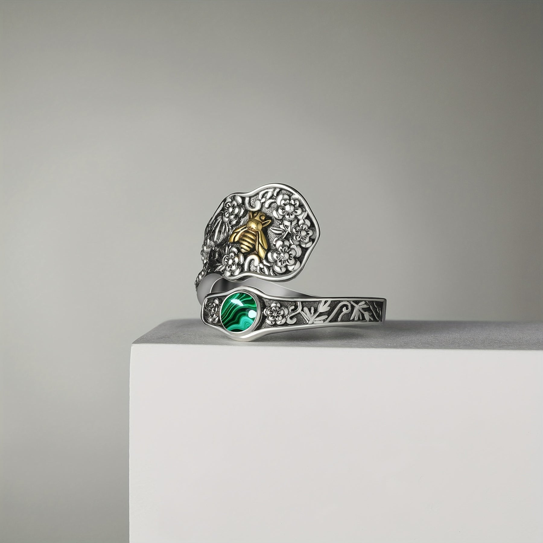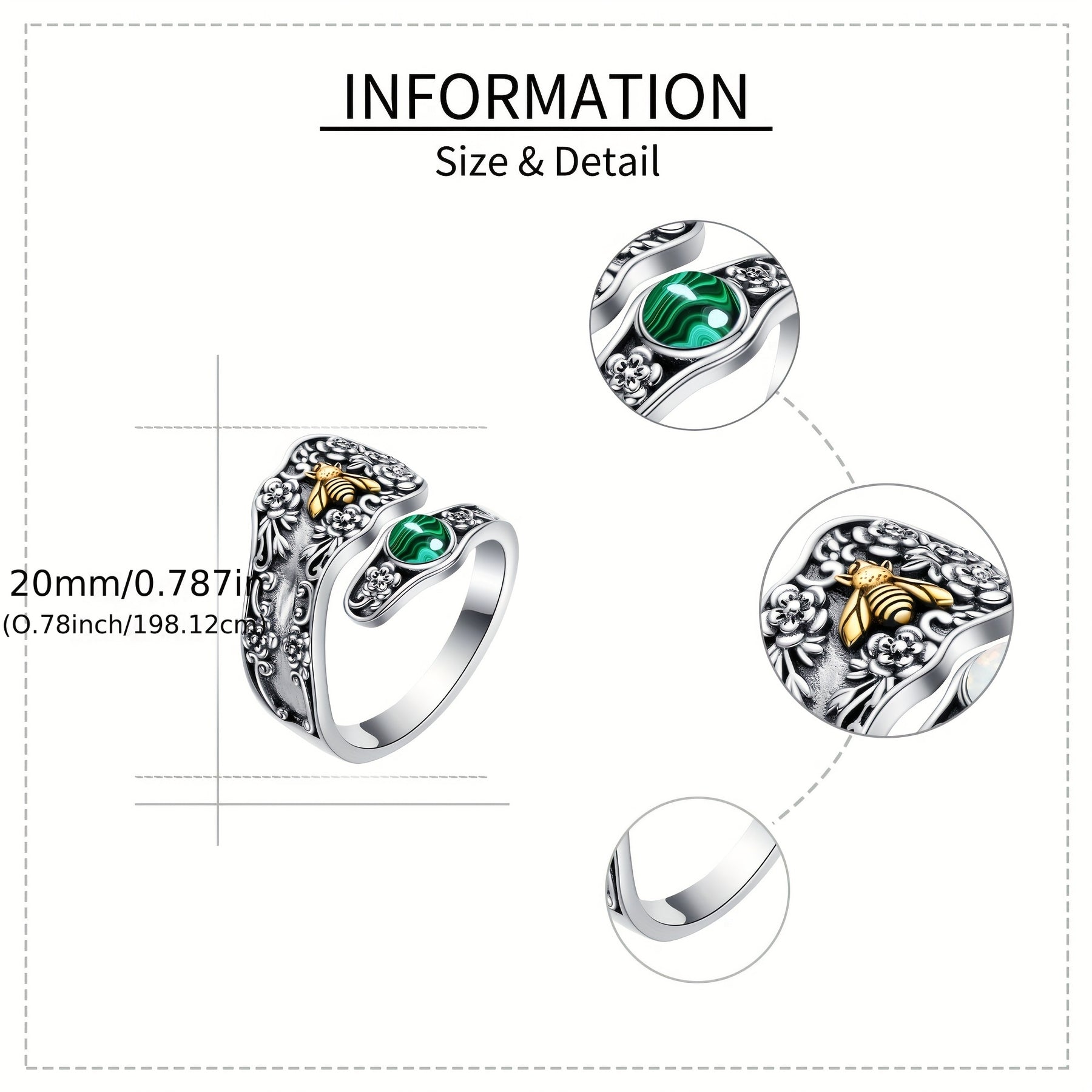 This stunning ring is made of 925 sterling silver with synthetic malachite, featuring a bee design and adjustable size. It is a perfect statement piece and great gift for women.