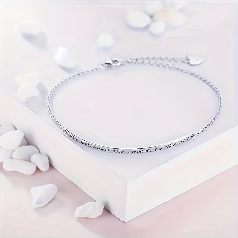 This 925 sterling silver engraved bracelet features an inspirational quote 'She Believed She Could So She Did'. It is perfect for daily wear and gift occasions like Valentine's Day.