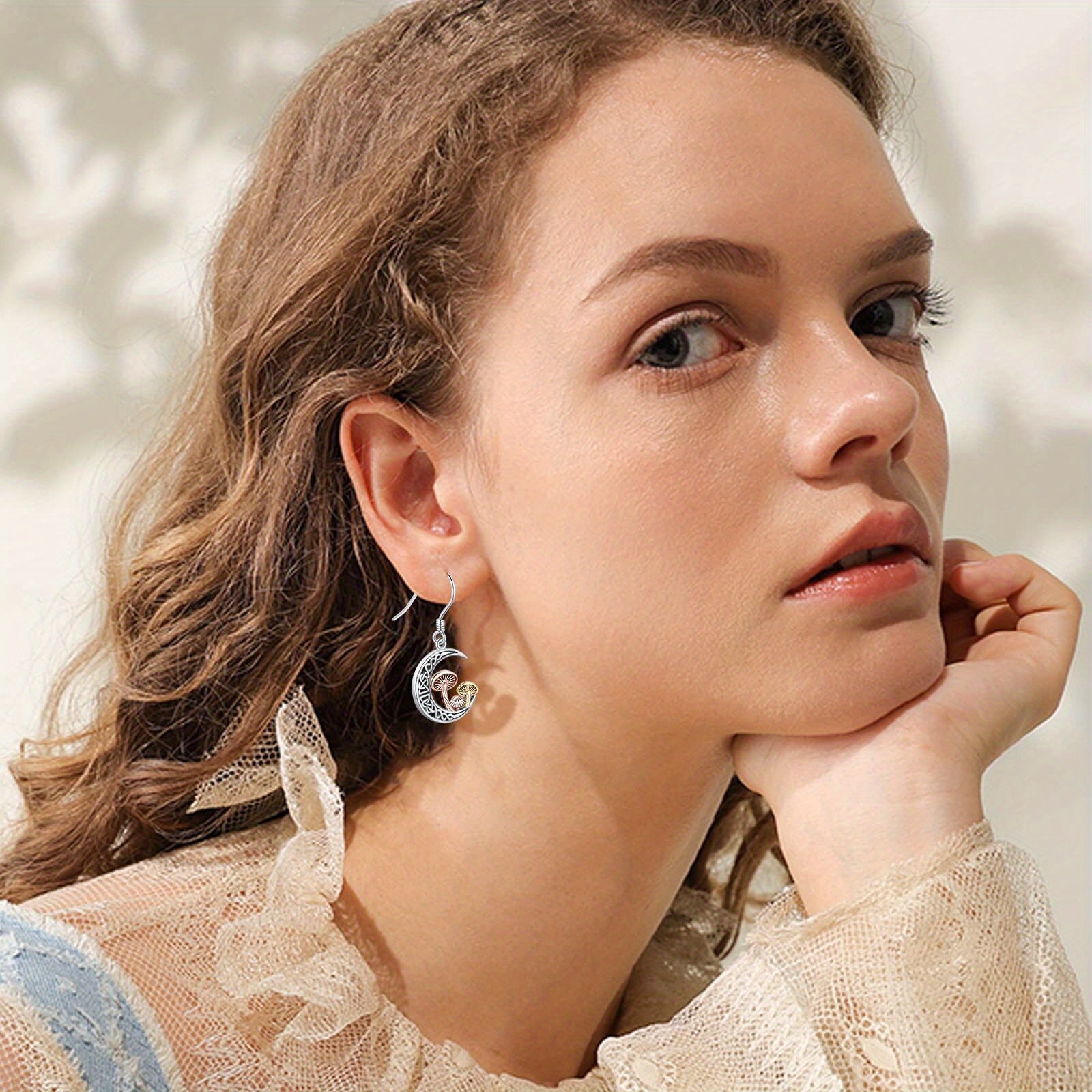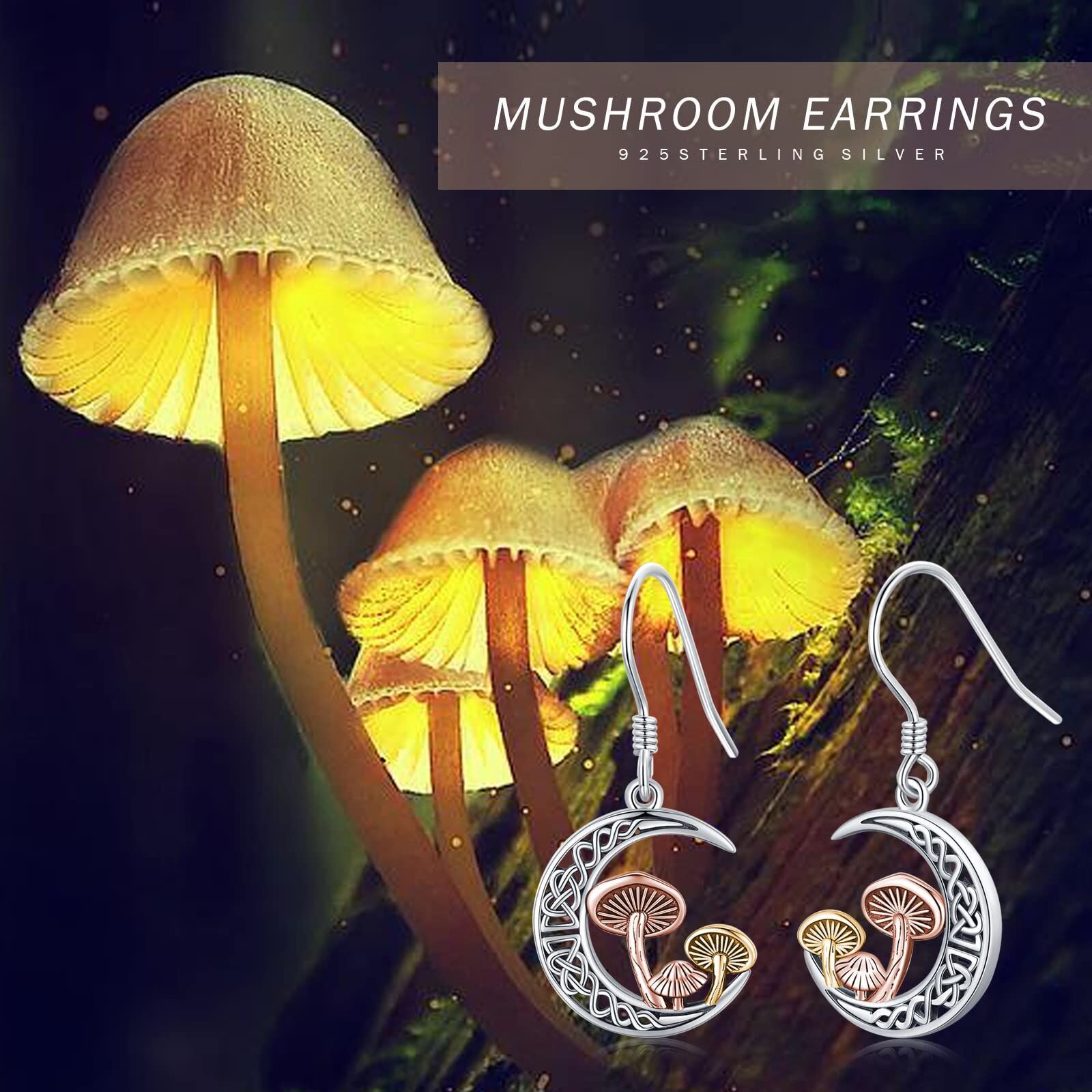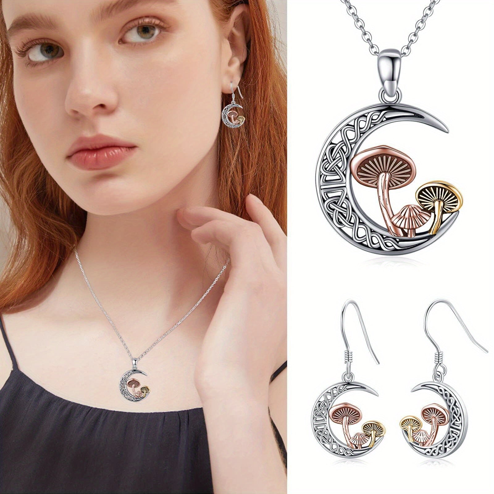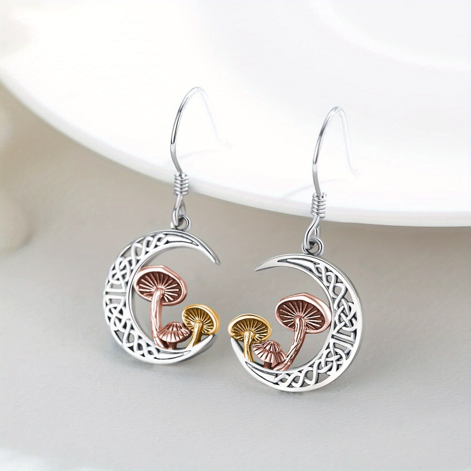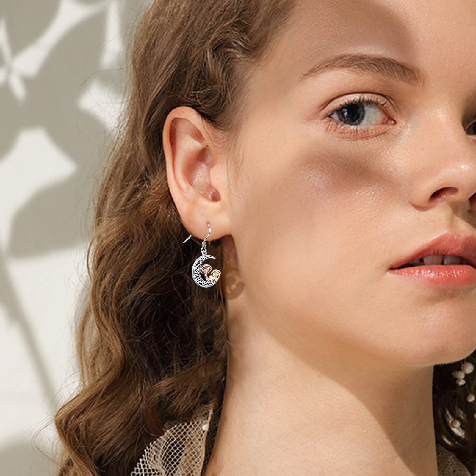 These sterling silver dangle earrings feature a Celtic knot design with a crescent moon and three mushrooms. Perfect for women who love unique jewelry.